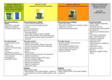 ODPADY ZMIESZANE – pojemniki w kolorze innym niż pojemniki przeznaczone na odpady selektywnie zbierane np. kolor zielony, niebieski ODPADY SUCHE – pojemniki oznaczone kolorem żółtym ODPADY SZKLANE – pojemniki oznaczone kolorem pomarańczowym PUNKT SELEKTYWNEJ ZBIÓRKI ODPADÓW KOMUNALNYCH teren ZUK w DRUŻBICACH Kosz przeznaczony na odpady: - pozostałości z segregacji odpadów komunalnych; - wystudzony popiół i żużel Kosz przeznaczony na odpady: - czyste (opróżnione) opakowania : •z tworzyw sztucznych, butelki typu PET, •z metalu, •po chemii gospodarczej, •po kefirach i jogurtach, - folię opakowaniową, - gazety, papier do pisania, kartony i pudełka, - puszki i folię aluminiową, złom metali kolorowych, - czyste kartoniki po sokach, napojach i produktach mlecznych. Kosz przeznaczony na odpady: - opakowania szklane, - białe i kolorowe butelki min. po napojach, sokach, alkoholach, żywności, - słoiki po dżemach i przetworach Nie wolno wrzucać: - gorącego popiołu i żużlu - gałęzi, - śniegu i lodu, - żarówek, świetlówek, lamp, reflektorów, - baterii, - pojemników po olejach i farbach, środkach chemicznych, - szyb okiennych i samochodowych, - sprzętu RTV i AGD. Nie wolno wrzucać: - odpadów organicznych, - opakowań zawierających substancje organiczne, - tworzyw sztucznych zastosowania medycznego, - podpasek, pieluch tapet, - tekstyliów, odzieży, - popiołu, - szkła, porcelany, - worków po nawozach, sznurków, folii ogrodowej, - odpadów budowlanych, - elementów instalacji wodno-kanalizacyjnej, - żarówek, świetlówek, baterii, - pojemników po olejach i farbach, - opakowań po lekarstwach, - odpadów z samochodów, - sprzętu RTV i AGD. Nie wolno wrzucać: - porcelany, ceramiki, szkła stołowego; - zniczy szklanych; - żarówek, lamp, reflektorów, luster; - szyb okiennych i samochodowych; - ekranów i lamp telewizyjnych; - opakowań po lekach. Pamiętaj: Zanim wrzucisz odpad: - odkręć nakrętkę i usuń resztki produktów z opakowań, - zgnieć opakowanie, a kartony i pudełka papierowe złóż płasko. Pamiętaj: Zanim wrzucisz odpad: - odkręć nakrętkę, kapsel i usuń resztki produktów z opakowań. Przyjmowane będą: - odpady ulegające biodegradacji, - odpady zielone, - przeterminowane leki, - chemikalia (farby, rozpuszczalniki, oleje odpadowe), - opakowania po środkach ochrony roślin, - zużyte baterie i akumulatory, zużyty - sprzęt elektryczny i elektroniczny, świetlówki, - meble i inne odpady wielkogabarytowe, -odpady budowlano–rozbiórkowe, - zużyte opony, - opakowania ze szkła, - opakowania z tworzyw sztucznych, - opakowania z papieru i tektury, - drewno