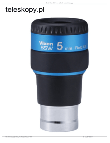 Okular Vixen SSW 5 mm 1,25 cala - oferta teleskopy.pl teleskopy.pl http://teleskopy.pl/product_info.php?products_id=3957 23 July, 2016, 23:44 Okular Vixen SSW 5 mm 1,25 cala - oferta teleskopy.pl Vixen SSW to szerokok±tne okulary astronomiczne o polu widzenia a¿ 83 stopni. Nowoczesne, 7-elementowe konstrukcje optyczne serii Vixen SSW wykonane s± ze szk³a lantanowego oraz innych, egzotycznych gatunków, w celu uzyskania bezb³êdnej korekcji wszelkich wad optycznych w bardzo szerokim polu widzenia. Presti¿owe okulary Vixen SSW s±, w odró¿nieniu od 90% okularów dostêpnych aktualnie na rynku wyprodukowane w Japonii. Ich komputerowo zoptymalizowana konstrukcja optyczna charakteryzuje siê parfokalno¶ci±, sta³ym odstêpem ¼renicy wyj¶ciowej i niezale¿nie od ogniskowej najwy¿szym kontrastem, transmisj± i ostro¶ci±. Pow³oki antyodblaskowe s± indywidualnie dobrane do gatunku szkie³, przez co ich skuteczno¶æ siêga a¿ 99,5%! Optymalizacja projektu optycznego tych okularów zaowocowa³a brakiem winietowania i przyciemnienia obrazu nawet z teleskopami o ¶wiat³osile F/4,0. Okulary te s± znakomit± konkurencj± dla tak legendarnych okularów, jakimi s± okulary Tele Vue Nagler, Vixen LVW lub Pentax XW, gdy¿ ³±cz± w sobie ich zalety i eliminuj± jednocze¶nie wady tych do¶æ ju¿ wiekowych konstrukcji. Okulary SSW wystêpuj± w ogniskowych 3,5 mm, 5 mm, 7 mm, 10 mm, 14 mm. • Ogniskowa: 5 mm • Pole widzenia: 83° • OdlegBo[ zrenicy wyj[ciowej: 13 mm • Liczba elementów optycznych: 7 • Zrednica oprawy: 1,25 cala • Warstwy antyrefleksyjne: MC • Waga: 230 g Gwarancja 2 lata http://teleskopy.pl/product_info.php?products_id=3957 23 July, 2016, 23:44