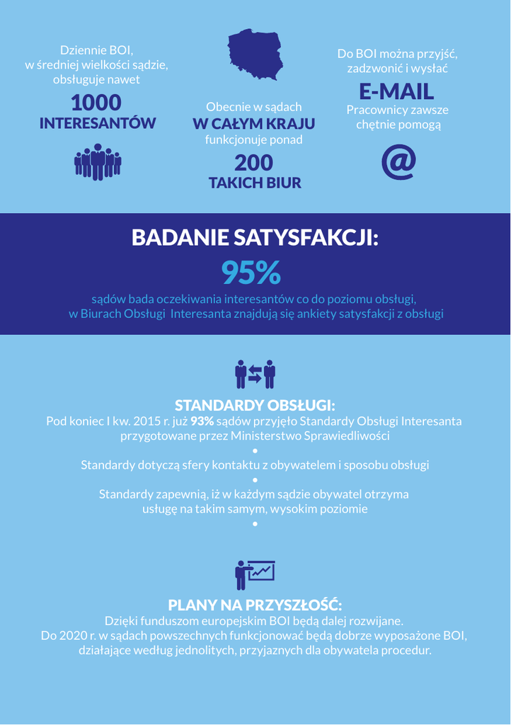 Dziennie BOI, w średniej wielkości sądzie, obsługuje nawet 1000 Do BOI można przyjść, zadzwonić i wysłać Obecnie w sądach INTERESANTÓW W CAŁYM KRAJU E-MAIL Pracownicy zawsze chętnie pomogą funkcjonuje ponad 200 TAKICH BIUR BADANIE SATYSFAKCJI: 95% sądów bada oczekiwania interesantów co do poziomu obsługi, w Biurach Obsługi Interesanta znajdują się ankiety satysfakcji z obsługi STANDARDY OBSŁUGI: Pod koniec I kw. 2015 r. już 93% sądów przyjęło Standardy Obsługi Interesanta przygotowane przez Ministerstwo Sprawiedliwości • Standardy dotyczą sfery kontaktu z obywatelem i sposobu obsługi • Standardy zapewnią, iż w każdym sądzie obywatel otrzyma usługę na takim samym, wysokim poziomie • PLANY NA PRZYSZŁOŚĆ: Dzięki funduszom europejskim BOI będą dalej rozwijane. Do 2020 r. w sądach powszechnych funkcjonować będą dobrze wyposażone BOI, działające według jednolitych, przyjaznych dla obywatela procedur. BIURO OBSŁUGI INTERESANTA W SĄDACH POWSZECHNYCH U DZ I E L A I N F O R M A C J I O B Y WAT E L O M , D O W I E S Z S I Ę W N I M O : • Aktualnym stanie postępowania w Twojej sprawie • Terminach i salach rozpraw • Rodzajach i terminach środków odwoławczych w postępowaniach sądowych • Rodzaju rozpatrywanych w sądzie spraw, podstawowych dokumentach wymaganych do ich wszczęcia • Prawach i obowiązkach stron, świadków, oskarżonego, pokrzywdzonego • Sposobie uzyskania bezpłatnych porad prawnych • Wysokości kosztów sądowych i opłat kancelaryjnych • Możliwości ubiegania się o zwolnienie od kosztów sądowych • Siedzibach i telefonach innych sądów • Adresach i danych innych ważnych dla obywatela instytucji pozasądowych, np. prokuratury