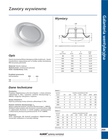 Zawory wywiewne Galanteria wentylacyjna Wymiary d B A d = zagłębienie/średnica wewnętrzna przewodu d nom [mm] Opis Zawór wywiewny KW jest dostępny w kilku średnicach. Zawór standardowo wyposażony jest w krótką ramkę montażową RM (wsuwany pierścień). Materiał: blacha stalowa Wykończenie: emaliowanie piecowe Kolor standardowy: biały Przykład oznaczenia Kod produktu: KW A [mm] B [mm] waga [kg] 80 115 12 0,15 100 137 12 0,19 125 164 12 0,31 150 202 12 0,35 160 212 12 0,47 200 248 12 0,66 250 302 12 0,88 - aaa typ d Dane techniczne Parametry Przepływ objętościowy q (l/s lub m3/godz. ), strata ciśnienia całkowitego P t (Pa), i poziomu ciśnienia akustycznego L A (dB(A)), mogą być odczytane z wykresu. Straty ciśnienia P t Wykresy pokazują stratę ciśnienia całkowitego P t (Pa). Poziom ciśnienia akustycznego, L A Wykres pokazuje poziom ciśnienia akustycznego L A (dB(A)). Wielkość hałasu podano dla tłumienia w pomieszczeniu 4dB, co odpowiada tłumieniu w strefie pogłosu pomieszczenia z chłonnością akustyczną pomieszczenia 10 m2 SABINE. Regulacja Dane regulacyjne dla kontroli przepływu objętościowego muszą być znalezione w instrukcji obsługi. Tabela 1 wymiar [mm] 125 250 średnia częstotliwość (Hz) 500 1000 2000 4000 100 -2 -4 -3 0 -1 -8 -16 125 4 3 1 -1 -3 -12 -22 160 -1 0 1 0 -4 -13 -26 200 0 -5 1 2 -13 -28 -32 tolerancja 3 2 2 2 2 2 3 8000 Tabela 2 wymiar [mm] 63 125 średnia częstotliwość (Hz) 250 500 1000 2000 4000 100 22 16 11 7 5 5 5 7 125 21 14 9 7 4 4 6 8 160 14 13 8 5 4 4 7 7 200 17 10 6 4 3 4 8 4 tolerancja 6 3 2 2 2 2 2 3 8000 269 ALNOR® systemy wentylacji jest prawnie chronionym znakiem i technicznym patentem. Prawo do zmian zastrzeżone. Dane techniczne Wykresy doboru 15 12 3 0 3 12 -9 300 300 -6 -3 0 3 6 9 00 200 100 00 35 50 60 0 30 3 30 0 40 25 30 30 L p10A, dB(A) 20 L p10A, dB(A) 0 100 80 10 2 5 10 10 20 20 40 70 30 40 50 100 0 100 150 200 3 0 0 0 0 30 0 60 0 3 15 300 00 3 0 13 10 5 0 5 10 strata ciśnienia Pt [Pa] 200 00 3 30 0 0 0 30 L p10A, dB(A) 0 100 35 30 50 40 25 30 L p10A, dB(A) 20 125 0 0 0 30 0 0 0 00 150 10 qv [l/s] 5 0 0 0 00 00 300 3 0 10 20 30 0 100 40 50 40 150 200 100 150 qv [l/s] 350 500 qv [m3/h] przepływ [m3/h] p zyc a [mm] p zyc a [mm] 12 300 20 qv [m3/h] przepływ [m3/h] 3 0 3 20 300 15 10 5 0 5 10 15 35 200 200 20 30 strata ciśnienia Pt [Pa] strata ciśnienia Pt [Pa] 0 00 3 p zyc a [mm] 3 0 00 3 300 30 3 350 p zyc a [mm] strata ciśnienia Pt [Pa] Galanteria wentylacyjna Zawory wywiewne 100 35 0 30 50 40 25 30 25 100 L p10A, dB(A) 20 5 40 20 50 0 30 100 40 50 200 100 300 40 30 L p10A, dB(A) 20 160 10 60 50 200 10 140 qv [l/s] 500 qv [m3/h] 5 40 20 50 0 30 100 40 50 60 200 100 300 przepływ [m3/h] przepływ [m3/h] 270 ALNOR® systemy wentylacji jest prawnie chronionym znakiem i technicznym patentem. Prawo do zmian zastrzeżone. 200 500 00 qv [l/s] qv [m3/h]