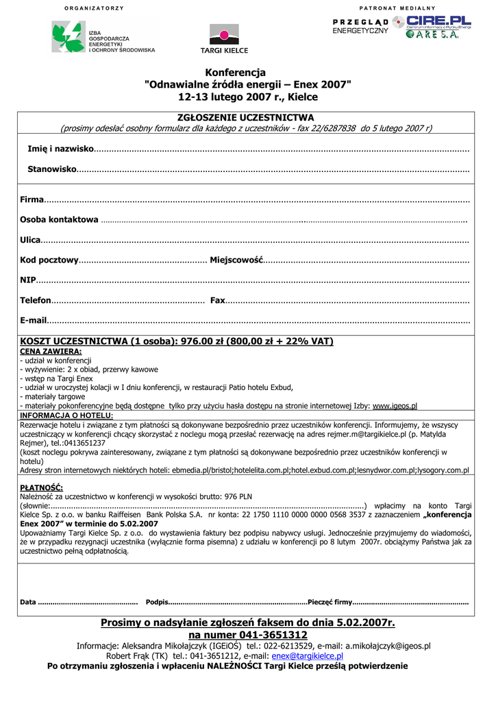 ORGANIZATORZY PATRONAT MEDIALNY Konferencja "Odnawialne źródła energii – Enex 2007" 12-13 lutego 2007 r., Kielce ZGŁOSZENIE UCZESTNICTWA (prosimy odesłać osobny formularz dla kaŜdego z uczestników - fax 22/6287838 do 5 lutego 2007 r) Imię i nazwisko..................................................................................................................................................... Stanowisko............................................................................................................................................................ Firma......................................................................................................................................................................... Osoba kontaktowa ……………………………………………………………………………...…………………………………………………………….. Ulica.......................................................................................................................................................................... Kod pocztowy................................................... Miejscowość.................................................................................. NIP............................................................................................................................................................................ Telefon............................................................. Fax................................................................................................. E-mail........................................................................................................................................................................ KOSZT UCZESTNICTWA (1 osoba): 976.00 zł (800,00 zł + 22% VAT) CENA ZAWIERA: - udział w konferencji - wyŜywienie: 2 x obiad, przerwy kawowe - wstęp na Targi Enex - udział w uroczystej kolacji w I dniu konferencji, w restauracji Patio hotelu Exbud, - materiały targowe - materiały pokonferencyjne będą dostępne tylko przy uŜyciu hasła dostępu na stronie internetowej Izby: www.igeos.pl INFORMACJA O HOTELU: Rezerwacje hotelu i związane z tym płatności są dokonywane bezpośrednio przez uczestników konferencji. Informujemy, Ŝe wszyscy uczestniczący w konferencji chcący skorzystać z noclegu mogą przesłać rezerwację na adres [email protected] (p. Matylda Rejmer), tel.:0413651237 (koszt noclegu pokrywa zainteresowany, związane z tym płatności są dokonywane bezpośrednio przez uczestników konferencji w hotelu) Adresy stron internetowych niektórych hoteli: ebmedia.pl/bristol;hotelelita.com.pl;hotel.exbud.com.pl;lesnydwor.com.pl;lysogory.com.pl PŁATNOŚĆ: NaleŜność za uczestnictwo w konferencji w wysokości brutto: 976 PLN (słownie:..........................................................................................................................................) wpłacimy na konto Targi Kielce Sp. z o.o. w banku Raiffeisen Bank Polska S.A. nr konta: 22 1750 1110 0000 0000 0568 3537 z zaznaczeniem „konferencja Enex 2007” w terminie do 5.02.2007 UpowaŜniamy Targi Kielce Sp. z o.o. do wystawienia faktury bez podpisu nabywcy usługi. Jednocześnie przyjmujemy do wiadomości, Ŝe w przypadku rezygnacji uczestnika (wyłącznie forma pisemna) z udziału w konferencji po 8 lutym 2007r. obciąŜymy Państwa jak za uczestnictwo pełną odpłatnością. Data ................................................ Podpis...................................................................Pieczęć firmy........................................................ Prosimy o nadsyłanie zgłoszeń faksem do dnia 5.02.2007r. na numer 041-3651312 Informacje: Aleksandra Mikołajczyk (IGEiOŚ) tel.: 022-6213529, e-mail: a.mikoł[email protected] Robert Frąk (TK) tel.: 041-3651212, e-mail: [email protected] Po otrzymaniu zgłoszenia i wpłaceniu NALEśNOŚCI Targi Kielce prześlą potwierdzenie