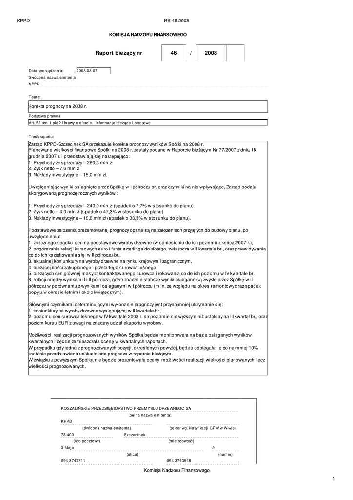 KPPD RB 46 2008 KOMISJA NADZORU FINANSOWEGO Raport bie cy nr 46 / 2008 2008-08-07 Data sporz dzenia: Skrócona nazwa emitenta KPPD Temat Korekta prognozy na 2008 r. Podstawa prawna Art. 56 ust. 1 pkt 2 Ustawy o ofercie - informacje bie Tre ce i okresowe raportu: Zarz d KPPD-Szczecinek SA przekazuje korekt prognozy wyników Spółki na 2008 r. Planowane wielko ci finansowe Spółki na 2008 r. zostały podane w Raporcie bie cym Nr 77/2007 z dnia 18 grudnia 2007 r. i przedstawiaj si nast puj co: 1. Przychody ze sprzeda y – 260,3 mln zł 2. Zysk netto – 7,6 mln zł 3. Nakłady inwestycyjne – 15,0 mln zł. Uwzgl dniaj c wyniki osi gni te przez Spółk w I półroczu br. oraz czynniki na nie wpływaj ce, Zarz d podaje skorygowan prognoz rocznych wyników : 1. Przychody ze sprzeda y – 240,0 mln zł (spadek o 7,7% w stosunku do planu) 2. Zysk netto – 4,0 mln zł (spadek o 47,3% w stosunku do planu) 3. Nakłady inwestycyjne – 10,0 mln zł (spadek o 33,3% w stosunku do planu). Podstawowe zało enia prezentowanej prognozy oparte s na zało eniach przyj tych do budowy planu, po uwzgl dnieniu: 1. znacznego spadku cen na podstawowe wyroby drzewne (w odniesieniu do ich poziomu z ko ca 2007 r.), 2. pogorszenia relacji kursowych euro i funta szterlinga do złotego, zwłaszcza w II kwartale br., oraz przewidywania co do ich kształtowania si w II półroczu br., 3. aktualnej koniunktury na wyroby drzewne na rynku krajowym i zagranicznym, 4. bie cej ilo ci zakupionego i przetartego surowca le nego, 5. bie cych cen głównej masy zakontraktowanego surowca i rokowania co do ich poziomu w IV kwartale br. 6. relacji mi dzy wynikami I i II półrocza, gdzie znacznie słabsze wyniki osi gane s zwykle przez Spółk w II półroczu w porównaniu z wynikami osi ganymi w I półroczu (m.in. ze wzgl du na okres remontowy oraz spadek popytu w okresie letnim i około wi tecznym). Głównymi czynnikami determinuj cymi wykonanie prognozy jest przynajmniej utrzymanie si : 1. koniunktury na wyroby drzewne wyst puj cej w II kwartale br., 2. poziomu cen surowca le nego w IV kwartale 2008 r. na poziomie nie wy szym ni ustalony na III kwartał br., oraz poziom kursu EUR z uwagi na znaczny udział eksportu wyrobów. Mo liwo ci realizacji prognozowanych wyników Spółka b dzie monitorowała na bazie osi ganych wyników kwartalnych i b dzie zamieszczała ocen w kwartalnych raportach. W przypadku gdy jedna z prognozowanych pozycji, okre lonych powy ej, b dzie odbiegała o co najmniej 10% zostanie przedstawiona uaktualniona prognoza w raporcie bie cym. W zwi zku z powy szym Spółka nie b dzie prezentowała oceny mo liwo ci realizacji wielko ci planowanych, lecz wielko ci prognozowanych. KOSZALI SKIE PRZEDSI BIORSTWO PRZEMYSLU DRZEWNEGO SA (pełna nazwa emitenta) KPPD (skróc ona nazwa emitenta) 78-400 (sektor wg. klasyfikacji GPW w W-wie) Szc zec inek (kod pocztowy) (miejscowo ) 3 Maja 2 (ulica) 094 3742711 (numer) 094 3743548 Komisja Nadzoru Finansowego 1 KPPD RB 46 2008 (telefon) (fax) [email protected] www.kppd.pl (e-mail) (www) 6730006231 330348087 (NIP) (REGON) PODPISY OSÓB REPREZENTUJ CYCH SPÓŁK Data Imi i Nazwisko Stanowisko/Funkc ja 2008-08-07 Marek Szumowicz-Włodarc zyk Prezes Zarz du 2008-08-07 Zenon Wnuk Wiceprezes Zarz du Podpis Komisja Nadzoru Finansowego 2