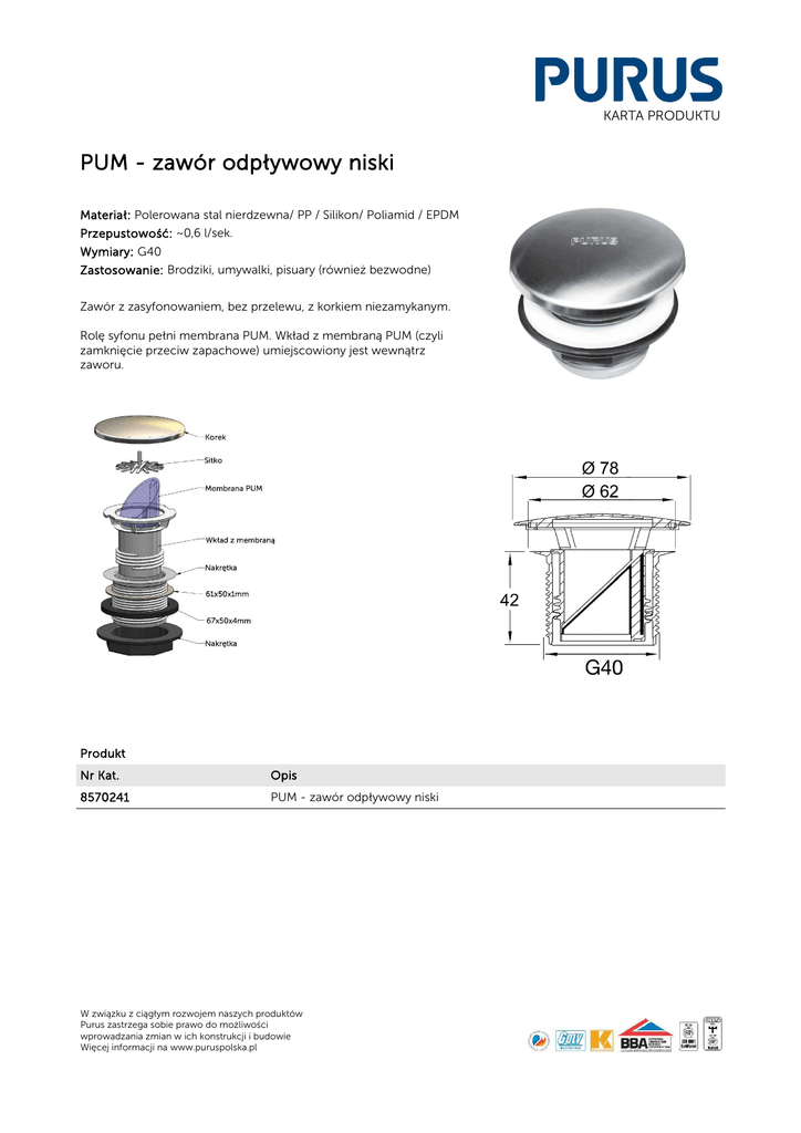 KARTA PRODUKTU PUM - zawór odpływowy niski Materiał: Polerowana stal nierdzewna/ PP / Silikon/ Poliamid / EPDM Przepustowość: ~0,6 l/sek. Wymiary: G40 Zastosowanie: Brodziki, umywalki, pisuary (również bezwodne) Zawór z zasyfonowaniem, bez przelewu, z korkiem niezamykanym. Rolę syfonu pełni membrana PUM. Wkład z membraną PUM (czyli zamknięcie przeciw zapachowe) umiejscowiony jest wewnątrz zaworu. Produkt Nr Kat. Opis 8570241 PUM - zawór odpływowy niski W związku z ciągłym rozwojem naszych produktów Purus zastrzega sobie prawo do możliwości wprowadzania zmian w ich konstrukcji i budowie Więcej informacji na www.puruspolska.pl