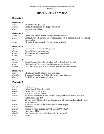 Egzamin w klasie trzeciej gimnazjum z języka niemieckiego A8 kwiecień 2011 TRANSKRYPCJA NAGRAŃ Zadanie 1. Rozmowa 1. Frau: Du kochst sehr gut, Kurt. Mann: Danke. Schmeckt dir die Suppe wirklich? Frau: Ja, sie ist sehr lecker. Rozmowa 2. Mann: Gute Reise, Marie. Wann kommst du denn zurück? Frau: Danke, Peter! Ich komme am Freitag zurück. Aber du kannst doch schon nach Hause gehen. Mann: Oh, nein. Ich warte noch. Der Zug fährt gleich ab. Rozmowa 3. Paul: Petra: Paul: Petra: Hör mal, das ist mein Lieblingssong. Der gefällt mir auch sehr gut. Möchtest du mit mir tanzen? Ja, gerne. Rozmowa 4. Mutter: Guten Morgen, Peter. Es ist schon halb sieben. Steh bitte auf. Peter: Oh, Mutti, darf ich noch zehn Minuten im Bett bleiben? Mutter: OK., aber zieh dich dann schnell an und komm zum Frühstück. Rozmowa 5. Otto: Claudia, ist das Hotel noch weit von hier? Claudia: Schau mal, hier ist ein Schild. Nur noch einen Kilometer. Otto: Endlich! Ich bin schon total müde. Zadanie 2. David: Lena: David: Lena: David: Lena: David: Lena: David: Lena: David: Lena: Hallo, Lena! Hallo, David. Wie geht es dir? Danke, es geht mir gut. Was liest du denn, David? Ein neues Buch über Afrika. Ich lese sehr gern Bücher über Afrika und Südamerika. Und du? Ich mag auch Bücher, aber am liebsten lese ich Gedichte. Ich schreibe auch selbst Gedichte. Wirklich? Kannst du mir deine Gedichte mal zeigen? Natürlich. Können wir uns morgen im Club „Elefant“ treffen? Gern. Um 18 Uhr? Gut. Bring, bitte, deine Gedichte mit. Bis morgen! Tschüs! Egzamin w klasie trzeciej gimnazjum z języka niemieckiego A8 kwiecień 2011 Zadanie 3. Thomas: Sonja: Thomas: Sonja: Das Pferd ist sehr schön. Magst du Pferde? Nicht nur Pferde. Ich mag auch meinen Hund und meinen Hamster. Die beiden sind so süß. Spielst du oft mit deinem Hund? Ja, jeden Tag. Immer nach dem Gitarrekurs gehe ich mit ihm auf den Sportplatz. Zadanie 4. Pytanie 1. Welche Schule besuchst du? Pytanie 2. Wo wohnt deine Oma? Pytanie 3. Ist deine Schwester Schülerin? Pytanie 4. Wie alt bist du? Pytanie 5. Wann gehst du ins Kino?
