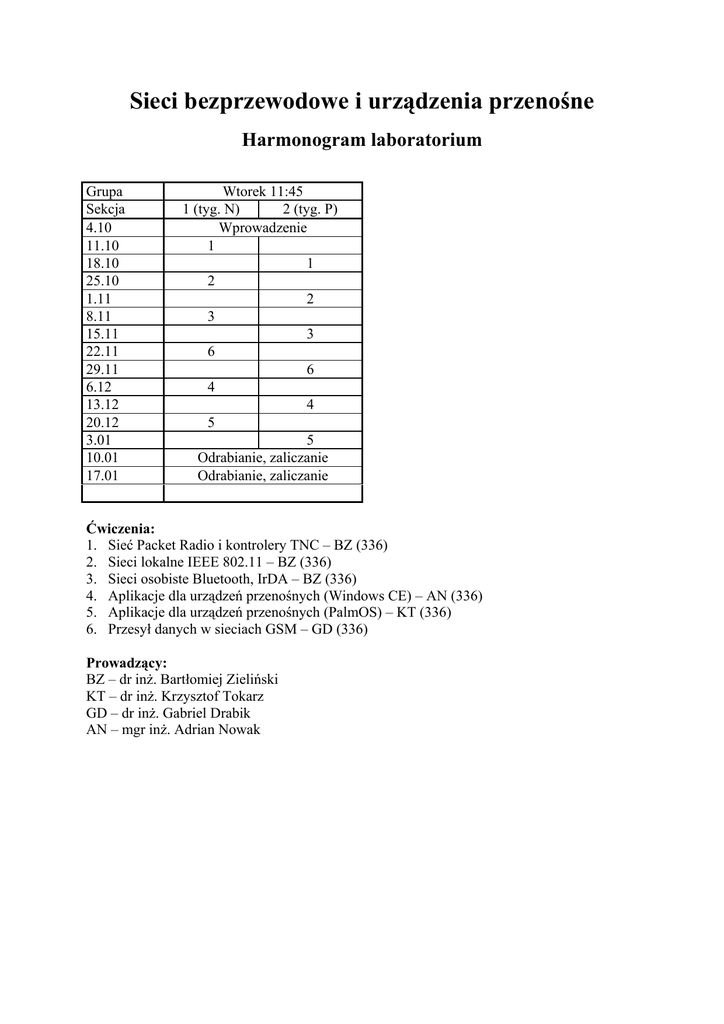 Sieci bezprzewodowe i urządzenia przenośne Harmonogram laboratorium Grupa Sekcja 4.10 11.10 18.10 25.10 1.11 8.11 15.11 22.11 29.11 6.12 13.12 20.12 3.01 10.01 17.01 Wtorek 11:45 1 (tyg. N) 2 (tyg. P) Wprowadzenie 1 1 2 2 3 3 6 6 4 4 5 5 Odrabianie, zaliczanie Odrabianie, zaliczanie Ćwiczenia: 1. Sieć Packet Radio i kontrolery TNC – BZ (336) 2. Sieci lokalne IEEE 802.11 – BZ (336) 3. Sieci osobiste Bluetooth, IrDA – BZ (336) 4. Aplikacje dla urządzeń przenośnych (Windows CE) – AN (336) 5. Aplikacje dla urządzeń przenośnych (PalmOS) – KT (336) 6. Przesył danych w sieciach GSM – GD (336) Prowadzący: BZ – dr inż. Bartłomiej Zieliński KT – dr inż. Krzysztof Tokarz GD – dr inż. Gabriel Drabik AN – mgr inż. Adrian Nowak Bezprzewodowe sieci komputerowe Harmonogram laboratorium Grupa Sekcja 7.10 14.10 Piątek (N) 1: 12:45 2: 15:45 1 1 28.10 2 2 11.11 3 3 25.11 4 4 9.12 6 6 6.01 20.01 Trzech Króli 5 5 Ćwiczenia: 1. Sieć Packet Radio i kontrolery TNC – BZ (336) 2. Sieci lokalne IEEE 802.11 – BZ (336) 3. Sieci osobiste Bluetooth, IrDA – BZ (336) 4. Układy radiowe małej mocy – RO (336) 5. GPS – GD (320) 6. Przesył danych w sieciach GSM – GD (320) Prowadzący: BZ – dr inż. Bartłomiej Zieliński KT – dr inż. Krzysztof Tokarz GD – dr inż. Gabriel Drabik RO – mg inż. Rafał Oziębło Wireless computer networks Laboratory schedule Grupa Sekcja 28.11 5.12 12.12 19.12 2.01 9.01 16.01 Monday (2nd half of semestr) 1: 8:15 2: 10:00 1 1 2 2 3 3 4 4 6 6 5 5 Excercise: 1. Packet Radio network and TNC controllers – BZ (336) 2. IEEE 802.11 WLANs – BZ (336) 3. Bluetooth, IrDA WPANs – BZ (336) 4. Low power radio circuits – KT (336) 5. GPS – KT (336) 6. GSM data transfer – AN (336) Teachers: BZ – dr inż. Bartłomiej Zieliński KT – dr inż. Krzysztof Tokarz AN – mgr inż. Adrian Nowak