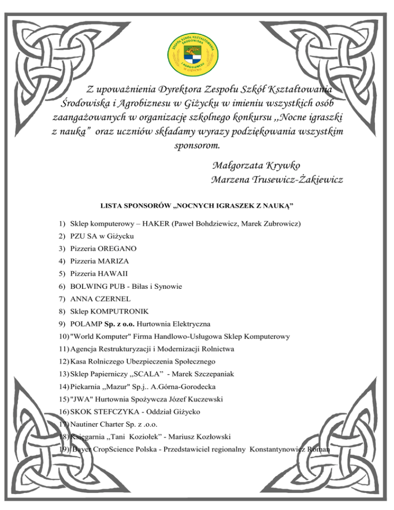 Z upoważnienia Dyrektora Zespołu Szkół Kształtowania Środowiska i Agrobiznesu w Giżycku w imieniu wszystkich osób zaangażowanych w organizację szkolnego konkursu ,,Nocne igraszki z nauką” oraz uczniów składamy wyrazy podziękowania wszystkim sponsorom. Małgorzata Krywko Marzena Trusewicz-Żakiewicz LISTA SPONSORÓW ,,NOCNYCH IGRASZEK Z NAUKĄ” 1) Sklep komputerowy – HAKER (Paweł Bohdziewicz, Marek Zubrowicz) 2) PZU SA w Giżycku 3) Pizzeria OREGANO 4) Pizzeria MARIZA 5) Pizzeria HAWAII 6) BOLWING PUB - Biłas i Synowie 7) ANNA CZERNEL 8) Sklep KOMPUTRONIK 9) POLAMP Sp. z o.o. Hurtownia Elektryczna 10) "World Komputer" Firma Handlowo-Usługowa Sklep Komputerowy 11) Agencja Restrukturyzacji i Modernizacji Rolnictwa 12) Kasa Rolniczego Ubezpieczenia Społecznego 13) Sklep Papierniczy ,,SCALA” - Marek Szczepaniak 14) Piekarnia ,,Mazur" Sp.j.. A.Górna-Gorodecka 15) "JWA" Hurtownia Spożywcza Józef Kuczewski 16) SKOK STEFCZYKA - Oddział Giżycko 17) Nautiner Charter Sp. z .o.o. 18) Księgarnia ,,Tani Koziołek” - Mariusz Kozłowski 19) Bayer CropScience Polska - Przedstawiciel regionalny Konstantynowicz Roman
