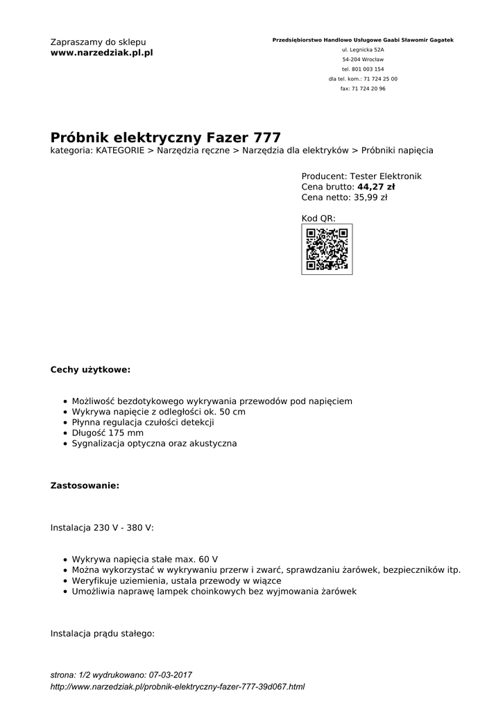 Zapraszamy do sklepu www.narzedziak.pl.pl Przedsiębiorstwo Handlowo Usługowe Gaabi Sławomir Gagatek ul. Legnicka 52A 54-204 Wrocław tel. 801 003 154 dla tel. kom.: 71 724 25 00 fax: 71 724 20 96 Próbnik elektryczny Fazer 777 kategoria: KATEGORIE > Narzędzia ręczne > Narzędzia dla elektryków > Próbniki napięcia Producent: Tester Elektronik Cena brutto: 44,27 zł Cena netto: 35,99 zł Kod QR: Cechy użytkowe: Możliwość bezdotykowego wykrywania przewodów pod napięciem Wykrywa napięcie z odległości ok. 50 cm Płynna regulacja czułości detekcji Długość 175 mm Sygnalizacja optyczna oraz akustyczna Zastosowanie: Instalacja 230 V - 380 V: Wykrywa napięcia stałe max. 60 V Można wykorzystać w wykrywaniu przerw i zwarć, sprawdzaniu żarówek, bezpieczników itp. Weryfikuje uziemienia, ustala przewody w wiązce Umożliwia naprawę lampek choinkowych bez wyjmowania żarówek Instalacja prądu stałego: strona: 1/2 wydrukowano: 07-03-2017 http://www.narzedziak.pl/probnik-elektryczny-fazer-777-39d067.html Wykrywanie napięcia stałego, przerw oraz zwarcia Identyfikuje bieguny +/Kontrola wtyku zasilacza Testy telefoniczne Urządzenia elektryczne: Test sprawny, czy nie sprawny Szukanie miejsca uszkodzenia w urządzeniu Elektronika: Wykrywanie 0/1 w układach elektronicznych Podstawowe testy elementów elektronicznych: diody, tranzystory, rezystory, kondensatory (poza elektrolitami) Samochody: Wykrywanie +12V/masy, Kontrola żarówek, bezpieczników itp. Ustawianie zapłonu Wykrywanie wysokiego napięcia strona: 2/2 wydrukowano: 07-03-2017 http://www.narzedziak.pl/probnik-elektryczny-fazer-777-39d067.html