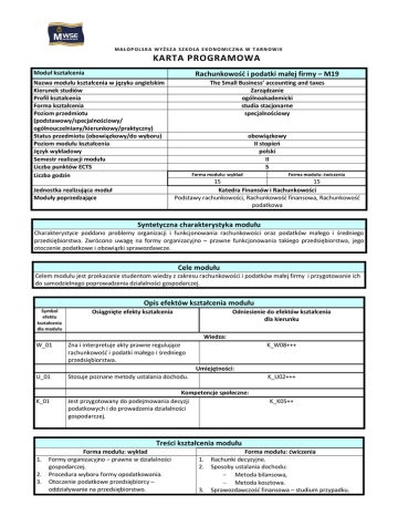 MAŁOP OLSKA WYŻSZ A SZ KOŁA E KONOMICZNA W TARN OW IE KARTA PROGRAMOWA Moduł kształcenia Rachunkowość i podatki małej firmy – M19 Nazwa modułu kształcenia w języku angielskim Kierunek studiów Profil kształcenia Forma kształcenia Poziom przedmiotu (podstawowy/specjalnościowy/ ogólnouczelniany/kierunkowy/praktyczny) Status przedmiotu (obowiązkowy/do wyboru) Poziom modułu kształcenia Język wykładowy Semestr realizacji modułu Liczba punktów ECTS Liczba godzin The Small Business’ accounting and taxes Zarządzanie ogólnoakademicki studia stacjonarne specjalnościowy obowiązkowy II stopień polski II 5 Forma modułu: wykład Forma modułu: ćwiczenia 15 15 Katedra Finansów i Rachunkowości Podstawy rachunkowości, Rachunkowość finansowa, Rachunkowość podatkowa Jednostka realizująca moduł Moduły poprzedzające Syntetyczna charakterystyka modułu Charakterystyce poddano problemy organizacji i funkcjonowania rachunkowości oraz podatków małego i średniego przedsiębiorstwa. Zwrócono uwagę na formy organizacyjno – prawne funkcjonowania takiego przedsiębiorstwa, jego otoczenie podatkowe i obowiązki sprawozdawcze. Cele modułu Celem modułu jest przekazanie studentom wiedzy z zakresu rachunkowości i podatków małej firmy i przygotowanie ich do samodzielnego poprowadzenia działalności gospodarczej. Opis efektów kształcenia modułu Symbol efektu kształcenia dla modułu Osiągnięte efekty kształcenia Odniesienie do efektów kształcenia dla kierunku Wiedza: W_01 Zna i interpretuje akty prawne regulujące rachunkowość i podatki małego i średniego przedsiębiorstwa. U_01 Stosuje poznane metody ustalania dochodu. K_W08+++ Umiejętności: K_01 K_U02+++ Kompetencje społeczne: Jest przygotowany do podejmowania decyzji podatkowych i do prowadzenia działalności gospodarczej. K_K05++ Treści kształcenia modułu 1. 2. 3. Forma modułu: wykład Formy organizacyjno – prawne w działalności gospodarczej. Procedura wyboru formy opodatkowania. Otoczenie podatkowe przedsiębiorcy – oddziaływanie na przedsiębiorstwo. 1. 2. 3. Forma modułu: ćwiczenia Rachunki decyzyjne. Sposoby ustalania dochodu: Metoda bilansowa, Metoda kosztowa. Sprawozdawczość finansowa – studium przypadku. 4. 5. 6. Rachunkowość jako system informatyczny małych i średnich przedsiębiorstw. Sprawozdawczość finansowa. Strategie podatkowe – charakterystyka. Literatura podstawowa 1. 2. 3. 4. Literatura uzupełniająca 1. 2. 4. Strategie podatkowe – studium przypadku. Ustawa o rachunkowości z dnia 29 września 1994 roku (Dz. U. z 2013, poz. 330); Ustawy podatkowe (Ustawa o podatku dochodowym od osób fizycznych, ustawa o podatku dochodowym od osób prawnych, Ordynacja podatkowa, Ustawa o podatku od towarów i usług); Jaworski J., Informacja finansowa w zarządzaniu małym przedsiębiorstwie, Wyd. Wyższej Szkoły Bankowej, Gdańsk 2012; Voss G., Tokarski A., Tokarski M., Księgowość w małej i średniej firmie, Wyd. CeDeWu, Warszawa 2008; Poszwa M., Zarządzanie podatkami w małej i średniej firmie, Wyd. C.H. Beck, Warszawa 2007; Barrow C., Zarządzanie finansami w małej firmie, Wyd. Helion, Gliwice 2005; Metody dydaktyczne Wykład teoretyczny wspomagany narzędziami audiowizualnymi, ilustrowany materiałami dydaktycznymi. Ćwiczenia prowadzone są na bazie aktualnego studium przypadku.