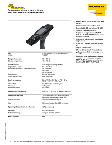 Programator ręczny z baterią litową PD-IDENT-UHF-S2D-RWBTA-865-868 ■ Mobile reading and writing of RFID data carriers ■ Programator ręczny z anteną UHF ■ Skaner kodów 2D (czyta kody 1D i 2D) ■ Windows Embedded CE 6.0 ■ Dołączone oprogramowanie TURCK RFID TA-HF (DE/EN/ES/FR/IT) do odczytu i zapisu danych ■ Na życzenie indywidualne rozwiązanie programowe ■ WLAN 802.11a/b/g/n i interfejs Bluetooth ■ Stopień ochrony IP65 PD-IDENT-UHF-S2D-RWBTA-865-868 7030637 Temperatura pracy Storage temperature -20…+50 °C -40…+60 °C Dane transferu Częstotliwość pracy Komunikacja radiowa i standard protokołu Output power Antenna polarization alternating electromagnetic field 865…868 MHz ISO 18000-6C EN 302208 EPCglobal Gen 2 500mW, ustawialne linear horizontal Cechy urządzenia Memory Wyświetlacz Klawiatura Pojemność baterii Sitara AM37x ARM Cortex-A8, 1 GHz 4GB Flash ROM; 512MB RAM 3.7'', 640 x 480, Ekran dotykowy 55 Przyciski 4400 mAh Komunikacja za pomocą Bluetooth V2.0+EDR, WLAN 802.11a/b/g/n Software w zestawie Operating system Oprogramowanie Turck RFID, Możliwość ściągnięcia darmowego zestawu SDK Windows Embedded CE 6.0 Kod 2D Imager (reads 1D and 2D barcodes) Sposób podłączenia stacji dokującej USB (szeregowe) Wymiary Materiał obudowy 260x 100x 190mm tworzywo sztuczne, czarny Klasa ochrony IP65 ■ Dołączony uchwyt pistoletowy, bateria PD-IDENT-TA-4400, stacja dokująca PDIDENT-TA-DOCK z adapterem i przewodem USB, PD-IDENT-TA-STYLUS Edition • 2016-09-30T23:11:05+02:00 Typ Nr kat. ■ Odporność na wielokrotne upadki na gładką powierzchnię betonową z wysokości 1,5 m 1/2 Hans Turck GmbH & Co.KG ñ D-45472 Mülheim an der Ruhr ñ Witzlebenstraße 7 ñ Tel. 0208 4952-0 ñ Fax 0208 4952-264 ñ [email protected] ñ www.turck.com Programator ręczny z baterią litową PD-IDENT-UHF-S2D-RWBTA-865-868 Akcesoria montażowe Nr kat. PD-IDENT-TA-4400 PD-IDENT-TA-RS232 7030518 7030554 PD-IDENT-TA-STYLUS PD-IDENT-TA-POWERSUPPLY PD-IDENT-TA-DOCK PD-IDENT-TA-DOCK-ETHERNET 7030550 7030597 Zamienna bateria 4400 mAh Przewód adaptera RS232 do bezpośredniego podłączenia programatorów ręcznych TA z urządzeniami z interfejsem RS-232 (np. PLC, PC) zamienne pisaki (25 szt.) Jednostka zasilająca Rysunek wymiarowy 7030596 7030595 Stacja bazowa, zawiera zasilacz Adapter Ethernet dla stacji bazowych Edition • 2016-09-30T23:11:05+02:00 Typ 2/2 Hans Turck GmbH & Co.KG ñ D-45472 Mülheim an der Ruhr ñ Witzlebenstraße 7 ñ Tel. 0208 4952-0 ñ Fax 0208 4952-264 ñ [email protected] ñ www.turck.com