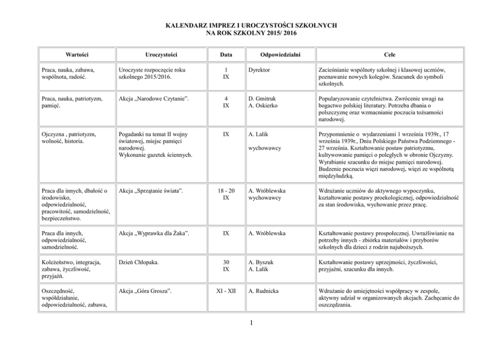 KALENDARZ IMPREZ I UROCZYSTOŚCI SZKOLNYCH NA ROK SZKOLNY 2015/ 2016 Wartości Uroczystości Data Odpowiedzialni Cele Praca, nauka, zabawa, wspólnota, radość. Uroczyste rozpoczęcie roku szkolnego 2015/2016. 1 IX Dyrektor Zacieśnianie wspólnoty szkolnej i klasowej uczniów, poznawanie nowych kolegów. Szacunek do symboli szkolnych. Praca, nauka, patriotyzm, pamięć. Akcja „Narodowe Czytanie”. 4 IX D. Gmitruk A. Oskierko Popularyzowanie czytelnictwa. Zwrócenie uwagi na bogactwo polskiej literatury. Potrzeba dbania o polszczyznę oraz wzmacnianie poczucia tożsamości narodowej. Ojczyzna , patriotyzm, wolność, historia. Pogadanki na temat II wojny światowej, miejsc pamięci narodowej. Wykonanie gazetek ściennych. IX A. Lalik Przypomnienie o wydarzeniami 1 września 1939r., 17 września 1939r., Dniu Polskiego Państwa Podziemnego 27 września. Kształtowanie postaw patriotyzmu, kultywowanie pamięci o poległych w obronie Ojczyzny. Wyrabianie szacunku do miejsc pamięci narodowej. Budzenie poczucia więzi narodowej, więzi ze wspólnotą międzyludzką. Praca dla innych, dbałość o środowisko, odpowiedzialność, pracowitość, samodzielność, bezpieczeństwo. Akcja „Sprzątanie świata”. Praca dla innych, odpowiedzialność, samodzielność. wychowawcy 18 - 20 IX A. Wróblewska wychowawcy Wdrażanie uczniów do aktywnego wypoczynku, kształtowanie postawy proekologicznej, odpowiedzialność za stan środowiska, wychowanie przez pracę. Akcja „Wyprawka dla Żaka”. IX A. Wróblewska Kształtowanie postawy prospołecznej. Uwrażliwianie na potrzeby innych - zbiórka materiałów i przyborów szkolnych dla dzieci z rodzin najuboższych. Koleżeństwo, integracja, zabawa, życzliwość, przyjaźń. Dzień Chłopaka. 30 IX A. Byszuk A. Lalik Kształtowanie postawy uprzejmości, życzliwości, przyjaźni, szacunku dla innych. Oszczędność, współdziałanie, odpowiedzialność, zabawa, Akcja „Góra Grosza”. A. Rudnicka Wdrażanie do umiejętności współpracy w zespole, aktywny udział w organizowanych akcjach. Zachęcanie do oszczędzania. XI - XII 1 samodzielność. Honor, szacunek, pamięć, patriotyzm, religia. Rocznica wyboru Karola Wojtyły na Stolicę Piotrową – pogadanki, gazetki. Dzień Komisji Edukacji Narodowej. 16 X A. Oskierko B. Worobij Ukazanie roli i znaczenia Pontyfikatu Jana Pawła II. Przypomnienie sylwetki Papieża Polaka. Budzenie szacunku do pracy nauczyciela. Docenianie roli nauki w życiu człowieka. Właściwy szacunek do wszystkich pracowników szkoły. Zabawa, integracja, rywalizacja, współdziałanie, tradycja. Święto Pieczonego Ziemniaka "Smaki z dawnych lat" IX A. Lalik A. Byszuk Zapoznanie z obrzędami i zwyczajami związanymi ze świętem ziemniaka. Umiejętność kulturalnej zabawy. Wychowanie poprzez zabawę. Współpraca ze społecznością lokalną. Zachęcanie do aktywności społecznej. Wspólnota, odpowiedzialność, współdziałanie, zabawa. Ślubowanie klasy I X - XI D. Krajewska A. Byszuk Właściwe zachowanie się podczas uroczystości. Przyjęcie do szeregu braci uczniowskiej. Poznanie tradycji i zwyczajów szkolnych. Włączenie uczniów do SKO i Klubu Wiewiórka. Tradycja, pamięć, szacunek, wiara, wrażliwość. Święto Zmarłych. 28 - 31 X D. Gmitruk Uczczenie pamięci zmarłych, złożenie hołdu poległym, odpowiednie zachowanie się na cmentarzu. Porządkowanie grobów żołnierskich. Ojczyzna, naród, niepodległość, wolność, patriotyzm. 11- listopada Odzyskanie Niepodległości - program artystyczny. 10 XI A. Lalik Szacunek do symboli szkolnych i narodowych. Budzenie poczucia przynależności narodowej. Szacunek i pamięć o tych, co odeszli walcząc za Ojczyznę. Obrzędy, tradycja, zabawa, uprzejmość, życzliwość. Andrzejki 26 XI B. Worobij Zapoznanie z obrzędami i zwyczajami andrzejkowymi. Umiejętność kulturalnej zabawy. Obrzędy, tradycja, bezinteresowność, dobroć. Mikołajki 4 XII E. Chrząstek Zapoznanie z legendami i zwyczajami związanymi z postacią św. Mikołaja. Kształtowanie postaw dobroci dla innych. Umiejętność dzielenia się z innymi. Życie rodzinne, religijność, kościół, dom, tolerancja, troska, dobroć, tradycja, integracja. Święta Bożego Narodzenia, Wigilia. Jasełka 21 XII Ks. M. Padun Poznanie tradycji Świąt Bożego Narodzenia w naszym regionie i na świecie. Rozumienie symboliki Świąt Bożego Narodzenia. Okazywanie przyjaźni i miłości najbliższym. Umiejętność dzielenia się z innymi. Szacunek, uznanie serdeczność, życzliwość. A. Rudnicka A. Oskierko 2 Tradycja, pomoc, szacunek, dobroć. Akcja „Ogień Betlejemski”. 24 XII A. Byszuk B. Worobij Umiejętność niesienia innym dobra. Właściwe zachowanie się w grupie. Zrozumienie, chęć niesienia pomocy innym, dobroć. Akcja „Gwiazdka Czerwonokrzyska”. XII A.Wróblewska Niesienie pomocy najbardziej potrzebującym. Zabawa, integracja, dobre obyczaje, koleżeństwo, umiejętność bycia ze sobą. Zabawa choinkowa. Przygotowanie programu artystycznego. 13 II B. Worobij A. Byszuk Wychowanie przez zabawę. Kształtowanie właściwego zachowania przy stole. Wdrażanie do kulturalnej, wesołej zabawy. E. Chrząstek Więzi rodzinne, szacunek, szczęście, uprzejmość. Dzień Babci i Dziadka – program artystyczny. Miłość, przyjaźń, ofiarność, zabawa. Walentynki. Uznanie, szacunek, integracja, szczerość. Dzień Kobiet. Bezpieczeństwo, zabawa, nauka, rywalizacja, obrzędy, tradycje, zwyczaje, integracja. Pierwszy Dzień Wiosny Wiara, religia, kościół, życie rodzinne, tolerancja. I A.Oskierko D. Krajewska Kształtowanie poczucia przywiązania i szacunku. Wzmacnianie więzi emocjonalnej z pokoleniem ludzi starszych, okazywanie im miłości. A. Lalik A. Byszuk Okazywanie przyjaźni innym, umiejętność okazywania uczuć. Tolerancja i akceptacja kolegów. 8 III A. Wróblewska Rola kobiety we współczesnym świecie. Uznanie i szacunek dla kobiet. Kształtowanie postawy uprzejmo