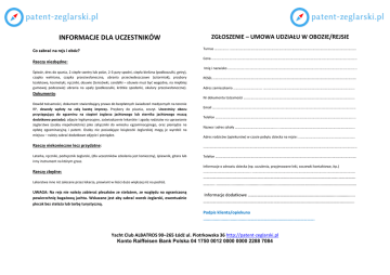 INFORMACJE DLA UCZESTNIKÓW ZGŁOSZENIE – UMOWA UDZIAŁU W OBOZIE/REJSIE Turnus …………….. ……………………………………………………….………………………………………………………………………… Co zabrać na rejs i obóz? Cena …………………………..………………………………………………………………………………………….…….………………………. Rzeczy niezbędne: Imię i nazwisko ………………...……………….………………………………………………………….…………………………………….. Śpiwór, dres do spania, 2 ciepłe swetry lub polar, 2-3 pary spodni, ciepła bielizna (podkoszulki, getry), czapka wełniana, czapka przeciwsłoneczna, ubrania przeciwdeszczowe (sztormiak), przybory toaletowe, kosmetyki, ręczniki, obuwie (tenisówki, sandałki – obuwie musi być wygodne, na miękkiej gumowej podeszwie) ubrania na upały (podkoszulki, krótkie spodenki, okulary przeciwsłoneczne). Dokumenty: PESEL ………………………………………………………………………………………………………….…………………………….…………. Adres zamieszkania ……………………………. …………………………………………………………………………………………….. Nr dokumentu tożsamości ………………………………………………………….……………………………………………………... Dowód tożsamości, dokument stwierdzający prawo do bezpłatnych świadczeń medycznych na terenie RP, dowody wpłaty na całą kwotę imprezy. Przybory do pisania, zeszyt. Uczestnicy obozu przystępujący do egzaminu na stopień żeglarza jachtowego lub sternika jachtowego muszą dodatkowo posiadać: zdjęcie legitymacyjne, zaświadczenie lekarskie i zgodę rodziców na uprawianie żeglarstwa (osoby niepełnoletnie) jako załączniki do wniosku egzaminacyjnego, oraz pieniądze na opłatę egzaminacyjną i patent. Osoby nie posiadające książeczki żeglarskiej mogą je wyrobić na miejscu – należy zabrać dodatkowe zdjęcie i pieniądze. Email …………………………………………………………………………..………………………………….…………………………………… Telefon ………………………………………………………………..…………………………………………………….……………………..... Nazwa i adres szkoły ………………………………………..... …………………………………………………………………………….. Adres rodziców (opiekunów) w czasie pobytu dziecka na rejsie: …..……………………………..…………………….. Rzeczy niekonieczne lecz przydatne: ……………………………………………………………………………………………………………………………………….…………………….. Latarka, ręczniki, podręcznik żeglarski, (dla uczestników szkolenia jest konieczny), śpiewnik, gitara lub inny instrument na którym grasz. Telefon ………………………………………………………………………………………………………………………..………………………. Informacje o zdrowiu dziecka (np. uczulenia, przyjmowane leki, soczewki kontaktowe, itp.) ……………………………………………….. ……………………………………………………………………………..………………………….. Rzeczy zbędne: Lekarstwa inne niż zalecane przez lekarza, prowiant w ilości dużo większej niż na podróż. ……………………………………………………………………………………………………………….……………. ……….. ........................................................................................................................ UWAGA: Na rejs nie należy zabierać plecaków ze stelażem, ze względu na ograniczoną powierzchnię bagażową jachtu. Wskazane jest aby zabrać worek żeglarski, ewentualnie plecak bez stelaża lub torbę turystyczną. Informacje dodatkowe ………………………………………..………………………........................ …………………………………………………………………………………………..……………………….......... Podpis klienta/opiekuna ....................................……………………………………………………. Yacht Club ALBATROS 90–265 Łódź ul. Piotrkowska 36 http://patent-zeglarski.pl Konto Raiffeisen Bank Polska 04 1750 0012 0000 0000 2288 7084 REGULAMIN OBOZÓW I REJSÓW ŻEGLARSKICH 1.Zadaniem obozu jest żeglarskie szkolenie jego uczestników, zgodnie z wymaganiami określonymi w odpowiednich programach PZŻ. OŚWIADCZENIE ZGODA RODZICÓW / OPIEKUNÓW PRAWNYCH* 2.Przełożonym całego składu osobowego obozu żeglarskiego jest Kierownik Wyszkolenia Żeglarskiego (KWŻ). Ja ..................................................................................................... niżej podpisany/ a* 3.Uprawnienia osób pełniących funkcję w szkoleniu żeglarskim opierają się na zasadach dyscypliny pokładowej, zgodnie z żeglarskimi przepisami dyscyplinarnymi PZŻ. Ja ………………………………………………………………………………………….………. niżej podpisany/ a* 4.Uczestnicy obozu zorganizowani są w wachty, których liczebność i skład określa KWŻ. Wachtami kierują sternicy instruktorzy. 5.Życie w obozie jest regulowane programem obozu, informacjami podawanymi na zbiórkach oraz dodatkowymi informacjami przekazywanymi wachtom przez instruktorów. 6.Uczestników obozu obowiązuje ścisłe przestrzeganie zarządzeń i regulaminu obozu oraz regulaminów odwiedzanych portów i biwaków.