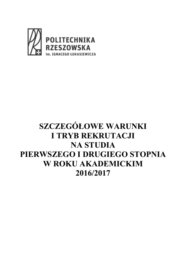 SZCZEGÓŁOWE WARUNKI I TRYB REKRUTACJI NA STUDIA PIERWSZEGO I DRUGIEGO STOPNIA W ROKU AKADEMICKIM 2016/2017 Tekst jednolity zawierający zmiany wprowadzone uchwałą Nr 18/2016 Senatu Politechniki Rzeszowskiej im. Ignacego Łukasiewicza z dnia 31 marca 2016 r. w sprawie zmiany uchwały Nr 32/2015 Senatu Politechniki Rzeszowskiej im. Ignacego Łukasiewicza z dnia 28 maja 2015 r. w sprawie ustalenia warunków, trybu oraz terminu rozpoczęcia i zakończenia rekrutacji dla poszczególnych kierunków studiów pierwszego i drugiego stopnia w roku akademickim 2016/2017 Uchwała Nr 32/2015 Senatu Politechniki Rzeszowskiej im. Ignacego Łukasiewicza z dnia 28 maja 2015 r. w sprawie ustalenia warunków, trybu oraz terminu rozpoczęcia i zakończenia rekrutacji dla poszczególnych kierunków studiów pierwszego i drugiego stopnia w roku akademickim 2016/2017 Na podstawie art. 169 ust. 2 ustawy z dnia 27 lipca 2005 r. – Prawo o szkolnictwie wyższym (t.j. Dz. U. z 2012 r. poz. 572, z późn. zm.), zwanej dalej „ustawą”, Senat Politechniki Rzeszowskiej, realizując wnioski Rad Wydziałów, uchwala, co następuje: 1. 2. 3. 4. 5. 6. 7. 8. 1. Zasady ogólne §1 Politechnika Rzeszowska, zwana dalej „Uczelnią”, prowadzi rekrutację kandydatów na studia pierwszego i drugiego stopnia o profilu ogólnoakademickim na określone kierunki i formy studiów (stacjonarne i niestacjonarne). Rekrutację przeprowadzają wydziałowe komisje rekrutacyjne, zwane dalej „WKR”, powołane spośród nauczycieli akademickich przez dziekana. WKR podejmuje decyzje w sprawach przyjęcia na studia. Organem odwoławczym w sprawach przyjęć na studia jest Uczelniana Komisja Rekrutacyjna, zwana dalej „UKR”, powołana przez rektora spośród nauczycieli akademickich Uczelni. Od decyzji WKR służy odwołanie do UKR w terminie czternastu dni od daty doręczenia decyzji. Podstawą odwołania może być jedynie wskazanie naruszenia warunków i trybu rekrutacji na studia obowiązujących w Uczelni. Decyzja UKR jest ostateczna. Na decyzję UKR przysługuje prawo wniesienia skargi do Wojewódzkiego Sądu Administracyjnego. Do kompetencji UKR należy ponadto nadzór nad przestrzeganiem przyjętych w Uczelni warunków i trybu rekrutacji oraz podejmowanie decyzji w przypadkach nieprzewidzianych w niniejszej uchwale. W ramach nadzoru, o którym mowa w ust. 5, UKR może uchylić uchwałę WKR niezgodną z przepisami prawa, statutem Politechniki Rzeszowskiej lub niniejszą uchwałą. Tryb powoływania komisji rekrutacyjnych, zakres obowiązków i zadań związanych z rekrutacją na studia wyższe określa zarządzenie rektora. Wyniki postępowania rekrutacyjnego są jawne. §2 1. Przyjęcie na określony kierunek studiów odbywa się w ramach określonej przez Senat liczby miejsc, w tym na studiach stacjonarnych dla osób, dla których będzie to kolejny kierunek studiów stacjonarnych w uczelni publicznej. 2 2. 3. 4. 5. 6. 1. 2. 3. 4. (1) Senat Uczelni określi liczbę miejsc, o której mowa w ust. 1 w terminie do końca maja 2016 r. WKR, właściwa dla określonego kierunku studiów, ustala minimalną liczbę punktów uprawniającą do przyjęcia na studia w ramach liczby miejsc, o której mowa w ust. 1. WKR ogłasza listy osób zakwalifikowanych do przyjęcia na studia oraz listy osób przyjętych na pierwszy rok studiów w formie określonej przez UKR. W przypadku niedostatecznej liczby kandydatów decyzję w sprawie uruchomienia studiów na określonym kierunku, poziomie kształcenia oraz formie studiów podejmuje UKR. Jeżeli liczba kandydatów przyjętych na dany kierunek studiów w terminie określonym odpowiednio w § 3 będzie mniejsza od liczby miejsc określonej przez Senat dla tego kierunku, rektor może podjąć decyzję o przeprowadzeniu rekrutacji uzupełniającej wyznaczając termin jej przeprowadzenia. Rekrutacja uzupełniająca jest prowadzona na warunkach i w trybie określonym w niniejszej uchwale w terminie wskazanym odpowiednio w § 3. §3 Ramowy termin rozpoczęcia i zakończenia rekrutacji na studia w roku akademickim 2016/2017 jest następujący: 1) od 1 czerwca 2016 r. do 30 września 2016 r. – dla studiów rozpoczynających się od semestru zimowego; 2) od 2 stycznia 2017 r. do 28 lutego 2017 r. – dla studiów rozpoczynających się od semestru letniego. (2) Szczegółowy harmonogram poszczególnych etapów postępowania rekrutacyjnego w ramowych terminach rozpoczęcia i zakończenia rekrutacji, w tym termin przeprowadzenia egzaminu wstępnego z predyspozycji architektonicznych i uzdolnień plastycznych na kierunek architektura rektor określi w terminie do końca maja 2016 r. Terminy przeprowadzenia egzaminów sprawdzających na studia drugiego stopnia ustala dziekan właściwego wydziału zgodnie z załącznikiem nr 5 do niniejszej uchwały. Uczelnia może, na wniosek kandydata będącego osobą niepełnosprawną, uwzględnić szczególne potrzeby kandydata i dostosować organizację egzaminu wstępnego predyspozycji architektonicznych i uzdolnień plastycznych na kierunek architektura oraz egzaminu sprawdzającego dla kandydatów na studia drugiego stopnia do jego potrzeb lub udzielić innej formy wsparcia w trakcie rekrutacji. §4 Rektor, w terminie do końca maja 2016 r., określi w drodze zarządzenia wysokość opłaty pobieranej od kandydata za postępowanie związane z przyjęciem na studia oraz tryb i termin zwrotu wniesionej opłaty. Opłata obowiązuje na każdy kierunek (z wyłączeniem kierunku wskazanego przez kandydata w podaniu o przyjęcie na studia, tj. w zgłoszeniu internetowym, jako kierunek równoległy) i formę studiów oddzielnie (stacjonarne, niestacjonarne). Wniesiona opłata nie podlega zwrotowi po terminie określonym w zarządzeniu rektora. 1. 2. §5 Studia stacjonarne pierwszego i drugiego stopnia są bezpłatne. Studia niestacjonarne pierwszego i drugiego stopnia są odpłatne. Wysokość opłat za kształcenie studentów na poszczególnych kierunkach studió