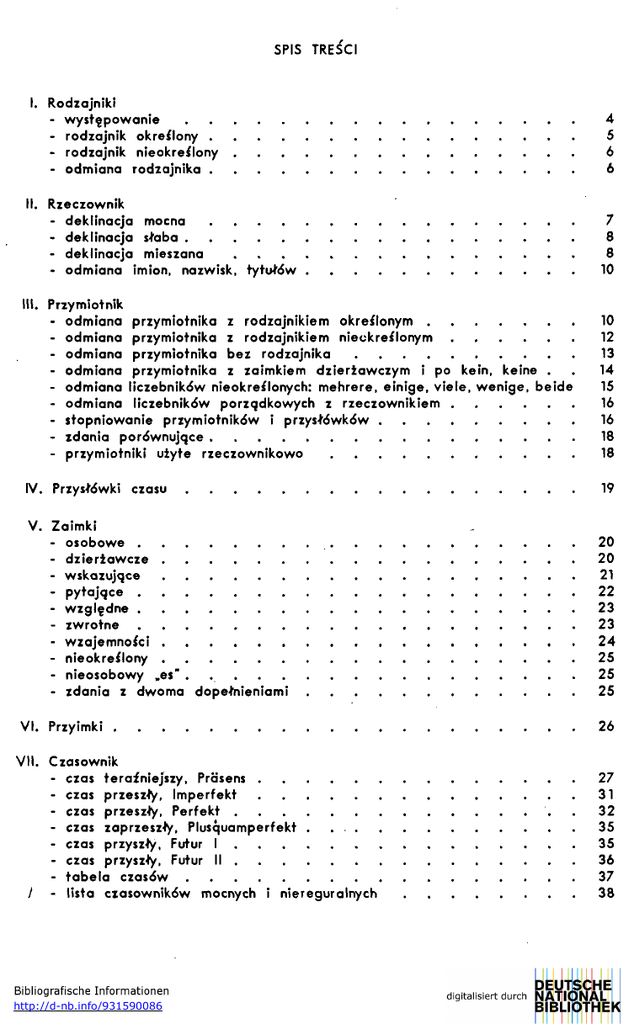 SPIS TREŚCI I. R o d z a j n i k i - występowanie - rodzajnik określony - rodzajnik nieokreślony - odmiana rodzajnika 4 5 6 6 II. R z e c z o w n i k - deklinacja mocna - deklinacja słaba - deklinacja mieszana - o d m i a n a imion, n a z w i s k , t y t u ł ó w 7 8 8 10 III. P r z y m i o t n i k - o d m i a n a przymiotnika z rodzajnikiem określonym - o d m i a n a przymiotnika z rodzajnikiem nieokreślonym - o d m i a n a przymiotnika b e z rodzajnika - o d m i a n a przymiotnika z zaimkiem d z i e r ż a w c z y m i p o kein, keine . . - o d m i a n a liczebników nieokreślonych: m e h r e r e , einige, viele, w e n i g e , b e i d e - o d m i a n a liczebników porządkowych z rzeczownikiem - stopniowanie przymiotników i przysłówków - zdania porównujące - przymiotniki u i y t e rzeczownikowo 10 12 13 14 15 16 16 18 18 IV. P r z y s ł ó w k i c z a s u 19 V. Zaimki - osobowe - dzierżawcze - wskazujące - pytające - względne - zwrotne - wzajemności - nieokreślony - n i e o s o b o w y „es" . . - zdania z d w o m a dopełnieniami 20 20 21 22 23 23 24 25 25 25 VI. Przyimki VII. C z a s o w n i k - c z a s teraźniejszy, Prasens - czas przeszły, Imperfekt - czas przeszły, Perfekt - czas zaprzeszły, Plusquamperfekt - c z a s p r z y s z ł y , Futur I - c z a s p r z y s z ł y , Futur II - tabela czasów ! - lista czasowników mocnych i niereguralnych http://d-nb.info/931590086 26 . 27 31 32 35 35 36 37 38 - t r y b rozkazujący czasowniki m o d a l n e rekcja czasowników przysłówki z a i m k o w e , p y t a n i a o r z e c z i o o s o b ę czasowniki rozdzielnie i nierozdzielnie z ł o ł o n e imiesłowy, Partizip I i Partizip II bezokolicznik z „zu" i b e z „zu" bezokolicznik p o „sein" i . h a b e n " czasownik .lassen" 42 44 47 55 56 59 60 62 03 VIII. Liczebniki g ł ó w n e i p o r z ą d k o w e - liczebniki g ł ó w n e - liczebniki p o r z ą d k o w e , d a t y - t w o r z e n i e p o ł ó w e k i ułamków - o k re ś l e n i e miary i ilości 64 65 66 66 IX. S t r o n a b i e r n a c z a s o w n i k ó w 67 X. Tryb przypuszczający, Konjunktiv - Konjunktiv P r a s e n s - Konjunktiy I m p e r t e k t - Konjunktiy P e r f e k t - Konjunktiy Plusquomperfek - Konjunktiy Futur I - Konjunktiy Futur II - Konditionalis I, II ( f o r m a o p i s o w a ) - zamiana mowy niezolełnej na z a l e ł n ą - Konjunktiy I m p e r t e k t czasowników modalnych, formy g r z e c z n o ś c i o w e - zdania warunkowe i zdania w y r a ł a j ą c e tyczenie . . . . . . . . 70 71 71 71 72 72 73 73 75 75 BUDOWA ZDANIA I Z d a n i a p o j e d y n c z e . Szyk w y r a z ó w w zdaniu " 7 6 II Z d a n i a z ł o ł o n e 1. Z d a n i a z ł o ł o n e w s p ó ł r z ę d n i e (szyk p r o s t y i szyk p r z e s t a w n y ) . . . 2. Zdania złołone podrzędnie - zdania przydawkowe - spójniki . w e n n " i .ais" - z d a n i a c e l o w e : „damit", ,um... zu" - konstrukcje b e z o k o l i c z n ikowe r o z s z e r z o n e - z d a n i a okolicznikowe sposobu .indem", .ohne daB", .ohne... zu", . a n s t a t t daB". . a n s t a t t . . . zu" - z d a n i a c z a s o w e .nachdem", . s e i t d e m " , , b e v o r / e h e " , .bis", w a h r e n d " . - podsumowanie, zdania złołone podrzędnie . 77 79 80 81 82 . 82 85 88 TESTY GRAMATYCZNE - Tłumaczenie z d a ń (•XVIII Uzupełnianie z d a ń A-H Z e s t a w t e s t ó w o d l-XVI Klucz d o t e s t ó w 90 92 96 132