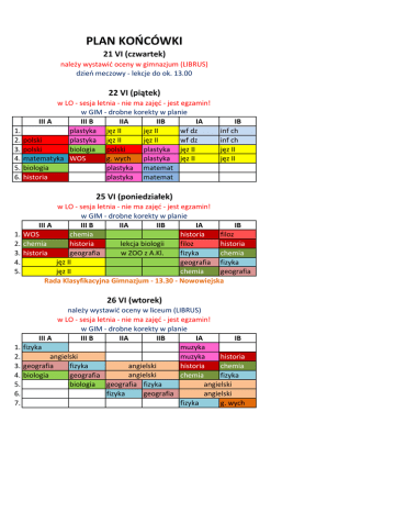 PLAN KOŃCÓWKI 21 VI (czwartek) należy wystawić oceny w gimnazjum (LIBRUS) dzień meczowy - lekcje do ok. 13.00 22 VI (piątek) 1. 2. 3. 4. 5. 6. w LO - sesja letnia - nie ma zajęć - jest egzamin! w GIM - drobne korekty w planie III A III B IIA IIB IA plastyka jęz II jęz II wf dz polski plastyka jęz II jęz II wf dz polski biologia polski plastyka jęz II matematyka WOS g. wych plastyka jęz II biologia plastyka matemat historia plastyka matemat IB inf ch inf ch jęz II jęz II 25 VI (poniedziałek) 1. 2. 3. 4. 5. w LO - sesja letnia - nie ma zajęć - jest egzamin! w GIM - drobne korekty w planie III A III B IIA IIB IA IB WOS chemia historia filoz lekcja biologii chemia historia filoz historia w ZOO z A.Kl. historia geografia fizyka chemia jęz II geografia fizyka jęz II chemia geografia Rada Klasyfikacyjna Gimnazjum - 13.30 - Nowowiejska 26 VI (wtorek) 1. 2. 3. 4. 5. 6. 7. należy wystawić oceny w liceum (LIBRUS) w LO - sesja letnia - nie ma zajęć - jest egzamin! w GIM - drobne korekty w planie III A III B IIA IIB IA IB fizyka muzyka angielski muzyka historia angielski geografia fizyka historia chemia angielski biologia geografia chemia fizyka angielski biologia geografia fizyka angielski fizyka geografia fizyka g. wych 27 VI (środa) 1. 2. 3. 4. 5. 1. 2. 3. 4. 5. w LO i GIM - lekcje skrócone drobne korekty w planie - LO IA IB IIA IIB angielski che -R WOS - R FIL - R angielski che - R WOS - R FIL - R angielski hist - JB hist - JBr g. wych g. wych hist-R fiz - R hist-R fiz - R Rada Klasyfikacyjna Liceum - 13.30 - Nowowiejska drobne korekty w planie - GIM III B IIA IIB IA IB jęz II polski wf inf jęz II polski wf inf matem geo polski matem muzyka matem chemia matem matem muzyka angielski g.wych chemia III A muzyka muzyka matem g.wych geo 28 VI (czwartek) w LO i GIM - lekcje skrócone dzień meczowy - lekcje do ok. 13.00 drobne korekty w planie - LO IB IIA IIB bio-R che -R geo-R bio-R che - R geo-R inf-chł matematyka inf-chł matematyka IA 1. 2. 3. 4. fiz - R fiz - R wf-dz wf-dz III A 1. matem 2. matem 3. fizyka 4. filozofia 5. drobne korekty w planie - GIM III B IIA IIB IA IB matem wielkie sprzątanie WIDOKU matem filozofiaod 9.00 do 12.00 fizyka nadzorują: K.Sz K. Dł M. W. A.K-G 29 VI (piątek) zakończenie roku szkolnego 9.30 Rada Nauczycieli - Podsumowująca ok. 13.00-16.00
