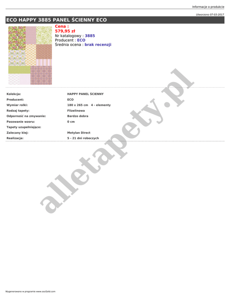 Informacje o produkcie Utworzono 07-03-2017 ECO HAPPY 3885 PANEL ŚCIENNY ECO Cena : 579,95 zł HAPPY PANEL ŚCIENNY Producent: ECO Wymiar rolki: 180 x 265 cm 4 - elementy Rodzaj tapety: Flizelinowa Odporność na zmywanie: Bardzo dobra Pasowanie wzoru: 0 cm Zalecany klej: Metylan Direct 5 - 21 dni roboczych al le Realizacja: ta pe Tapety uzupełniające: Wygenerowano w programie www.oscGold.com ty Kolekcja: .p l Nr katalogowy : 3885 Producent : ECO Średnia ocena : brak recenzji