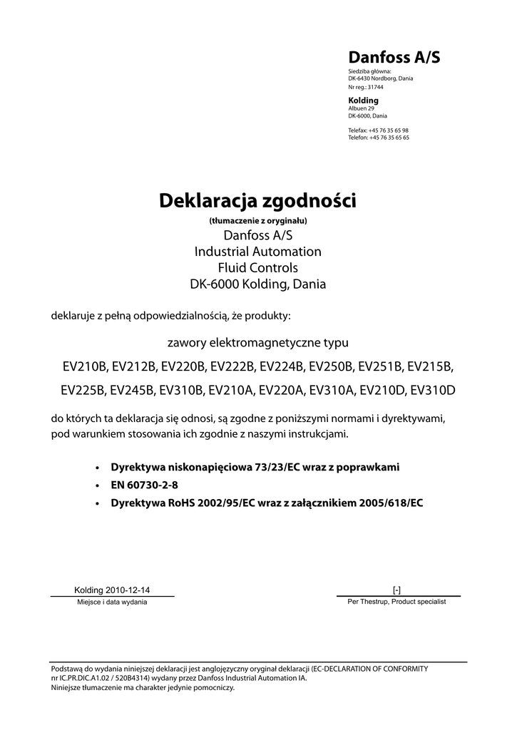 Danfoss A/S Siedziba główna: DK-6430 Nordborg, Dania Nr reg.: 31744 Kolding Albuen 29 DK-6000, Dania Telefax: +45 76 35 65 98 Telefon: +45 76 35 65 65 Deklaracja zgodności (tłumaczenie z oryginału) Danfoss A/S Industrial Automation Fluid Controls DK-6000 Kolding, Dania deklaruje z pełną odpowiedzialnością, że produkty: zawory elektromagnetyczne typu EV210B, EV212B, EV220B, EV222B, EV224B, EV250B, EV251B, EV215B, EV225B, EV245B, EV310B, EV210A, EV220A, EV310A, EV210D, EV310D do których ta deklaracja się odnosi, są zgodne z poniższymi normami i dyrektywami, pod warunkiem stosowania ich zgodnie z naszymi instrukcjami. • Dyrektywa niskonapięciowa 73/23/EC wraz z poprawkami • EN 60730-2-8 • Dyrektywa RoHS 2002/95/EC wraz z załącznikiem 2005/618/EC Kolding 2010-12-14 [-] Miejsce i data wydania Per Thestrup, Product specialist Podstawą do wydania niniejszej deklaracji jest anglojęzyczny oryginał deklaracji (EC-DECLARATION OF CONFORMITY nr IC.PR.DIC.A1.02 / 520B4314) wydany przez Danfoss Industrial Automation IA. Niniejsze tłumaczenie ma charakter jedynie pomocniczy. Danfoss A/S Hovedkontor/Head Office/Hauptsitz: DK-6430 Nordborg, Denmark Reg.nr./Reg.No./Reg.-Nr.: 31744 Kolding Albuen 29 DK 6000, Denmark Telefax: National: 76 35 65 98 International: +45 76 35 65 98 Telefon/Telephone: National: 76 35 65 65 International: +45 76 35 65 65 EC DECLARATION OF CONFORMITY Danfoss A/S Industrial Automation Fluid Controls DK-6000 Kolding, Denmark declare that it is Danfoss’ responsibility that the following products Solenoid valves Type EV210B – EV212B - EV220B - EV222B - EV224B - EV250B – EV251B - EV215B - EV225B - EV245B - EV310B - EV210A - EV220A EV310A - EV210D -EV310D which are covered by this declaration, are in observance with the following directive providing that the products are used in accordance with our instructions. x The Low Voltage Directive 73/23/EC with amendments x EN 60730-2-8 x The RoHS Directive 2002/95/EC with Amendment 2005/618/EC Kolding 2010-12-14 Place and date of issue IC.PR.DIC.A1.02 / 520B4314 Per Thestrup, Product Specialist Danfoss A/S Siedziba główna: DK-6430 Nordborg, Dania Nr reg.: 31744 Kolding Albuen 29 DK-6000, Dania Telefax: +45 76 35 65 98 Telefon: +45 76 35 65 65 Deklaracja zgodności (tłumaczenie z oryginału) Danfoss A/S Industrial Automation IA, Fluid Controls, DK-6000 Kolding, Dania deklaruje z pełną odpowiedzialnością, że produkty: cewki typu 042Nxxxx lub 018Fxxxx w przypadku montażu z zaworami elektromagnetycznymi Danfoss typu EVxxxA lub EVxxxB do których ta deklaracja się odnosi są zgodne z poniższymi normami i dyrektywami, pod warunkiem stosowania ich zgodnie z naszymi instrukcjami. • Dyrektywa niskonapięciowa 73/23/EC wraz z poprawkami • EN 60730-2-8 Kolding 2011-01-04 [-] Miejsce i data wydania Per Thestrup, Product Specialist Podstawą do wydania niniejszej deklaracji jest anglojęzyczny oryginał deklaracji (EC-DECLARATION OF CONFORMITY nr IC.PR.200.A1.02 / 520B4316) wydany przez Danfoss Industrial Automation IA. Niniejsze tłumaczenie ma charakter jedynie pomocniczy. Danfoss A/S Hovedkontor/Head Office/Hauptsitz: DK-6430 Nordborg, Denmark Reg.nr./Reg.No./Reg.-Nr.: 31744 Kolding Albuen 29 DK 6000, Denmark Telefax: National: 76 35 65 98 International: +45 76 35 65 98 Telefon/Telephone: National: 76 35 65 65 International: +45 76 35 65 65 EC DECLARATION OF CONFORMITY Danfoss A/S Industrial Automation IA, Fluid Controls, DK-6000 Kolding, Denmark Declare that it is Danfoss’ responsibility that the following products Coils type: 042NXXXX or 18FXXXX When mounted on a corresponding Danfoss Solenoid Valve EVXXXA or EVXXXB Which are covered by this declaration, are in observance with the following directive providing that the products are used in accordance with our instructions. x The Low Voltage Directive 73/23/EC with amendments x EN 60730-2-8 Kolding 2011-01-04 Place and date of issue IC.PR.200.A1.02 / 520B4316 Per Thestrup, Product Specialist Danfoss A/S Siedziba główna: DK-6430 Nordborg, Dania Nr reg.: 31744 Kolding Albuen 29 DK-6000, Dania Telefax: +45 76 35 65 98 Telefon: +45 76 35 65 65 Deklaracja zgodności (tłumaczenie z oryginału) Danfoss A/S Industrial Automation Fluid Controls DK-6000 Kolding, Dania deklaruje z pełną odpowiedzialnością, że następujące produkty są wytwarzane i oznaczane znakiem CE zgodnie z Dyrektywą Ciśnieniową 97/23/EC Zawory elektromagnetyczne typu: EV210B 20-25, EV220A 18-22, EV220B 18-22, EV220B 20-50, EV250B 18-22, EV224B 20-25 Kolding 2010-12-14 [-] Miejsce i data wydania Per Thestrup, Product Specialist Podstawą do wydania niniejszej deklaracji jest anglojęzyczny oryginał deklaracji (EC-DECLARATION OF CONFORMITY nr IC.PR.DIC.B2.02 / 520B1479) wydany przez Danfoss Industrial Automation IA. Niniejsze tłumaczenie ma charakter jedynie pomocniczy. Danfoss A/S Hovedkontor/Head Office/Hauptsitz: DK-6430 Nordborg, Denmark Reg.nr./Reg.No./Reg.-Nr.: 31744 Kolding Albuen 29 DK 6000, Denmark Telefax: National: 76 35 65 98 International: +45 76 35 65 98 Telefon/Telephone: National: 76 35 65 65 International: +45 76 35 65 65 EC DECLARATION OF CONFORMITY Danfoss A/S Industrial Automation Fluid Controls DK-6000 Kolding, Denmark declare that it is Danfoss’ responsibility that the following products are produced and CE marked according to the Pressure Equipment Directive 97/23/EC: Solenoid valves Type EV210B 20-25, EV220A 18-22, EV220B 18-22, EV220B 20-50, EV250B 18-22, EV224B 20-25 Kolding 2010-12-14 Place and date of issue IC.PR.DIC.B2.02 / 520B1479 Per Thestrup, Product Specialist Danfoss A/S Siedziba główna: DK-6430 Nordborg, Dania Nr reg.: 31744 Kolding Albuen 29 DK-6000, Dania Telefax: +45 76 35 65 98 Telefon: +45 76 35 65 65 Deklaracja zgodności (tłumaczenie z oryginału) Danfoss A/S Industrial Automation DK-6000 Kolding, Dania deklaruje z pełną odpowiedzialnością, że następujące produkty są zgodne z Artykułem 3, paragraf 3 Dyrektywy Ciśnieniowej 97
