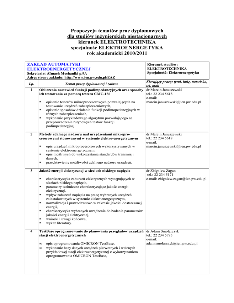 Propozycja tematów prac dyplomowych dla studiów inŜynierskich niestacjonarnych kierunek ELEKTROTECHNIKA specjalność ELEKTROENERGETYKA rok akademicki 2010/2011 ZAKŁAD AUTOMATYKI ELEKTROENERGETYCZNEJ Sekretariat :Gmach Mechaniki p.9A Adres strony zakładu: http://www.ien.pw.edu.pl/EAZ Lp. 1 2 Kierujący pracą: tytuł, imię, nazwisko, tel, mail Obliczenia nastawień funkcji podimpedancyjnych oraz sposoby dr Marcin Januszewski tel.: 22 234 5618 ich testowania za pomocą testera CMC-156 e-mail: opisanie testerów mikroprocesorowych pozwalających na [email protected] testowanie urządzeń zabezpieczeniowych, opisanie sposobów działania funkcji podimopedancyjnych w róŜnych zabezpieczeniach, wykonanie przykładowego algorytmu pozwalającego na przeprowadzenie rutynowych testów funkcji podimpedancyjnej. Temat pracy dyplomowej i zakres Metody zdalnego nadzoru nad urządzeniami mikroprocesorowymi stosowanymi w systemie elektro-energetycznym 3 opis urządzeń mikroprocesorowych wykorzystywanych w systemie elektroenergetycznym, opis moŜliwych do wykorzystania standardów transmisji danych, przedstawienie moŜliwości zdalnego nadzoru urządzeń. Jakość energii elektrycznej w sieciach niskiego napięcia 4 Kierunek studiów: ELEKTROTECHNIKA Specjalność: Elektroenergetyka charakterystyka zaburzeń elektrycznych występujących w sieciach niskiego napięcia, parametry techniczne charakteryzujące jakość energii elektrycznej, wpływ zaburzeń napięcia na pracę wybranych urządzeń zainstalowanych w systemie elektroenergetycznym, normalizacja i prawodawstwo w zakresie jakości dostarczanej energii, charakterystyka wybranych urządzenia do badania parametrów jakości energii elektrycznej, wnioski i uwagi końcowe, wykaz literatury. dr Marcin Januszewski tel.: 22 234 5618 e-mail: [email protected] dr Zbigniew śagan tel.: 22 234 5171 e-mail: [email protected] TestBase oprogramowanie do planowania przeglądów urządzeń dr Adam Smolarczyk tel.: 22 234 5795 stacji elektroenergetycznych e-mail: [email protected] • opis oprogramowania OMICRON TestBase, • wykonanie bazy danych urządzeń pierwotnych i wtórnych przykładowej stacji elektroenergetycznej z wykorzystaniem oprogramowania OMICRON TestBase, 5 Program CAPE jako przydatne narzędzie w automatyce elektroenergetycznej • • • • 6 7 opis modułów programu CAPE (Computer-Aided Protection Engineering), zaproponowanie układów sieci elektroenergetycznych (wraz z ich układem zabezpieczeń), które będą zamodelowane w programie CAPE w celu sprawdzenia poprawności działania poszczególnych modułów programu, zamodelowanie zaproponowanych układów sieci elektroenergetycznych w programie CAPE, sprawdzenie poprawności działania zamodelowanych układów i opis uzyskanych wyników. dr Adam Smolarczyk tel.: 22 234 5795 e-mail: [email protected] Sprawdzenie modeli przekładników prądowych i napięciowych dr Adam Smolarczyk tel.: 22 234 5795 dostępnych w programie PSCAD/EMTDC e-mail: [email protected] • opis zasady działania i podstawowych parametrów przekładników prądowych i napięciowych, • opis modeli przekładników prądowych i napięciowych dostępnych w programie PSCAD/EMTDC, • zamodelowanie w programie PSCAD/EMTDC wybranych przekładników prądowych i napięciowych występujących w krajowym systemie elektroenergetycznym, • zaproponowanie badań zamodelowanych przekładników, • wykonanie zaproponowanych badań i weryfikacja otrzymanych wyników. dr Ryszard Kowalik Porównanie urządzeń i metod pomiarowych stosowanych do tel.: 22 234 5608 sterowania chłodzeniem transformatorów i e-mail: [email protected] autotransformatorów duŜej mocy WN • 8 opis konstrukcji i właściwości transformatorów oraz autotransformatorów duŜej mocy, • opis metod chłodzenia stosowanych w transformatorach i autotransformatorach duŜej mocy, • opis wybranych urządzeń pomiarowych i sterujących stosowanych do sterowania chłodzeniem transformatorów i autotransformatorów duŜej mocy, • wnioski. Porównanie urządzeń i metod pomiarowych stosowanych do określania stanu przełącznika zaczepów autotransformatora duŜej mocy WN dr Ryszard Kowalik tel.: 22 234 5608 e-mail: [email protected] • 9 opis konstrukcji i właściwości przełączników zaczepów stosowanych w autotransformatorach duŜej mocy, • opis metod pomiarowych stosowanych do określania stanu przełącznika zaczepów autotransformatora duŜej mocy, • opis wybranych urządzeń pomiarowych i diagnostycznych stosowanych do określania stanu przełącznika zaczepów autotransformatora duŜej mocy, • wnioski. Zabezpieczenia silników niskiego napięcia rodzaje zakłóceń występujących w pracy silników, rodzaje stosowanych zabezpieczeń, wyłączniki silnikowe, zabezpieczenia cyfrowe silników niskiego napięcia, badania laboratoryjne wybranego typu zabezpieczenia silnika dr Zbigniew śagan tel.: 22 234 5171 e-mail: [email protected] 10 Zabezpieczenia transformatorów odbiorczych SN/nN urządzeniami firmy AREVA • • • • • Charakterystyka transformatorów instalowanych w rozdzielniach sieci SN Układy zasilania transformatorów, wyposaŜenie torów prądowych w aparaturę łączeniową i pomiarową Przegląd i wybór sterownika firmy AREVA Aplikacja sterownika do pola transformatora odbiorczego w wybranej sieci SN Wnioski ZAKŁAD ELEKTROWNI I GOSPODARKI ELEKTROENERGETYCZNEJ Sekretariat : Gmach Elektryczny, wejście C p.209 Adres strony WWW zakładu: www.ien.pw.edu.pl/EIG Lp. Temat pracy dyplomowej i zakres 1 Projekt koncepcyjny budowy elektrowni (farmy) wiatrowej Opis ogólny koncepcji budowy elektrowni wiatrowej Dobór podstawowych elementów wyposaŜenia i charakterystyka zastosowanych urządzeń Analiza efektywności ekonomicznej przedsięwzięcia inwestycyjnego Analiza techniczno-ekonomiczna zasilania obiektu w energię elektryczną i ciepło z ogniwa paliwowego Przegląd technologii wytwarzania energii elektrycznej i ciepł