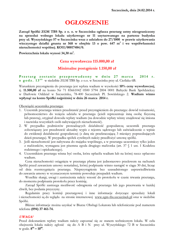 Szczecinek, dnia 24.02.2014 r. OGŁOSZENIE Zarząd Spółki ZGM TBS Sp. z o. o. w Szczecinku ogłasza przetarg ustny nieograniczony na sprzedaŜ wolnego lokalu uŜytkowego nr 11 usytuowanego na parterze budynku przy ul. Wyszyńskiego 57 w Szczecinku wraz z udziałem do 27/1000 w prawie uŜytkowania wieczystego działki gruntu nr 568 w obrębie 13 o pow. 647 m2 i we współwłasności nieruchomości wspólnej. KO1I/00017484/0. Powierzchnia lokalu wynosi 34,30 m2. Cena wywoławcza 115.000,00 zł Minimalne postąpienie 1.150,00 zł Przetarg zostanie przeprowadzony w dniu 27 marca o g o d z . 1 3 0 0 w siedzibie ZGM TBS Sp. z o.o. w Szczecinku przy ul. Cieślaka 6B. 2014 r. Warunkiem przystąpienia do przetargu jest wpłata wadium w wysokości 10% ceny wywoławczej, tj. 11.500,00 zł na konto Nr 71 85661042 0500 5794 2004 0001 Bałtycki Bank Spółdzielczy w Darłowie Oddział w Szczecinku, 78-400 Szczecinek Pl. Sowińskiego 2. Wadium winno wpłynąć na konto Spółki najpóźniej w dniu 26 marca 2014 r. Obowiązki uczestnika przetargu: 1. Uczestnik przetargu winien przedstawić przed przystąpieniem do przetargu: dowód toŜsamości, pełnomocnictwo do wzięcia udziału w przetargu (jeŜeli reprezentuje inną osobę fizyczną lub prawną), oryginał dowodu wpłaty wadium (na dowodzie wpłaty winny znajdować się imiona i nazwiska wszystkich osób nabywających nieruchomość). 2. W przypadku podmiotów prowadzących działalność gospodarczą uczestnik przetargu zobowiązany jest przedstawić aktualny wypis z rejestru sądowego lub zaświadczenie o wpisie do ewidencji działalności gospodarczej (z datą nie przekraczającą 3 miesięcy poprzedzających dzień przetargu). W przypadku spółek cywilnych naleŜy przedłoŜyć umowę spółki. 3. Jeśli nieruchomość jest nabywana do majątku wspólnego, a w przetargu uczestniczy tylko jeden z małŜonków, wymagana jest pisemna zgoda drugiego małŜonka (art. 37 § 1 ust. 1 Kodeksu rodzinnego i opiekuńczego). 4. Uczestnikiem przetargu winna być osoba, która opłaciła wadium lub na której rzecz opłacono wadium. Cena nieruchomości osiągnięta w przetargu płatna jest jednorazowo przelewem na rachunek Spółki przed zawarciem umowy notarialnej, której podpisanie winno nastąpić w ciągu 30 dni, licząc od dnia rozstrzygnięcia przetargu. Nieprzystąpienie bez uzasadnionego usprawiedliwienia do zawarcia umowy w wyznaczonym terminie powoduje przepadek wadium. Wszelkie skargi, uwagi i zastrzeŜenia naleŜy wnosić do protokołu w czasie trwania przetargu, do momentu podpisania protokołu przez komisję. Zarząd Spółki zastrzega moŜliwość odstąpienia od przetargu lub jego przerwania w kaŜdej chwili, bez podania przyczyny. Regulamin pracy komisji przetargowej i inne informacje dotyczące sprzedaŜy lokali i nieruchomości są do wglądu na stronie internetowej www.zgm-tbs.szczecinek.pl oraz w siedzibie Spółki. BliŜsze informacje moŜna uzyskać w Biurze Obsługi Lokatora lub telefonicznie pod numerem telefonu (094) 37 461-74. UWAGA! Przed dokonaniem wpłaty wadium naleŜy zapoznać się ze stanem technicznym lokalu. W celu obejrzenia lokalu naleŜy zgłosić się do A B i N przy ul. Wyszyńskiego 72 B w Szczecinku w godz. 800 – 1000.