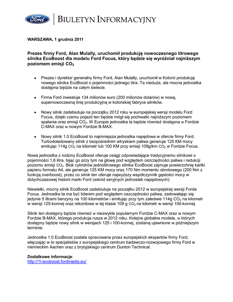 BIULETYN INFORMACYJNY WARSZAWA, 1 grudnia 2011 Prezes firmy Ford, Alan Mulally, uruchomił produkcję nowoczesnego litrowego silnika EcoBoost dla modelu Ford Focus, który będzie się wyróżniał najniższym poziomem emisji CO2 Prezes i dyrektor generalny firmy Ford, Alan Mulally, uruchomił w Kolonii produkcję nowego silnika EcoBoost o pojemności jednego litra. Ta nieduża, ale mocna jednostka dostępna będzie na całym świecie. Firma Ford inwestuje 134 milionów euro (200 milionów dolarów) w nową, supernowoczesną linię produkcyjną w kolońskiej fabryce silników. Nowy silnik zadebiutuje na początku 2012 roku w europejskiej wersji modelu Ford Focus, dzięki czemu pojazd ten będzie mógł się pochwalić najniższym poziomem spalania oraz emisji CO2. W Europie jednostka ta będzie również dostępna w Fordzie C-MAX oraz w nowym Fordzie B-MAX. Nowy silnik 1.0 EcoBoost to najmniejsza jednostka napędowa w ofercie firmy Ford. Turbodoładowany silnik z bezpośrednim wtryskiem paliwa generuje 125 KM mocy emitując 114g CO2 na kilometr lub 100 KM przy emisji 109g/km CO2 w Fordzie Focus. Nowa jednostka z rodziny EcoBoost oferuje osiągi odpowiadające tradycyjnemu silnikowi o pojemności 1,6 litra, bijąc go przy tym na głowę pod względem oszczędności paliwa i redukcji poziomu emisji CO2. Blok cylindrów jednolitrowego silnika EcoBoost zajmuje powierzchnię kartki papieru formatu A4, ale generuje 125 KM mocy oraz 170 Nm momentu obrotowego (200 Nm z funkcją overboost), przez co silnik ten oferuje najwyższy współczynnik gęstości mocy w dotychczasowej historii marki Ford (wśród seryjnych jednostek napędowych). Niewielki, mocny silnik EcoBoost zadebiutuje na początku 2012 w europejskiej wersji Forda Focus. Jednostka ta ma być liderem pod względem oszczędności paliwa, zadowalając się jedynie 5 litrami benzyny na 100 kilometrów i emitując przy tym zaledwie 114g CO2 na kilometr w wersji 125-konnej oraz rekordowe w tej klasie 109 g CO2 na kilometr w wersji 100-konnej. Silnik ten dostępny będzie również w niezwykle popularnym Fordzie C-MAX oraz w nowym Fordzie B-MAX, którego produkcja rusza w 2012 roku. Kolejne globalne modele, w których dostępny będzie nowy silnik w wersjach 125 i 100-konnej, zostaną ujawnione w późniejszym terminie. Jednostka 1.0 EcoBoost została opracowana przez europejskich ekspertów firmy Ford, włączając w to specjalistów z europejskiego centrum badawczo-rozwojowego firmy Ford w niemieckim Aachen oraz z brytyjskiego centrum Dunton Technical. Dodatkowe informacje: http://1l-ecoboost.fordmedia.eu/ 2161 kilometrów na jednym baku Ford Mondeo ECOnetic prowadzony przez dwóch Norwegów pokonał dystans 2161 kilometrów na jednym zbiorniku paliwa (70 litrów oleju napędowego) Trasa biegła od Murmańska w Rosji przez Oslo w Norwegii do miasteczka Uddevalla na północy Göteborga w Szwecji Ford Mondeo ECOnetic wyposażony w 115-konny silnik wysokoprężny 1,6 litra osiągnął średnie zużycie paliwa na poziomie 3,2 litra na 100 kilometrów Dwóch norweskich ekspertów w dziedzinie ekojazdy pokonało Fordem Mondeo ECOnetic kombi dystans 2161,5 kilometra na jednym, 70-litrowym zbiorniku paliwa. Knut Wilthil i Henrik Borchgervink wyruszyli z Murmańska w Rosji standardowym Fordem Mondeo z silnikiem Diesla 1,6 litra i technologią ECOnetic, aby po 40 godzinach jazdy dotrzeć do miasteczka Uddevalla na północy Göteborga w Szwecji, wykorzystując tym samym ostatnią kroplę oleju napędowego w zbiorniku. Średnie zużycie paliwa na całej trasie wyniosło 3,2 litra na 100 kilometrów, czyli o 1,1 litra mniej, niż deklaruje producent (4,3 l/100 km w cyklu pomiarowym UE). „Osiągnięty wynik średniego zużycia paliwa wywołuje jeszcze większe wrażenie, jeśli weźmiemy pod uwagę niesprzyjające warunki drogowe, jakie napotkaliśmy w pierwszym etapie podróży w Rosji, włączając w to głębokie dziury w nawierzchni i strome podjazdy, a także podczas kolejnego, 1000-kilometrowego odcinka jazdy po mokrych i wietrznych drogach Finlandii i Szwecji,” powiedział Henrik. Ford Mondeo ECOnetic wykorzystuje najnowocześniejsze technologie ograniczające emisję CO2 i opór aerodynamiczny, a także inteligentne systemy informujące i wspomagające kierowcę, takie jak układ Auto-Start-Stop, ładowanie akumulatora z odzyskiwaniem energii hamowania, aktywną żaluzję wlotu powietrza do komory silnika, tryb Ford ECO, lampkę kontrolną zmiany biegów oraz wydłużone przełożenie przekładni głównej. W osiągnięciu wysokiej wydajności paliwowej oraz wyjątkowo niskiej emisji dwutlenku węgla na poziomie 114 g/km pomagają również opony o niskim oporze toczenia, olej silnika i skrzyni biegów o niskim współczynniku tarcia oraz obniżone zawieszenie. Dodatkowe informacje: http://media.ford.com/article_display.cfm?article_id=35348 Inteligentna komunikacja dla poprawy bezpieczeństwa Ford jednym z liderów projektu simTD (Safe Intelligent Mobility – Testfield Germany) zakrojonego na szeroką skalę programu testów inteligentnego systemu komunikacji bezprzewodowej Systemy opracowane przez Forda pozwalają na przekazywanie informacji o zagrożeniach pomiędzy pojazdami lub pomiędzy pojazdem i infrastrukturą drogową Nowatorski system komunikacji przyczyni się do poprawy bezpieczeństwa na drogach, usprawni płynność ruchu i pomoże obniżyć emisję CO2 2 Ford zademonstrował najnowocześniejsze technologie komunikacyjne w ramach projektu simTD (Safe Intelligent Mobility – Testfield Germany), czyli zakrojonego na szeroką skalę programu testów inteligentnego systemu komunikacji pomiędzy pojazdami oraz pomiędzy pojazdem i infrastrukturą. SimTD to wspólny projekt badawczy niemieckich producentów aut, dostawców części, firm komunikacyjnych oraz instytutów badawczych, zapoczątkowany w 2008 roku. Jego celem jest opracowanie rozbudowanego systemu komunikacji, który przyczyni się do poprawy bezpieczeństwa na droga