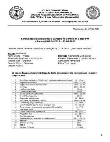 POLSKIE TOWARZYSTWO TURYSTYCZNO – KRAJOZNAWCZE ODDZIAŁ MIĘDZYUCZELNIANY w WARSZAWIE Koło PTTK nr 1 przy Politechnice Warszawskiej Plac Politechniki 1, 00-661 Warszawa http://jedynka.om.pttk.pl Warszawa, dn. 22.05.2011 Sprawozdanie z działalności Zarządu Koła PTTK nr 1 przy PW w kadencji 08.04.2010 – 25.05.2011 Ostatnie Walne Zebranie członków Koła odbyło się 07.04.2010 r., na którym wybrano: Zarząd w składzie: Kamil Opiela – Prezes Aleksandra Pagórska – v-ce Prezes Ryszard Wilk – Skarbnik Danuta Wlizło – Sekretarz Urszula Majdak Komisję Rewizyjną w składzie: Karolina Topolewska – przewodnicząca Aleksandra Karkowska Edyta Tomczyszyn W czasie trwania kadencji Zarządu Koło zorganizowało następujące imprezy turystyczne: 0 1 2 3 4 5 6 7 8 9 10 11 12 13 14 15 16 17 18 19 20 21 Rajd Puszcza Biała – ODWOŁANY z powodu żałoby narodowej Majówka w Sudetach Majówka rowerowa na Mazurach AntyRajd InO Puszcza Biała Ognisko Pokursowe XLVI Rajd Noc Świętojańska VI InO Świętojańskie Z Jedynką na Grunwald Włóczenie się po Bieszczadach Łiiikendowy spływ kajakowy pozMROCZNY rajd na dobry początek roku Trasa piesza i rowerowa na obchodach 50-lecia OM InO Jesień Idzie Orlické Hory i Góry Bystrzyckie Wyjazd na Jurę Rajd Mikołajkowy Jabadabadooo - Sylwester z Jaskiniowcem Biegówki Zimowe spacery ZiMnO VII Rajd PoSesja 16 - 17.04 29.04 - 03.05 01.05 - 03.05 28.05 - 30.05 12.06 16.06 19.05 - 20.06 27.06 06 - 08.08 28.08 - 08.09 18 -19.09 08 - 09.10 16 -17.10 06.11 11 - 14.11 27 - 28.11 05.12 28.12 - 02.12 06.01 16.01 05.02 12 -13.02 1 22 23 24 25 26 27 28 Beskid Niski jest mi bliski Rajd z okazji Dnia Kobiet Zimowe spacery cz.5 Czersk – Ruinada Puszcza Biała wraz z InO Majówka Rowerowa nad Bugiem Rowerem do Czerska 14 - 20.02 05 - 06.03 12.03 26 - 27.03 16 - 17.04 30.04 - 03.05 07.05 Ponadto Koło wzięło udział w: Juwenaliach PW 2010, prezentacji na Targach Organizacji Studenckich PW KONIK 2010, współorganizowaniu czwartkowych slajdowisk, pomocy przy organizacji kursu OInO, obchodach 50-lecia OM. Członkowie Koła: Koło na dzień 18 maja 2011 roku liczy sobie 53 członków, w tym 18 osób opłaca składki ulgowe (studenci). Kurs OT: Zaczęło 15 osób, aktywnych pozostało ok. 10 osób, do egzaminu w pierwszym terminie podeszły 3 osoby. Kurs OInO: Organizacji kursu OInO I AInO w tym roku podjęła się Komisja InO przy OM, Koło zorganizowało salę w GG PW na spotkania kursowe. Stan sprzętu: namioty – 12 szt w tym 5 uszkodzonych gary – 3 szt z pokrywką + 1 szt wiadro sakwy rowerowe – 4 kompl. palniki – 2 szt. apteczki – 4 szt. siekiera – 2 szt. ostrzałka – 1 szt. rakiety śnieżne – 5 kompl. materiały InO – lampiony, kredki, karty startowe, termosy – 2 szt. 2 Odznaczenia przyznane przez Zarząd Główny PTTK na obchodach 50-lecia OM: Szymon Bijak Karolina Pawlak Michał Segit Ryszard Wilk Bogdan Ziółkowski Maciej Florek Marcin Grabowski Urszula Majdak (zd. Wapniarska) Łukasz Skłodowski 1 1 1 1 1 1 1 1 1 srebrna honorowa srebrna honorowa srebrna honorowa srebrna honorowa srebrna honorowa dyplom PTTK dyplom PTTK dyplom PTTK dyplom PTTK Postępujące i nowe problemy Zarządu i Koła, niepowodzenia Zarządu: do 16 maja 2011r. – brak siedziby Koła, ciągłe odwlekanie decyzji PW o przyznaniu planowanej sali, bałagan w dokumentacji kołowej, który utrudnił rozpoczęcie działalności, spadek liczby Kołowiczów na tradycyjnych rajdach Koła (Ruinada, Puszcza Biała), spadek liczby Kołowiczów na spotkaniach okolicznościowych Koła (Wigilia, Jajo), niewielka liczba studentów, w tym studentów PW w szeregach Koła, postępujące starzenie się Koła, emerycki wiek części Zarządu wpłynął na obciążenie jedynego studenta PW w Zarządzie (czyt. Prezesa) formalnościami do spełnienia na PW i załatwiania siedziby, nierównomierny podział obowiązków w Zarządzie, znikome dofinansowanie imprez z PW – za mało studentów PW na imprezach, za dużo formalności związanych z pozyskaniem i rozliczaniem dofinansowania, niewystarczająca reklama Koła, zawirusowanie strony Koła, brak relacji z imprez stronie, namioty wymagające napraw po zeszłorocznych wypożyczeniach, mała liczba ogólnodostępnych obozów w trakcie wakacji 2010. 3 Co się jednak udało: uzyskanie nowej siedziby dla Koła w gmachu stołówki PW pok. 56, ogarnięcie bałaganu w papierach Koła, ogarnięcie stanu sprzętu Koła, uchwalenie regulaminu Puchar InO Jedynki, liczny odzew Kołowiczów w sprawie projektu nowej koszulki, wykonanie koszulek, pojawienie się Jedynki na portalu Facebook, wczesne ustalenie kalendarza imprez na rok 2011 (wykonanie w związku z tym kalendarzyka), co ułatwiło organizację, utrzymywanie dobrych kontaktów z AKT Maluch, złożenie na uczelni wszelkich wymaganych sprawozdań oraz preliminarzy daje następcom możliwość starania się o fundusze. Wskazówki dla przyszłego Zarządu: zorganizowanie „Zerówki” – szansa na pozyskanie nowych, młodych osób i zachęcenie ich do kursu OT, położenie nacisku na zorganizowanie kolejnej edycji kursu OT – wczesne ustalenie przede wszystkim kierownika/ów, reklamy, formy – jest to uwaga do CAŁEGO Koła, nie tylko przyszłego Zarządu, zaangażowanie większej ilości Kołowiczów w życie Koła, tj.: – głównie w reklamę kOT oraz imprez Koła – obsadę tras, imprez kołowych – studentów w pomoc w biurokracji na PW, utrzymywanie poprawnych kontaktów z: – Samorządem PW – Zarządem OM innymi wcześniej zakolegowanymi kołami/klubami administracją stołówki PW, wczesne ustalenie kalendarza imprez na kolejny rok, 4 wcześniejsze planowanie obozów letnich, zerówki – zrobienie skutecznej reklamy, większe zaangażowanie licznej kadry kołowej do robienia wycieczek, a pozostałych do zdobywania uprawnień, lepsze rozliczanie pożyczanego sprzętu i egzekwowanie jego naprawiania gdy zostanie uszkodzony, zorganizowanie akcji reklamowej wśr
