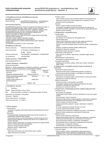epoxyDRAGON gospodarczy - dwuskładnikowy klej epoksydowy gospodarczy - składnik A Karta charakterystyki preparatu niebezpiecznego. 1. Identyfikacja preparatu. Identyfikacja producenta. Kontakt z okiem: Identyfikacja preparatu. Jeżeli możliwe usunąć szkła kontaktowe (jeżeli nie przywarły do oka). Przemywać otwarte oczy czystą wodą przez co najmniej 15 minut. Zapewnić pomoc okulistyczną. Spożycie: Nazwa produktu: epoxyDRAGON gospodarczy - dwuskładnikowy klej epoksydowy gospodarczy - składnik A Zastosowanie preparatu. epoxyDRAGON gospodarczy może być stosowany do łączenia ze sobą i w różnych kombinacjach: metalu, szkła, ceramiki, drewna, porcelany, minerałów skalnych, elementów betonowych, styropianu, azbestu, gumy i tworzyw sztucznych (np. laminaty, tworzywa poliestrowe, bakelity). epoxyDRAGON gospodarczy jest szczególnie przydatny przy: -naprawie uszkodzeń urządzeń sanitarnych, -klejeniu złamanych nart, rakiet tenisowych i innego sprzętu sportowego, -naprawie mebli, zabawek itp., -mocowaniu haków, kołków, uchwytów narzędzi -usuwaniu ubytków zabezpieczeń antykorozyjnych, -trwałym zabezpieczaniu układów elektronicznych przed wpływami zewnętrznymi, -uszczelnianiu przecieków w rurach i zbiornikach. Identyfikacja producenta: Nazwa producenta: Wytwórnia Chemiczna DRAGON Adres producenta: ul. Powstania Listopadowego 14 30-298 Kraków Telefony producenta: +48126238080, +48126238070, +48126254455 Fax producenta: +48126377930 Telefon alarmowy: +48126238080 Zasady ogólne: Produkt jest palny. Nie dopuścić do rozlewania się wód pogaśniczych. Odciąć dopływ gazu. Udział w akcji ratowniczej mogą brać tylko osoby przeszkolone, wyposażone w odpowiedni sprzęt i odzież ochronną. Usunąć z otoczenia wszystkie osoby nie biorące udziału w likwidowaniu awarii. Wyłączyć urządzenia zasilane prądem elektrycznym. Zawiadomić otoczenie o pożarze. Zawiadomić służby ratownicze o pożarze. Odpowiednie środki gaśnicze: Piany odporne na alkohol, mgła wodna, dwutlenek węgla, proszki gaśnicze. Nieodpowiednie środki gaśnicze: Niebezpieczne produkty rozkładu: tlenki azotu, tlenek i dwutlenek węgla, sadza. 2. Skład i informacje o składnikach. Wyrób jest preparatem. 6. Postępowanie w przypadku niezamierzonego uwolnienia do środowiska. Składnik A - Żywica epoksydowa z dodatkiem wypełniaczy, wypełniaczy aktywnych, środków tiksotropowych i poprawiających adhezję. Nr WE Nr CAS Numery zwrotów R Żywica epoksydowa (średnia masa cząsteczkowa <700) 500-033-5 produkt reakcji bisfenolu A z epichlorohydryną 25068-38-6 Xi 5. Postępowanie w przypadku pożaru. Nie stosować zwartych strumieni wody. Szczególne zagrożenia: Data aktualizacji:05-05-12 Nazwa substancji Synonimy Kategorie niebezpieczeństwa Podać 2 szklanki mleka lub wody do wypicia. W przypadku wystąpienia samoistnych wymiotów nie dopuścić do przenikania produktu zawartego w wymiocinach do dróg oddechowych. Zapewnić pomoc lekarską. R36/38 Stężenie (% wag.) 0 - 40 Indywidualne środki ostrożności: Stosować środki ochrony indywidualnej zgodnie z punktem 8. Unikać bezpośredniego kontaktu z uwalniającą się substancją. Środowiskowe środki ostrożności: Nie dopuścić do skażenia gleby, wód gruntowych i powierzchniowych. Zabezpieczyć studzienki ściekowe. Metody oczyszczania: Pozbierać produkt z zachowaniem zasad BHP. W przypadku dużego wycieku miejsce gromadzenia się cieczy obwałować, zebraną ciecz odpompować. Zabezpieczyć studzienki ściekowe. R43 3. Identyfikacja zagrożeń. Xi Drażniący. R36/38 Działa drażniąco na oczy i skórę Posługiwanie się: R43 Może powodować uczulenie w następstwie kontaktu ze skórą Nie wylewać do kanalizacji. Przestrzegać zasad higieny, po pracy, każdorazowo umyć ręce wodą z mydłem. Przetrzymywać z dala od żywności. Stosować środki ochrony osobistej zgodnie z zaleceniami na etykiecie opakowania jednostkowego oraz znajdującymi się w punkcie 8. Unikać kontaktu ze skóra lub oczami. Używać pojemników, połączeń i sprzętu odpornego na działanie produktu. W czasie użytkowania produktu nie jeść ani nie pić. W czasie użytkowania produktu nie palić. Zachować środki ostrożności niezbedne przy pracy z chemikaliami. Zapewnić dobre wentylowanie zamkniętych pomieszczeń. Magazynowanie: 7. Postępowanie z substancją/preparatem i jej/jego magazynowanie. Zagrożenia nie wynikające z klasyfikacji: Typ pożaru Niepalny Grupa wybuchowości: nie dotyczy Klasa temperaturowa: T1 (>450C) 4. Pierwsza pomoc. Zasady ogólne: W każdym przypadku natychmiast zapewnić poszkodowanemu pomoc lekarską. Wdychanie: Poszkodowanego wynieść/wyprowadzić poza obszar narażenia na produkt/opary produktu/mgły produktu. Przytomnego ułożyć w pozycji półsiedzącej, nieprzytomnego ułozyć w pozycji bocznej ustalonej, oczyścić jamę ustną i nos z wydzielin oraz usunąć ciała obce. Ryzyko inhalacji isnieje tylko w przypadku utworzenia się mgły produktu lub też w wyniku jego znacznego ogrzania. Zapewnić dostęp świeżego powietrza. Zapewnić spokój i ciepłe okrycie. Kontakt ze skórą: Zanieczyszczoną skórę zmyć dużą ilością wody z mydłem. Zdjąć zanieczyszczoną odzież. 12 maja 2005 Chronić przed nadmiernym nagrzaniem. Należy przechowywać zgodnie z zaleceniami podanymi na etykiecie opakowania jednostkowego oraz wymienionymi w punkcie 15. Nie przechowywać wspólnie z materiałami utleniającymi. Przechowywać tylko w oryginalnych opakowaniach producenta. Przechowywać w chłodnych miejscach. Przechowywać w temperaturze powyżej 0 C. 8. Kontrola narażenia i środki ochrony indywidualnej. Informacje ogólne: Doboru środków ochrony indywidualnej należy dokonywać z uwzględnieniem stopnia zagrożenia występującego na danym stanowisku pracy i czynności wykonywanych przez pracownika. MSDS/XGA/05-05-12/PL Strona 1 epoxyDRAGON gospodarczy - dwuskładnikowy klej epoksydowy gospodarcz