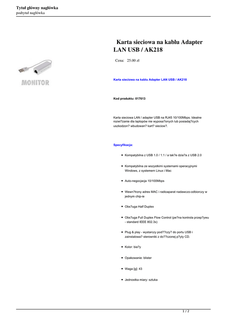 Tytuł główny nagłówka podtytuł nagłówka Karta sieciowa na kablu Adapter LAN USB / AK218 Cena: 25.00 zł Karta sieciowa na kablu Adapter LAN USB / AK218 Kod produktu: 017613 Karta sieciowa LAN / adapter USB na RJ45 10/100Mbps. Idealne rozwi?zanie dla laptopów nie wyposa?onych lub posiadaj?cych uszkodzon? wbudowan? kart? sieciow?. Specyfikacja: Kompatybilna z USB 1.0 / 1.1 / a tak?e dzia?a z USB 2.0 Kompatybilna ze wszystkimi systemami operacyjnymi Windows, z systemem Linux i Mac Auto-negocjacja 10/100Mbps Wewn?trzny adres MAC i radioaparat nadawczo-odbiorczy w jednym chip-ie Obs?uga Half Duplex Obs?uga Full Duplex Flow Control (pe?na kontrola przep?ywu - standard IEEE 802.3x) Plug & play - wystarczy pod??czy? do portu USB i zainstalowa? sterowniki z do??czonej p?yty CD. Kolor: bia?y Opakowanie: blister Waga [g]: 43 Jednostka miary: sztuka 1/2 Tytuł główny nagłówka podtytuł nagłówka ZESTAW ZAWIERA: urz?dzenie g?ówne p?yta CD ze sterownikami Szczegóły Długość Rodzaje przyłączy Kable i Przejścia USB - RJ45 sieciowe LAN 2/2 Powered by TCPDF (www.tcpdf.org)