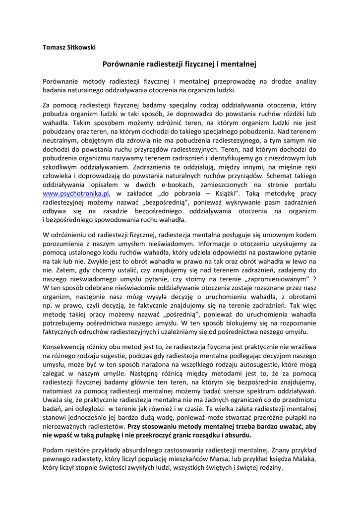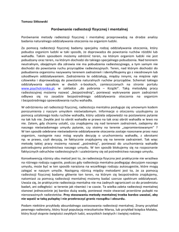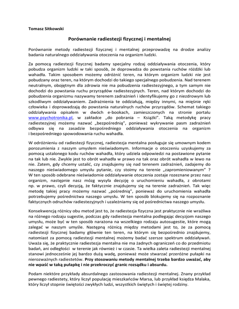 Tomasz Sitkowski Porównanie radiestezji fizycznej i mentalnej Porównanie metody radiestezji fizycznej i mentalnej przeprowadzę na drodze analizy badania naturalnego oddziaływania otoczenia na organizm ludzki. Za pomocą radiestezji fizycznej badamy specjalny rodzaj oddziaływania otoczenia, który pobudza organizm ludzki w taki sposób, że doprowadza do powstania ruchów różdżki lub wahadła. Takim sposobem możemy odróżnić teren, na którym organizm ludzki nie jest pobudzany oraz teren, na którym dochodzi do takiego specjalnego pobudzenia. Nad terenem neutralnym, obojętnym dla zdrowia nie ma pobudzenia radiestezyjnego, a tym samym nie dochodzi do powstania ruchu przyrządów radiestezyjnych. Teren, nad którym dochodzi do pobudzenia organizmu nazywamy terenem zadrażnień i identyfikujemy go z niezdrowym lub szkodliwym oddziaływaniem. Zadrażnienia te oddziałują, między innymi, na mięśnie ręki człowieka i doprowadzają do powstania naturalnych ruchów przyrządów. Schemat takiego oddziaływania opisałem w dwóch e-bookach, zamieszczonych na stronie portalu www.psychotronika.pl, w zakładce „do pobrania – Książki”. Taką metodykę pracy radiestezyjnej możemy nazwać „bezpośrednią”, ponieważ wykrywanie pasm zadrażnień odbywa się na zasadzie bezpośredniego oddziaływania otoczenia na organizm i bezpośredniego spowodowania ruchu wahadła. W odróżnieniu od radiestezji fizycznej, radiestezja mentalna posługuje się umownym kodem porozumienia z naszym umysłem nieświadomym. Informacje o otoczeniu uzyskujemy za pomocą ustalonego kodu ruchów wahadła, który udziela odpowiedzi na postawione pytanie na tak lub nie. Zwykle jest to obrót wahadła w prawo na tak oraz obrót wahadła w lewo na nie. Zatem, gdy chcemy ustalić, czy znajdujemy się nad terenem zadrażnień, zadajemy do naszego nieświadomego umysłu pytanie, czy stoimy na terenie „zapromieniowanym” ? W ten sposób odebrane nieświadomie oddziaływanie otoczenia zostaje rozeznane przez nasz organizm, następnie nasz mózg wysyła decyzję o uruchomieniu wahadła, z obrotami np. w prawo, czyli decyzją, że faktycznie znajdujemy się na terenie zadrażnień. Tak więc metodę takiej pracy możemy nazwać „pośrednią”, ponieważ do uruchomienia wahadła potrzebujemy pośrednictwa naszego umysłu. W ten sposób blokujemy się na rozpoznanie faktycznych odruchów radiestezyjnych i uzależniamy się od pośrednictwa naszego umysłu. Konsekwencją różnicy obu metod jest to, że radiestezja fizyczna jest praktycznie nie wrażliwa na różnego rodzaju sugestie, podczas gdy radiestezja mentalna podlegając decyzjom naszego umysłu, może być w ten sposób narażona na wszelkiego rodzaju autosugestie, które mogą zalegać w naszym umyśle. Następną różnicą między metodami jest to, że za pomocą radiestezji fizycznej badamy głównie ten teren, na którym się bezpośrednio znajdujemy, natomiast za pomocą radiestezji mentalnej możemy badać szersze spektrum oddziaływań. Uważa się, że praktycznie radiestezja mentalna nie ma żadnych ograniczeń co do przedmiotu badań, ani odległości w terenie jak również i w czasie. Ta wielka zaleta radiestezji mentalnej stanowi jednocześnie jej bardzo dużą wadę, ponieważ może stwarzać przeróżne pułapki na nierozważnych radiestetów. Przy stosowaniu metody mentalnej trzeba bardzo uważać, aby nie wpaść w taką pułapkę i nie przekroczyć granic rozsądku i absurdu. Podam niektóre przykłady absurdalnego zastosowania radiestezji mentalnej. Znany przykład pewnego radiestety, który liczył populację mieszkańców Marsa, lub przykład księdza Malaka, który liczył stopnie świętości zwykłych ludzi, wszystkich świętych i świętej rodziny. Bardzo kontrowersyjnymi przykładami zastosowaniem metody mentalnej są ulubione przez niektórych radiestetów pomiary różnych cech fizycznych, takich jak temperatura, ciśnienie, stopień radioaktywności, skład chemiczny, np. badanej wody, itp., itd. Nie ma żadnych dowodów na to, że metoda mentalna nadaje się w ogóle do takich badań. Oznacza to, że nie znane są jakiekolwiek zależności między metodą mentalną a uzyskiwanymi wynikami badań. Co najwyżej można bardzo łatwo pomylić się przy stosowaniu takich badań. Na szczęście jest jednak metoda konfrontacji takich badań mentalnych. Pół biedy zatem, kiedy metodę mentalną stosujemy nierozważnie do badań, których wyniki możemy łatwo sprawdzić za pomocą ogólnie dostępnych mierników: termometru, ciśnieniomierza lub licznika Geigera Millera (dostępne na Allegro). Najwyżej w przypadku naszego błędu możemy bardzo łatwo się ośmieszyć. W przypadku badań składu wody metodą mentalną, trzeba by odżałować trochę pieniędzy, aby wodę oddać do badania do SANEPIDU i sprawdzić wyniki metody mentalnej z oznaczeniami chemicznymi. Gorzej jest, gdy podejmujemy się badań, których wyników nie możemy w żaden sposób sprawdzić, jak np. doboru lekarstw lub żywności korzystnej lub szkodliwej dla człowieka. Tutaj musimy zdać się na wiarę, że uzyskany wynik jest naprawdę prawidłowy. Powstaje pytanie, czy powinniśmy w ogóle decydować się na podejmowanie takich ulubionych przez radiestetów badań, bez możliwości sprawdzenia ich skutku. Podstawą takich badań jest niczym nieograniczona wiara w prawidłowość wyników uzyskanych za pomocą metody mentalnej. Zauważmy, że przekonanie o nieomylności tego rodzaju badań wynika z tego, że stosujemy swoje badania w pojedynkę, bez możliwości konfrontacji z rzeczywistością. Dlatego też każdy uzyskany przez nas wynik jest w naszym pojęciu prawidłowy. Gorzej wypadają badania mentalne, kiedy przeprowadzane są w grupie radiestetów. Jeśli metoda mentalna daje zawsze prawidłowe wyniki, to jej zastosowanie powinno spowodować uzyskanie takich samych wyników badań przez każdego radiestetę z grupy. Niestety tak nie jest. Im
