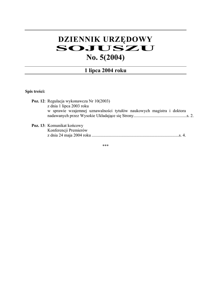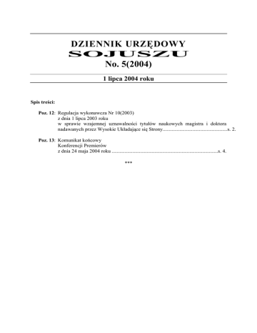 DZIENNIK URZĘDOWY SOJUSZU No. 5(2004) 1 lipca 2004 roku Spis treści: Poz. 12: Regulacja wykonawcza Nr 10(2003) z dnia 1 lipca 2003 roku w sprawie wzajemnej uznawalności tytułów naukowych magistra i doktora nadawanych przez Wysokie Układające się Strony..................................................s. 2. Poz. 13: Komunikat końcowy Konferencji Premierów z dnia 24 maja 2004 roku ..................................................................................s. 4. ∗∗∗ Dziennik Urzędowy Sojuszu No. 5(2004) 1 lipca 2004 roku s. 2 Poz. 12 REGULACJA WYKONAWCZA NR 10(2004) z dnia 1 lipca 2004 roku w sprawie wzajemnej uznawalności tytułów naukowych magistra i doktora nadawanych przez Wysokie Układające się Strony. Art. 1. Tytuły magistra i doktora nadawane przez Wysokie Układające się Strony uznaje się za równoważne. Art. 2. W toku nauczania na poziomie studiów magisterskich ustala się minimalną objętość wykładów w toku nauczania na 30 stron formatu A-4 przy wielkości punktowej czcionki równej 12 punktów. Art. 3. Ustala się dopuszczalne formy egzaminu na poziomie studiów magisterskich na: (1) przesłanie na adres wykładowcy syntezy wykładów i własnych wniosków z ich lektury; (2) odpowiedź na pytania wykładowcy z zakresu poznanego materiału w czasie rzeczywistym za pomocą dowolnych środków technicznych, przy czym zapewniać one muszą możliwość archiwizacji przebiegu egzaminu. Art. 4. 1. Studia doktoranckie może odbyć osoba, która posiada dyplom magisterski tego wydziału, innego wydziału pokrewnego w świecie realnym lub wirtualnym, a uznanym przez Wysokie Układające się Strony. 2. Studia doktoranckie obejmują co najmniej: (1) konsultację z prowadzącym i wybór specjalizacji, (2) zapoznanie się z treścią wskazanych przez wykładowcę ośmiu wykładów obowiązkowych, (3) napisanie przynajmniej jednej pracy z przyjętej specjalizacji, (4) napisanie pracy doktorskiej. 3. Praca doktorska musi mieć objętość co najmniej 5 stron formatu A-4 przy wielkości punktowej czcionki równej 12 i korzystać przynajmniej z pięciu różnych źródeł. Praca musi wnosić nowy aspekt w dziedzinę wydziału, być twórczą interpretacją lub rozwiązaniem ważnego problemu w zakresie specjalizacji. 4. Ministrowie lub szefowie urzędów właściwi do spraw nauki Wysokich Układających się Stron ustalą w drodze umowy międzyrządowej dziedziny pokrewne dla kierunków studiów funkcjonujących na terenie Stron. Art. 5. Dziennik Urzędowy Sojuszu No. 5(2004) 1 lipca 2004 roku s. 3 1. Obrony pracy dyplomowej dokonuje się przed właściwym organem kolegialnym, stosownie do prawa wewnętrznego Wysokich Układających się Stron. 2. Prace dyplomowe publikować należy na ogólnodostępnych stronach internetowych, pozostających w zarządzie władz właściwej uczelni. 3. Autor prac dyplomowych dostaje honorarium w zależności od prawa wewnętrznego uczelni. Art. 6. Cały tok nauczania powinien być zarchiwizowany tak, by możliwa była ocena postępów studenta i zweryfikowanie sposobu prowadzenia nauki. Art. 7. 1. W sprawach nieuregulowanych niniejszą Regulacją system edukacji wyższej funkcjonuje na dotychczasowych zasadach. 2. Ministrowie lub szefowie urzędów właściwi do spraw nauki Wysokich Układających się Stron mogą, w drodze umowy międzyrządowej, dookreślić przebieg studiów, procedurę pisania i obrony prac dyplomowych oraz zasady przyznawania tytułów naukowych magistra i doktora. Art. 8. 1. Tytuły naukowe magistra i doktora nadane przed wejściem w życie niniejszej Regulacji mogą zostać objęte wzajemną uznawalnością tylko w drodze udowodnienia przed organem właściwym odpowiedzialnym za nadawanie tytułów naukowych Wysokich Układających się Stron, że spełnione zostały standardy określone w Regulacji chociaż w stopniu zapewniającym ich porównywalność z przebiegiem studiów drugiej Strony regulacji. 2. Regulacja niniejsza nie może być interpretowana jako zakazująca ustanawiania nowych lub zmiany hierarchii istniejących tytułów naukowych, które to uprawnienia pozostają w wyłącznej dyspozycji Wysokich Układających się Stron i nie wchodzą w zakres właściwości Sojuszu. 3. Jeżeli Wysoka Układająca się Strona zamierza wprowadzić modyfikacje do własnej hierarchii tytułów naukowych, informuje o zakresie projektowanych zmian Stałą Komisję Traktatową w terminie umożliwiającym uwzględnienie zmiany w relacjach między tytułami naukowymi Wysokich Układających się Stron. Przedstawiciel Królestwa Dreamlandu Przedstawiciel Królestwa Scholandii (–) Edward diuk Krieg, Premier, MKiN (–) JKW Filip von Schwaben, KUS, SKT ∗∗∗ Dziennik Urzędowy Sojuszu No. 5(2004) 1 lipca 2004 roku s. 4 Poz. 9 KOMUNIKAT KOŃCOWY KONFERENCJI PREMIERÓW z dnia 11 sierpnia 2003 roku Scholopolis, dn. 24 maja 2004 roku Obywatele Sojuszniczych Królestw! Szanowni Państwo! W niedzielę 23 maja zakończyła się podróż Jego Królewskiej Mości Króla Dreamlandu do Sojuszniczego Królestwa Scholandii. Ze strony Dreamlandu uczestniczył w niej także Edward diuk Krieg, szef rządu Dreamlandu i Marszałek Dworu Królewskiego. Trwająca od środy 19 maja wizyta jest pierwszą międzynarodową podróżą JKM Artura Piotra po wstąpieniu na tron na początku tego roku; nieprzypadkowo jej celem stało się właśnie Królestwo Sojuszników. Jego Królewska Mość Artur Piotr spotkał się w Scholopolis z Jego Majestatem Królem Scholandii Arminem Frederikiem oraz uczestniczył w spotkaniu Gabinetu pod przewodnictwem Premiera Jakuba Lamperskiego, Markgrafa Ticicaca. Podczas tego ostatniego spotkania Ministrowie Królewscy Scholandii zaprezentowali osiągnięcia swoich resortów i odpowiedzieli na wyczerpujące pytania Gościa, odnoszące się do ustroju i systemu politycznego państwa. Ważnym punktem wizyty okazała się również prowadzona za zamkniętymi drzwiami piątkowa rozmowa z Liderem schola