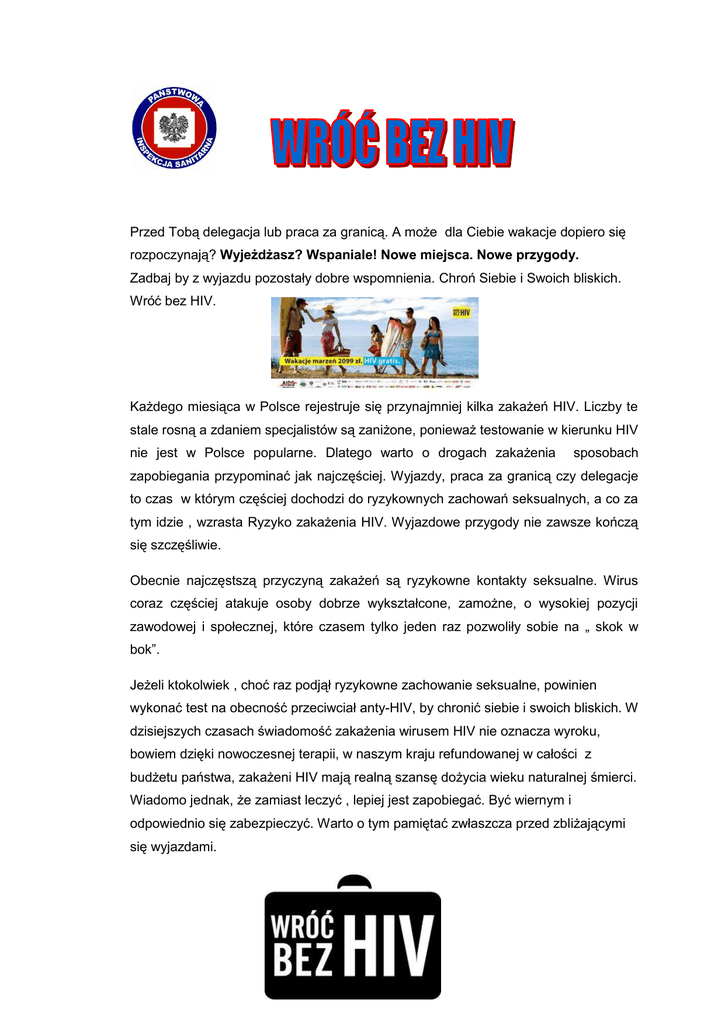 Przed Tobą delegacja lub praca za granicą. A może dla Ciebie wakacje dopiero się rozpoczynają? Wyjeżdżasz? Wspaniale! Nowe miejsca. Nowe przygody. Zadbaj by z wyjazdu pozostały dobre wspomnienia. Chroń Siebie i Swoich bliskich. Wróć bez HIV. Każdego miesiąca w Polsce rejestruje się przynajmniej kilka zakażeń HIV. Liczby te stale rosną a zdaniem specjalistów są zaniżone, ponieważ testowanie w kierunku HIV nie jest w Polsce popularne. Dlatego warto o drogach zakażenia sposobach zapobiegania przypominać jak najczęściej. Wyjazdy, praca za granicą czy delegacje to czas w którym częściej dochodzi do ryzykownych zachowań seksualnych, a co za tym idzie , wzrasta Ryzyko zakażenia HIV. Wyjazdowe przygody nie zawsze kończą się szczęśliwie. Obecnie najczęstszą przyczyną zakażeń są ryzykowne kontakty seksualne. Wirus coraz częściej atakuje osoby dobrze wykształcone, zamożne, o wysokiej pozycji zawodowej i społecznej, które czasem tylko jeden raz pozwoliły sobie na „ skok w bok”. Jeżeli ktokolwiek , choć raz podjął ryzykowne zachowanie seksualne, powinien wykonać test na obecność przeciwciał anty-HIV, by chronić siebie i swoich bliskich. W dzisiejszych czasach świadomość zakażenia wirusem HIV nie oznacza wyroku, bowiem dzięki nowoczesnej terapii, w naszym kraju refundowanej w całości z budżetu państwa, zakażeni HIV mają realną szansę dożycia wieku naturalnej śmierci. Wiadomo jednak, że zamiast leczyć , lepiej jest zapobiegać. Być wiernym i odpowiednio się zabezpieczyć. Warto o tym pamiętać zwłaszcza przed zbliżającymi się wyjazdami. Jak uniknąć zakażenia HIV? używaj tylko własnych przyborów kosmetycznych, np. żyletek i sprzętu do golenia i depilacji, przekłuwaj uszy, wykonuj zabiegi kosmetyczne i tatuaż tylko w specjalistycznych gabinetach, używaj jednorazowych, sterylnych igieł i strzykawek, nie bierz narkotyków i uważaj, żeby ktoś Ci ich nie podał, bądź wierny partnerowi i oczekuj wierności od partnera, nie podejmuj przypadkowych kontaktów seksualnych - nigdy nie masz pewności, czy Twój nowy partner nie jest zakażony HIV, nie podejmuj kontaktów seksualnych pod wpływem alkoholu, pamiętaj, że prezerwatywa zmniejsza ryzyko zakażenia HIV, jeśli zachowałeś się ryzykownie - zrób test na HIV. Źródło KCds. AIDS