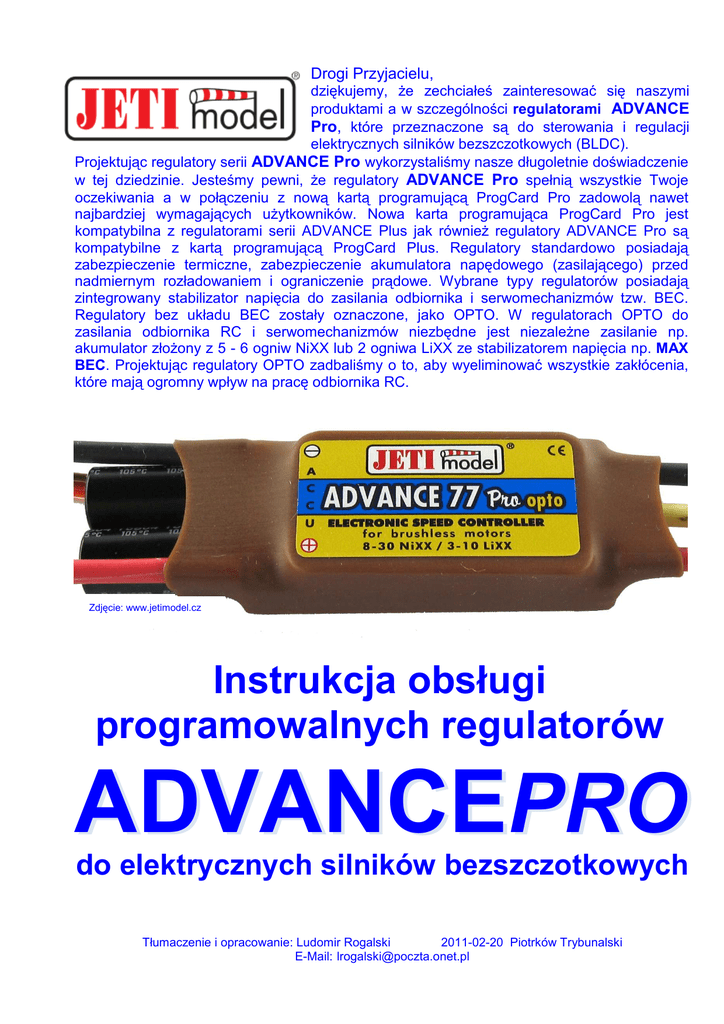Drogi Przyjacielu, dziękujemy, Ŝe zechciałeś zainteresować się naszymi produktami a w szczególności regulatorami ADVANCE Pro, które przeznaczone są do sterowania i regulacji elektrycznych silników bezszczotkowych (BLDC). Projektując regulatory serii ADVANCE Pro wykorzystaliśmy nasze długoletnie doświadczenie w tej dziedzinie. Jesteśmy pewni, Ŝe regulatory ADVANCE Pro spełnią wszystkie Twoje oczekiwania a w połączeniu z nową kartą programującą ProgCard Pro zadowolą nawet najbardziej wymagających uŜytkowników. Nowa karta programująca ProgCard Pro jest kompatybilna z regulatorami serii ADVANCE Plus jak równieŜ regulatory ADVANCE Pro są kompatybilne z kartą programującą ProgCard Plus. Regulatory standardowo posiadają zabezpieczenie termiczne, zabezpieczenie akumulatora napędowego (zasilającego) przed nadmiernym rozładowaniem i ograniczenie prądowe. Wybrane typy regulatorów posiadają zintegrowany stabilizator napięcia do zasilania odbiornika i serwomechanizmów tzw. BEC. Regulatory bez układu BEC zostały oznaczone, jako OPTO. W regulatorach OPTO do zasilania odbiornika RC i serwomechanizmów niezbędne jest niezaleŜne zasilanie np. akumulator złoŜony z 5 - 6 ogniw NiXX lub 2 ogniwa LiXX ze stabilizatorem napięcia np. MAX BEC. Projektując regulatory OPTO zadbaliśmy o to, aby wyeliminować wszystkie zakłócenia, które mają ogromny wpływ na pracę odbiornika RC. Zdjęcie: www.jetimodel.cz Instrukcja obsługi programowalnych regulatorów ADVANCEPRO do elektrycznych silników bezszczotkowych Tłumaczenie i opracowanie: Ludomir Rogalski 2011-02-20 Piotrków Trybunalski E-Mail: [email protected] © 2011 Ludomir Rogals Regulátory ADVANCEPRO PODSTAWOWE PARAMETRY REGULATORÓW ADVANCEPRO Prąd ciągły [A] Napięcie [V] Napięcie BEC [V] Max prąd BEC [A] Gabaryty [mm] Masa [g] Advance 08 Pro Advance 12 Pro 8 12 5 - 15 5 - 15 2 18 30 40 40 70 5 - 15 5 - 15 28x17x5 28x17x7 33x23x9 2/6 4/9 Advance 18 Pro Advance 30 Pro Advance 40 Pro Advance 40 Pro OPTO Advance 70 Pro 5,0 5,0 5,0 Advance 70 Pro OPTO 70 Advance 77 Pro OPTO Advance 90 Pro OPTO 77 90 Advance 18 Pro SB Advance 30 Pro SB 18 30 Advance 40 Pro SB HS 40 70 Typ regulatora Advance 70 Pro SB HS 5 - 15 5 - 25,2 5 - 15 5 – 25,2 6 - 42 12 - 42 5 - 17 5 - 17 5,0 5,0 5,0 5,5 5,5 5 – 25,2 5 – 25,2 5,5 5,5 2 2 2 3 3 2,5 44x26x9 53x26x10 53x26x9 53x26x13 53x26x11 53x26x14 65x55x17 11/21 15/28 18/35 18/35 20/38 20/38 22/40 3 33x23x9 44x26x9 75/90 11/21 15/28 5 53x26x10 18/35 5 53x26x13 20/38 ZALECANA LICZBA OGNIW AKUMULATORA NAPĘDOWEGO Typ regulatora NiXX Li - Ion Li - Pol Li - Fe Advance 08 Pro Advance 12 Pro Advance 18 Pro 6-8 6 - 10 6 - 10 6 - 12 6 - 10 6 - 12 6 - 12 6 - 16 6 - 12 6 - 16 6 - 16 6 - 16 12 - 30 14 - 30 2-3 2-3 2-3 2-4 2-3 2-4 2-4 2-6 2-4 2-6 2-6 2-6 3 - 10 4 - 10 2-3 2-3 2-3 2-4 2-3 2-4 2-4 2-6 2-4 2-6 2-6 2-6 3 - 10 4 - 10 2-3 2-4 2-4 2-4 2-4 2-4 2-4 2-7 2-4 2-7 2-7 2-7 4 - 12 4 - 12 Advance 18 Pro SB Advance 30 Pro Advance 30 Pro SB Advance 40 Pro Advance 40 Pro OPTO Advance 70 Pro Advance 40 Pro SB HS Advance 70 Pro SB HS Advance 70 Pro OPTO Advance 77 Pro OPTO Advance 90 Pro OPTO © 2011 Ludomir Rogalski Regulatory serii ADVANCEPRO 3/15 Regulátory ADVANCEPRO DOPUSZCZALNA MAKSYMALNA LICZBA SERWO MECHANIZMÓW DLA REGULATORÓW Z UKŁADEM BEC Liczba ogniw Maksymalna liczba serwomechanizmów NiXX 1 2 Li-Ion 1 Li-Pol 1 Li-Fe 1 3 4 5 6 7 2 2 3 4 3 4 10 11 12 13 14 15 16 4 5 4 5 6 4 5 Advance 40 Pro Advance 70 Pro 5 6 7 2 4 4 6 2 3 Advance 30 Pro Advance 30 Pro SB Advance 40 Pro SB HS Advance 70 Pro SB HS 9 3 3 2 Advance 08 Pro Advance 12 Pro Advance 18 Pro Advance 18 Pro SB 8 3 5 4 2 3 6 UWAGA! Przy uŜyciu szybkich lub cyfrowych serwomechanizmów naleŜy zmniejszyć ich liczbę. Symbol informujący uŜytkownika, Ŝe produkt spełnia europejskie wymagania w zakresie bezpieczeństwa, ochrony zdrowia, środowiska i konsumenta. EKOLOGICZNY SPOSÓB LIKWIDACJI ODPADÓW. Ten symbol umieszczony na produkcie, w instrukcji obsługi, w uwagach lub/oraz na opakowaniu oznacza, Ŝe zuŜytych urządzeń elektrycznych i elektronicznych nie wolno wyrzucać do odpadów domowych. Muszą być usunięte zgodnie z dyrektywą WEEE 2002/96/EC z dnia 27 stycznia 2003 roku, dotyczącej zuŜytego sprzętu elektronicznego i elektrycznego. Urządzenie naleŜy oddać do odpowiedniego punktu w celu recyklingu. Symbol informujący uŜytkownika o akapitach, w których znajdują się istotne informacje dotyczące bezpieczeństwa, obsługi i konserwacji sprzętu. Symbol ręki z palcem wskazującym zwraca uwagę na informacje, które są szczególnie waŜne dla uŜytkowników regulatorów ADVANCE PRO. ZASADY BEZPIECZEJ EKSPLOATACJI ■ Dokładnie przeczytaj tę instrukcję. Instrukcja ta, jest nieodłączną częścią wyrobu i zawiera wszystkie niezbędne informacje o bezpiecznym uŜytkowaniu urządzenia. Instrukcję przechowuj w dostępnym miejscu tak, aby mieć ją zawsze pod ręką. A jeśli regulator ofiarujesz lub odsprzedasz innej osobie pamiętaj, aby dołączyć równieŜ tę instrukcję. ■ Stosuj tylko nowe, wysokiej klasy pozłacane złącza (polecamy wspaniałe złącza firmy MP JET), które dokładnie przylutuj do przewodów regulatora (uwaŜaj na pozostałości kalafonii na złączach). © 2011 Ludomir Rogalski Regulatory serii ADVANCEPRO 4/15 Regulátory ADVANCEPRO ■ Przewody zasilające (łączące regulator z akumulatorem napędowym) moŜesz przedłuŜać maksymalnie do 20 cm. ■ Zadbaj o to, aby wszystkie przewody były oddalone od odbiornika RC i anteny. ■ Akumulator napędowy podłączaj przed lotem a odłączaj zaraz po wylądowaniu. ■ JeŜeli model nie jest uŜytkowany, zawsze odłączaj akumulator napędowy! W regulatorach OPTO równieŜ odłączaj akumulator zasilający odbiornik i serwomechanizmy! Włączony (przełącznikiem) regulator pobiera z akumulatora zasilającego mały prąd, co moŜe spowodować całkowite rozładowanie i zniszczenie akumulatora! Nigdy nie pozostawiaj be