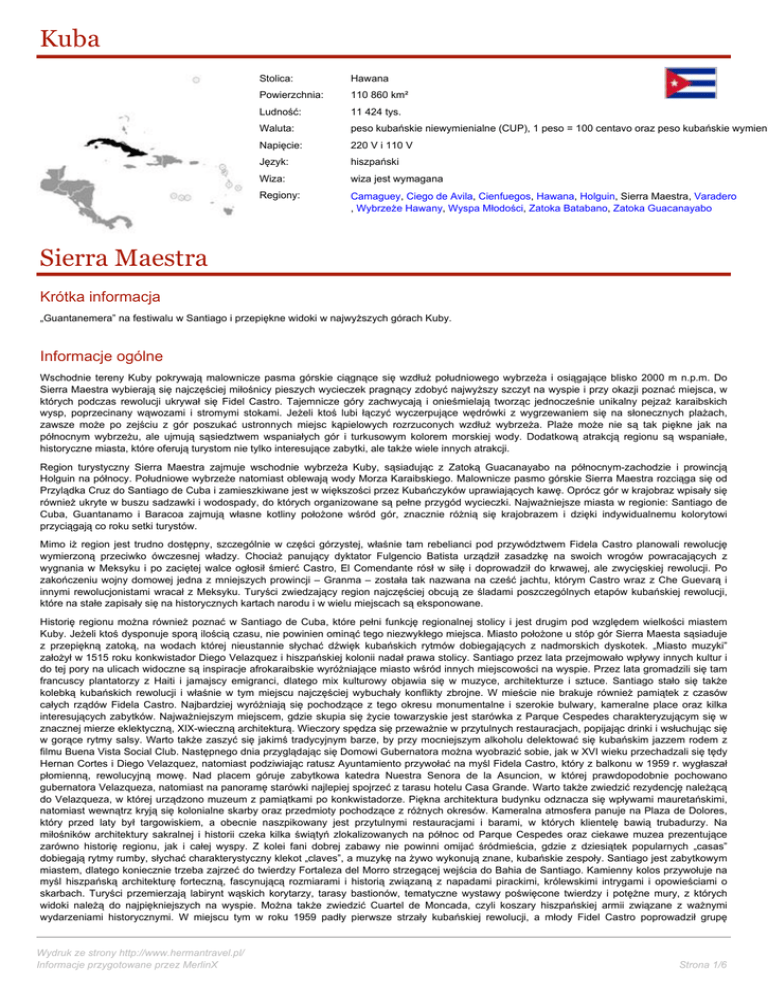 Kuba Stolica: Hawana Powierzchnia: 110 860 km² Ludność: 11 424 tys. Waluta: peso kubańskie niewymienialne (CUP), 1 peso = 100 centavo oraz peso kubańskie wymieni Napięcie: 220 V i 110 V Język: hiszpański Wiza: wiza jest wymagana Regiony: Camaguey, Ciego de Avila, Cienfuegos, Hawana, Holguin, Sierra Maestra, Varadero , Wybrzeże Hawany, Wyspa Młodości, Zatoka Batabano, Zatoka Guacanayabo Sierra Maestra Krótka informacja „Guantanemera” na festiwalu w Santiago i przepiękne widoki w najwyższych górach Kuby. Informacje ogólne Wschodnie tereny Kuby pokrywają malownicze pasma górskie ciągnące się wzdłuż południowego wybrzeża i osiągające blisko 2000 m n.p.m. Do Sierra Maestra wybierają się najczęściej miłośnicy pieszych wycieczek pragnący zdobyć najwyższy szczyt na wyspie i przy okazji poznać miejsca, w których podczas rewolucji ukrywał się Fidel Castro. Tajemnicze góry zachwycają i onieśmielają tworząc jednocześnie unikalny pejzaż karaibskich wysp, poprzecinany wąwozami i stromymi stokami. Jeżeli ktoś lubi łączyć wyczerpujące wędrówki z wygrzewaniem się na słonecznych plażach, zawsze może po zejściu z gór poszukać ustronnych miejsc kąpielowych rozrzuconych wzdłuż wybrzeża. Plaże może nie są tak piękne jak na północnym wybrzeżu, ale ujmują sąsiedztwem wspaniałych gór i turkusowym kolorem morskiej wody. Dodatkową atrakcją regionu są wspaniałe, historyczne miasta, które oferują turystom nie tylko interesujące zabytki, ale także wiele innych atrakcji. Region turystyczny Sierra Maestra zajmuje wschodnie wybrzeża Kuby, sąsiadując z Zatoką Guacanayabo na północnym-zachodzie i prowincją Holguin na północy. Południowe wybrzeże natomiast oblewają wody Morza Karaibskiego. Malownicze pasmo górskie Sierra Maestra rozciąga się od Przylądka Cruz do Santiago de Cuba i zamieszkiwane jest w większości przez Kubańczyków uprawiających kawę. Oprócz gór w krajobraz wpisały się również ukryte w buszu sadzawki i wodospady, do których organizowane są pełne przygód wycieczki. Najważniejsze miasta w regionie: Santiago de Cuba, Guantanamo i Baracoa zajmują własne kotliny położone wśród gór, znacznie różnią się krajobrazem i dzięki indywidualnemu kolorytowi przyciągają co roku setki turystów. Mimo iż region jest trudno dostępny, szczególnie w części górzystej, właśnie tam rebelianci pod przywództwem Fidela Castro planowali rewolucję wymierzoną przeciwko ówczesnej władzy. Chociaż panujący dyktator Fulgencio Batista urządził zasadzkę na swoich wrogów powracających z wygnania w Meksyku i po zaciętej walce ogłosił śmierć Castro, El Comendante rósł w siłę i doprowadził do krwawej, ale zwycięskiej rewolucji. Po zakończeniu wojny domowej jedna z mniejszych prowincji – Granma – została tak nazwana na cześć jachtu, którym Castro wraz z Che Guevarą i innymi rewolucjonistami wracał z Meksyku. Turyści zwiedzający region najczęściej obcują ze śladami poszczególnych etapów kubańskiej rewolucji, które na stałe zapisały się na historycznych kartach narodu i w wielu miejscach są eksponowane. Historię regionu można również poznać w Santiago de Cuba, które pełni funkcję regionalnej stolicy i jest drugim pod względem wielkości miastem Kuby. Jeżeli ktoś dysponuje sporą ilością czasu, nie powinien ominąć tego niezwykłego miejsca. Miasto położone u stóp gór Sierra Maesta sąsiaduje z przepiękną zatoką, na wodach której nieustannie słychać dźwięk kubańskich rytmów dobiegających z nadmorskich dyskotek. „Miasto muzyki” założył w 1515 roku konkwistador Diego Velazquez i hiszpańskiej kolonii nadał prawa stolicy. Santiago przez lata przejmowało wpływy innych kultur i do tej pory na ulicach widoczne są inspiracje afrokaraibskie wyróżniające miasto wśród innych miejscowości na wyspie. Przez lata gromadzili się tam francuscy plantatorzy z Haiti i jamajscy emigranci, dlatego mix kulturowy objawia się w muzyce, architekturze i sztuce. Santiago stało się także kolebką kubańskich rewolucji i właśnie w tym miejscu najczęściej wybuchały konflikty zbrojne. W mieście nie brakuje również pamiątek z czasów całych rządów Fidela Castro. Najbardziej wyróżniają się pochodzące z tego okresu monumentalne i szerokie bulwary, kameralne place oraz kilka interesujących zabytków. Najważniejszym miejscem, gdzie skupia się życie towarzyskie jest starówka z Parque Cespedes charakteryzującym się w znacznej mierze eklektyczną, XIX-wieczną architekturą. Wieczory spędza się przeważnie w przytulnych restauracjach, popijając drinki i wsłuchując się w gorące rytmy salsy. Warto także zaszyć się jakimś tradycyjnym barze, by przy mocniejszym alkoholu delektować się kubańskim jazzem rodem z filmu Buena Vista Social Club. Następnego dnia przyglądając się Domowi Gubernatora można wyobrazić sobie, jak w XVI wieku przechadzali się tędy Hernan Cortes i Diego Velazquez, natomiast podziwiając ratusz Ayuntamiento przywołać na myśl Fidela Castro, który z balkonu w 1959 r. wygłaszał płomienną, rewolucyjną mowę. Nad placem góruje zabytkowa katedra Nuestra Senora de la Asuncion, w której prawdopodobnie pochowano gubernatora Velazqueza, natomiast na panoramę starówki najlepiej spojrzeć z tarasu hotelu Casa Grande. Warto także zwiedzić rezydencję należącą do Velazqueza, w której urządzono muzeum z pamiątkami po konkwistadorze. Piękna architektura budynku odznacza się wpływami mauretańskimi, natomiast wewnątrz kryją się kolonialne skarby oraz przedmioty pochodzące z różnych okresów. Kameralna atmosfera panuje na Plaza de Dolores, który przed laty był targowiskiem, a obecnie naszpikowany jest przytulnymi restauracjami i barami, w których klientelę bawią trubadurzy. Na miłośników architektury sakralnej i historii czeka kilka świątyń zlokalizowanych na północ 