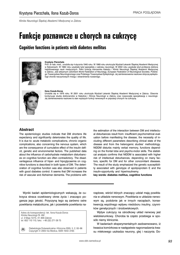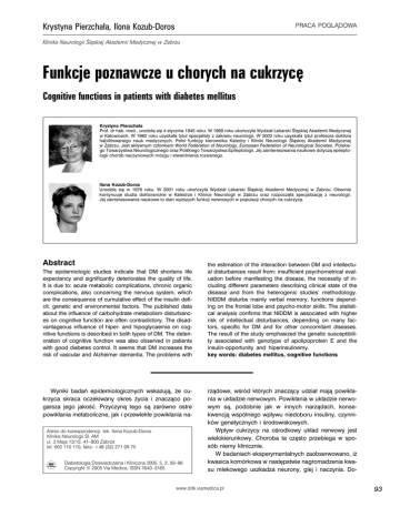 Krystyna Pierzchała, Ilona Kozub-Doros PRACA POGLĄDOWA Klinika Neurologii Śląskiej Akademii Medycznej w Zabrzu Funkcje poznawcze u chorych na cukrzycę Cognitive functions in patients with diabetes mellitus Krystyna Pierzchała Prof. dr hab. med., urodziła się 4 stycznia 1945 roku. W 1968 roku ukończyła Wydział Lekarski Śląskiej Akademii Medycznej w Katowicach. W 1982 roku uzyskała tytuł specjalisty z zakresu neurologii. W 2002 roku uzyskała tytuł profesora doktora habilitowanego nauk medycznych. Pełni funkcję kierownika Katedry i Kliniki Neurologii Śląskiej Akademii Medycznej w Zabrzu. Jest aktywnym członkiem World Federation of Neurology, European Federation of Neurological Societes, Polskiego Towarzystwa Neurologicznego oraz Polskiego Towarzystwa Epileptologii. Jej zainteresowania naukowe dotyczą epileptologii chorób naczyniowych mózgu i stwardnienia rozsianego. Ilona Kozub-Doros Urodziła się w 1976 roku. W 2001 roku ukończyła Wydział Lekarski Śląskiej Akademii Medycznej w Zabrzu. Obecnie kontynuuje studia doktoranckie w Katedrze i Klinice Neurologii w Zabrzu oraz rozpoczęła specjalizację z neurologii. Jej zainteresowania naukowe to stan wyższych funkcji nerwowych w populacji chorych na cukrzycę. Abstract The epidemiologic studies indicate that DM shortens life expectancy and significantly deteriorates the quality of life. It is due to: acute metabolic complications, chronic organic complications, also concerning the nervous system, which are the consequence of cumulative effect of the insulin deficit, genetic and environmental factors. The published data about the influence of carbohydrate metabolism disturbances on cognitive function are often contradictory. The disadvantageous influence of hiper- and hipoglycaemia on cognitive functions is described in both types of DM. The deterioration of cognitive function was also observed in patients with good diabetes control. It seems that DM increases the risk of vascular and Alzheimer dementia. The problems with Wyniki badań epidemiologicznych wskazują, że cukrzyca skraca oczekiwany okres życia i znacząco pogarsza jego jakość. Przyczyną tego są zarówno ostre powikłania metaboliczne, jak i przewlekłe powikłania naAdres do korespondencji: lek. Ilona Kozub-Doros Klinika Neurologii Śl. AM ul. 3 Maja 13/15, 41–800 Zabrze tel. 602 110 110, faks: +48 (32) 271 09 75 Diabetologia Doświadczalna i Kliniczna 2005, 5, 2, 93–96 Copyright © 2005 Via Medica, ISSN 1643–3165 the estimation of the interaction between DM and intellectual disturbances result from: insufficient psychometrical evaluation before manifesting the disease, the necessity of including different parameters describing clinical state of the disease and from the heterogenic studies’ methodology. NIDDM disturbs mainly verbal memory, functions depending on the frontal lobe and psycho-motor skills. The statistical analysis confirms that NIDDM is associated with higher risk of intellectual disturbances, depending on many factors, specific for DM and for other concomitant diseases. The result of the study emphasized the genetic susceptibility associated with genotype of apolipoprotein E and the insulin-opportunity and hiperinsulinemy. key words: diabetes mellitus, cognitive functions rządowe, wśród których znaczący udział mają powikłania w układzie nerwowym. Powikłania w układzie nerwowym są, podobnie jak w innych narządach, konsekwencją wspólnego wpływu niedoboru insuliny, czynników genetycznych i środowiskowych. Wpływ cukrzycy na ośrodkowy układ nerwowy jest wielokierunkowy. Choroba ta często przebiega w sposób niemy klinicznie. W badaniach eksperymentalnych zaobserwowano, iż kwasica komórkowa w następstwie nagromadzenia kwasu mlekowego uszkadza neurony, glej i naczynia. Do- www.ddk.viamedica.pl 93 Diabetologia Doświadczalna i Kliniczna rok 2005, tom 5, nr 2 chodzi do nadmiernej stymulacji receptorów NMDA. W hiperglikemii upośledzeniu ulega transport czynny przez barierę krew–mózg oraz błonę komórkową neuronów i gleju. Dotyczy to choliny (prekursora acetylocholiny — ważnego neurotransmitera dla procesów pamięci), lecz także sodu, potasu z obniżeniem aktywności ATP-azy sodowo-potasowej. W badaniach eksperymentalnych i autopsyjnych udowodniono również obecność zaburzeń dotyczących innych neurotransmiterów (noradrenaliny, serotoniny i dopaminy). Ponadto u chorych na cukrzycę zaobserwowano zaburzenia przepływu krwi w naczyniach mózgowych i upośledzoną reaktywność naczyń mózgowych, co ma istotne znaczenie dla funkcjonowania tkanki nerwowej. W badaniach eksperymentalnych zaobserwowano, że w hipoglikemii dochodzi do uszkodzenia 3. i 5. warstwy kory mózgu, hipokampa oraz jądra ogoniastego. W eksperymencie przeprowadzonym na zwierzętach dowiedziono, że neurony tych okolic obumierają 2–8 godzin po wystąpieniu incydentu ostrej hipoglikemii. Tak więc nawet nieznaczne zaburzenia metabolizmu neurocytu, regulacji neuroprzekaźników oraz krążenia krwi mogą doprowadzić do różnie nasilonej encefalopatii, której objawami, oprócz dysfunkcji ruchowych, są także zaburzenia emocjonalne i intelektualne o różnym stopniu nasilenia. Pierwsze prace na temat wpływu cukrzycy na funkcje intelektualne opublikowali Mills i Root prawie 80 lat temu [1], zwracając uwagę na gorszą pamięć, osłabienie umiejętności arytmetycznych i niewydolność psychoruchową u chorych na cukrzycę. W ostatnich latach badacze skoncentrowali się na sposobach uzyskiwania prawie normoglikemii oraz ocenie subtelnych zmian w funkcjonowaniu ośrodkowego układu nerwowego, w tym również zaburzeń intelektualnych i emocji. Opublikowane dane są często sprzeczne w ocenie wpływu zaburzeń gospodarki węglowodanowej na funkcje poznawcze. Wielu autorów w obserwacjach klinicznych zwraca uwagę na niekorzystny wpływ zarówno hiperglikemii, jak i ciężkich epizodów hipoglikemii [2–6]. Obserwacje te 