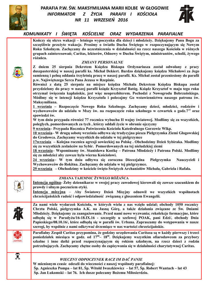 PARAFIA P.W. ŚW. MAKSYMILIANA MARII KOLBE W GŁOGOWIE INFORMATOR Z ŻYCIA PARAFII I KOŚCIOŁA NR 11 WRZESIEŃ 2016 KOMUNIKATY I ŚWIĘTA KOŚCIELNE ORAZ WYDARZENIA PARAFIALNE Kończy się okres wakacji – letniego wypoczynku dla dzieci i młodzieży. Dziękujemy Panu Bogu za szczęśliwie przeżyte wakacje. Prosimy o światło Ducha Świętego w rozpoczynającym się Nowym Roku Szkolnym. Zachęcamy do uczestniczenia w działalności na rzecz naszego Kościoła w różnych grupach zainteresowań; Caritas, lektorów, Odnowy w Duchu Świętym, ministrantów, scholii, żywego różańca. ZMIANY PERSONALNE Z dniem 25 sierpnia Dekretem Księdza Biskupa Ordynariusza został odwołany z pracy duszpasterskiej w naszej parafii ks. Michał Dekiert. Bardzo dziękujemy księdzu Michałowi za Jego sumienną i pełną oddania trzyletnią pracę w naszej parafii. Ks. Michał został przeniesiony do parafii p.w. Najświętszego Serca Pana Jezusa w Rzepinie. Również z datą 25 sierpnia na miejsce księdza Michała Dekretem Księdza Biskupa został przydzielony do pracy w naszej parafii ksiądz Krzysztof Batóg. Ksiądz Krzysztof w maju tego roku otrzymał święcenia kapłańskie, jest więc neoprezbiterem. Pochodzi z Nowogrodu Bobrzańskiego. Módlmy się w intencji księdza Krzysztofa i polecajmy Go wstawiennictwu naszego patrona św. Maksymiliana. 1 września – Rozpoczęcie Nowego Roku Szkolnego. Zachęcamy dzieci, młodzież, rodziców i wychowawców do udziału w Mszy św. na rozpoczęcie roku szkolnego w czwartek o godz.7 15 oraz spowiedzi św. W tym dniu przypada również 77 rocznica wybuchu II wojny światowej. Modlimy się za wszystkich, poległych, pomordowanych za tych , którzy oddali życie w obronie ojczyzny 9 września– Przypada Rocznica Poświecenia Kościoła Katedralnego Gorzowie Wlkp. 10 września– W drugą sobotę września odbywa się tradycyjna piesza Pielgrzymka Ziemi Głogowskiej do Grodowca. Zachęcamy wszystkich do udziału w tej pielgrzymce 17września – Kolejna rocznica agresji sowieckiej na Polskę . Obchodzimy Dzień Sybiraka. Modlimy się za wszystkich zesłańców na Sybir. Pomordowanych na tej nieludzkiej ziemi 18 września– Wspominamy św. Stanisława Kostkę – Patrona Młodzieży i Patrona Polski. Modlimy się za młodzież aby zawsze była wierna Kościołowi. 24 września– W tym dniu odbywa się coroczna Diecezjalna Pielgrzymka Nauczycieli i Wychowawców do Rokitna. Zachęcamy do udziału w tej pielgrzymce. 29 września – Obchodzimy w kościele święto Świętych Archaniołów Michała, Gabriela i Rafała. ZMIANA TAJEMNIC ŻYWEGO RÓŻAŃCA Intencja ogólna- Żeby dziennikarze w swojej pracy zawodowej kierowali się zawsze szacunkiem do prawdy i silnym poczuciem etyki. Intencja misyjna – Aby Światowy Dzień Misyjny odnowił we wszystkich wspólnotach chrześcijańskich radość i odpowiedzialność związaną z głoszeniem Ewangelii. Za nami wiele wydarzeń Kościoła, w których wielu z nas wzięło udział; obchody 1050 rocznicy Chrztu Polski, pielgrzymka A.K. na Jasną Górę, a także działania związane ze Św. Dniami Młodzieży. Dziękujemy za zaangażowanie. Przed nami nowe wyzwania; rekolekcje formacyjne, które odbędą się w Paradyżu/16-18.IX.16 - szczegóły u szefowej POAK, pani Edzi/, obchody Dnia Papieskiego/08.10.16/, które odbędą się w parafii św. Urbana. Zapraszamy do wstępowania w nasze szeregi, by wspólnie z nami odkrywać drzemiące w nas wartości chrześcijańskie. Parafialny Zespół Caritas przypomina, że godziny urzędowania Caritasu są w każdy pierwszy i trzeci poniedziałek miesiąca w godz. od 1700– 1800. Dziękujemy wszystkim ofiarodawcom za przybory szkolne i inne datki przed rozpoczynającym się rokiem szkolnym, na rzecz dzieci z rodzin potrzebujących. Zachęcamy chętne osoby do zapisywania się w działalności charytatywnej Caritas. WIECZNY ODPOCZYNEK RACZ IM DAĆ PANIE W mienionym czasie odeszli do wieczności z naszej wspólnoty parafialnej: Śp. Agnieszka Pompa – lat 81, Śp. Witold Iwaszkiewicz – lat 57, Śp. Robert Wantuch – lat 43 Śp. Jan Łukomski – lat 76. Ich dusze polecamy Bożemu Miłosierdziu. K O M E N T A R Z E WIEM 1. 2. 3. 4. 5. W CO WIERZĘ PIĘĆ PRZYKAZAŃ KOŚCIELNYCH W niedzielę i święta nakazane we Mszy świętej uczestniczyć i powstrzymać się od prac niekoniecznych. Przynajmniej raz w roku przystąpić do Sakramentu Pokuty. Przynajmniej raz w roku w okresie wielkanocnym , przyjąć Komunie świętą . Zachowywać nakazane posty i wstrzemięźliwość od pokarmów mięsnych , a w czasie Wielkiego Postu powstrzymać się od udziału w zabawach. troszczyć się o potrzeby wspólnoty Kościoła PIERWSZE PRZYKAZANIE KOŚCIELNE Na terytorium Polski, świętami nakazanymi poza niedzielami są: 1.stycznia – Uroczystość Świętej Bożej Rodzicielki Maryi 6.stycznia – Uroczystość Objawienia Pańskiego Czwartek po Uroczystości Trójcy Świętej – Uroczystość Najświętszego Ciała i Krwi Chrystusa- Boże Ciało 15. sierpnia – Uroczystość Wniebowzięcia N.M.P. 1. listopada – Uroczystość Wszystkich Świętych 25. grudnia – Uroczystość Bożego Narodzenia. W niedzielę oraz inne dni świąteczne nakazane wierni są zobowiązani uczestniczyć we Mszy świętej oraz powstrzymać się od wykonywania prac niekoniecznych, czyli tych prac i zajęć, które utrudniają : oddawanie Bogu czci, przeżywanie radości właściwej dniowi świątecznemu, korzystanie z należytego odpoczynku duchowego i fizycznego. Nakazowi uczestniczenia we Mszy świętej czyni zadość ten, kto bierze w niej udział, gdziekolwiek jest odprawiana w obrządku Katolickim, bądź w sam dzień świąteczny, bądź też wieczorem dnia poprzedzającego / zob. kan. 1248 KPN / Jeżeli z braku kapłana lub z innej poważnej przyczyny nie można uczestniczyć w Eucharystii zaleca się bardzo, ażeby wierni brali udział w liturgii Słowa, gdy jest ona odprawiana w kościele parafialnym