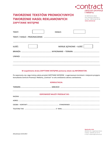 TWORZENIE TEKSTÓW PROMOCYJNYCH TWORZENIE HASEŁ REKLAMOWYCH ZAPYTANIE WSTĘPNE TEKST: 43-300 Bielsko-Biała Plac Świętego Mikołaja 5 tel./fax: +48 33 816 54 48 www.contract.pl HASŁO: TEKST / HASŁO - PRZEZNACZENIE: ..................................................................................................... ............................................................................................................................................................. ILOŚĆ: WERSJE JĘZYKOWE – ILOŚĆ: BRANŻA: ....................................................... WYKONANIE – TERMIN: ............................................... UWAGI: ............................................................................................................................................... ............................................................................................................................................................. W wypełnianiu druku ZAPYTANIE WSTĘPNE pomocny okaże się INFORMATOR. Po zapoznaniu się z jego treścią należy przesłać ZAPYTANIE WSTĘPNE z sugerowanym terminem i miejscem przyjęcia konsultanta Centrum Promocji i Reklamy „Contract” w celu omówienia zakresu zamówienia. KONSULTACJA: TERMIN: ........................................................ MIEJSCE: ....................................................................... ODPOWIEDŹ NALEŻY PRZESŁAĆ DO: NAZWA: ............................................................................................................................................................................. ADRES: ............................................................................................................................................................................... OSOBA – KONTAKT:................................................................... STANOWISKO: ............................................................... TELEFON/ FAX: ................................................................... E- MAIL:................................................................................. Aktualizacja 22.03.2013 Agnieszka Luke dyrektor ds. organizacji biura mobile: +48 663 14 14 73 e-mail: [email protected] TWORZENIE TEKSTÓW PROMOCYJNYCH TWORZENIE HASEŁ REKLAMOWYCH 43-300 Bielsko-Biała Plac Świętego Mikołaja 5 tel./fax: +48 33 816 54 48 www.contract.pl ZAPYTANIE WSTĘPNE - WZÓR TAK TEKST: HASŁO: TAK TEKST / HASŁO - PRZEZNACZENIE: TEKSTY DO DRUKÓW REKLAMOWYCH DLA GOŚCI RESTAURACJI ORAZ NA STRONĘ WWW. – HASŁA DO ULOTEK I OGŁOSZEŃ PRASOWYCH ............................................................................................................................................................. 10 / 3 ILOŚĆ: WERSJE JĘZYKOWE – ILOŚĆ: 1 (3) BRANŻA: GASTRONOMIA WYKONANIE – TERMIN: DO POŁOWY MARCA 2012 ........ UWAGI: TRZY HASŁA REKLAMOWE PROSILIBYŚMY STWORZYĆ NIECO WCZEŚNIEJ – DO KOŃCA LUTEGO 2012 ZE WZGLĘDU NA PROMOCJĘ NASZYCH USŁUG W PRASIE ............................................................................................................................................................. W wypełnianiu druku ZAPYTANIE WSTĘPNE pomocny okaże się INFORMATOR. Po zapoznaniu się z jego treścią należy przesłać ZAPYTANIE WSTĘPNE z sugerowanym terminem i miejscem przyjęcia konsultanta Centrum Promocji i Reklamy „Contract” w celu omówienia zakresu zamówienia. KONSULTACJA: TERMIN: POMIĘDZY 20 -25.01 2012 MIEJSCE: „CONTRACT” – BIURO, PO POŁUDNIU ODPOWIEDŹ NALEŻY PRZESŁAĆ DO: NAZWA: RESTAURACJA „BALANGA” .................................................................................................................................. ADRES: 48-884 BŁAWATKI, ul. Pod Górkę 10 ..................................................................................................................... OSOBA – KONTAKT: Bronisław Kordetzki .................. STANOWISKO: właściciel ................................................................ TELEFON/ FAX: +48 668 99 88 17 Aktualizacja 14.08.2013 E- MAIL: [email protected] Agnieszka Luke dyrektor ds. organizacji biura mobile: +48 663 14 14 73 e-mail: [email protected] TWORZENIE TEKSTÓW PROMOCYJNYCH TWORZENIE HASEŁ REKLAMOWYCH ZAMÓWIENIE ZLECENIODAWCA – NAZWA: ............................................................................................................................................................ OSOBA ZLECAJĄCA: ............................................................ STANOWISKO: ................................................................................... ADRES: ........................................................................................................................... NIP: ......................................................... TEL./FAX: ................................................ E-MAIL: .................................................. WWW: ......................................................... OSOBA – KONTAKT: ............................................................... TEL./MOBILE: ................................ E-MAIL: ................................... TEKST – ILOŚĆ: HASŁO – ILOŚĆ: MATERIAŁY POMOCNICZE: OPIS: DOSTARCZENIE: do dnia: ..................................................................................................................... bezpośrednio: ..................................................................................................................... e-mail: ..................................................................................................................... inne: ..................................................................................................................... AUTORYZACJA : KOSZTORYS: DOSTARCZENIE DO DNIA: AKCEPTACJA DO DNIA: TEKSTY - OGÓŁEM: ………………… zł netto , ……………...... zł brutto HASŁA - OG