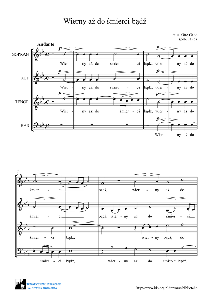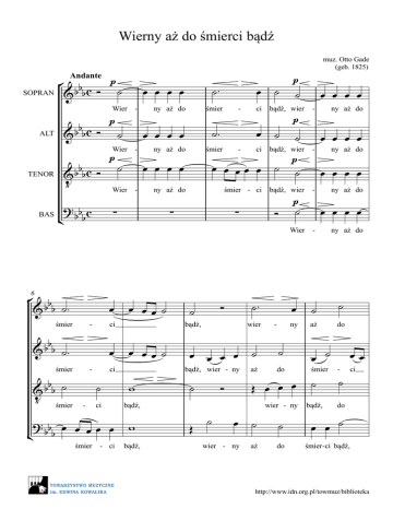 Wierny aż do śmierci bądź ° b SOPRAN & b b c Ó Andante ALT TENOR b & b bc Ó b & b bc Ó ‹ ?bc BAS ¢ bb ° b & b b ˙™ Wier p - - Wier - ˙ ci b & b b ˙™ œ śmier - - ci œ œ œ œ ny aż do śmier - ny aż do śmier - ny aż do œ œœ˙ œ œœ˙ ci bądź, w bądź, ci œ ˙ ci śmier - ci ∑ bądź, œ œ œ œ ˙ bądź, wier - ny ˙ Œ Ó ˙ aż - ˙ ˙ aż ny aż do - œ ˙ do ny aż do œ œ œ œ Wier ˙ ny aż do - ˙ ny œ œ œ œ œ œ œ œ p wier - ny wier - ny - p Œ œ œ œ œ ˙ - œ œ œ œ p bądź, wier Ó wier ˙ bądź, wier ˙™ Ó ˙ p bądź, wier œ œ œœ œ ˙ ∑ w - ci œ ˙ ˙™ œ œ œ œ œ œ œ œ ˙ ?b œ œ œœ œ ¢ bb śmier ˙ - Wier p œ śmier ˙ ˙™ ∑ 6 b &b b ˙ ‹ śmier p muz. Otto Gade (geb. 1825) aż œ ˙ śmier ˙ bądź, ny aż do ˙ do - ˙ œœ ci do ˙ œ œ ˙ do śmier - ci bądź, http://www.idn.org.pl/towmuz/biblioteka ° b &b b ˙ 2 11 œ ˙ œ œ œ ˙ œœ œ œ œ śmier - b &b b ci, do śmier - ci ˙ œ œ ˙ œœ œ ˙™ bądź, do śmier - ci b œ œœ œ œ ˙ ˙ b & b ‹ śmier - ci, do śmier - ci ?b ˙ ¢ bb ˙ ˙ do ° b ˙ &b b bądź, bądź, œ do śmier - ci ˙ ˙ b œ ˙ œ ˙ &b b ‹ bądź, wier - ny bą ˙ ˙ ny ˙ bądź, wier - ny aż œ Œ Ó do œ œœ œ œ ˙ do śmier ˙ ˙™ do śmier œ œ™ œ ˙ œ œ œ J do bądź, wier - ny wier œ - œ œ ˙ œœ - śmier - ˙ ˙ cresc. ˙ accel. Œ œ ˙™ a zys - Œ œ œ bœ b˙ ˙ śmier - ci wier - ny ci wier - ny ˙ dar, ˙™ bądź, ˙ œ ˙ œ n˙ ™ a zys bez- Œ œ nœ œ a zys - kasz Œ œ nœ œ ˙ ˙ Œ œ kasz dar, ˙ a zys - kasz dar, a zys - kasz ci śmier - ci Œ œ œ bœ b˙ bądź, ci wier - ny bądź, do ny bądź, w ˙ - ˙ œ œœ œ œ œ ˙ œ œ ˙ Ó bądź, - ądź, œ n˙ b˙ œ ˙ bądź, wier - ny bądź, œœ ˙™ ˙ wier - ?b œ ˙ ¢ bb ˙ śmier - ci 17 b &b b ˙ bądź, wier - ny bądź, ˙ ˙ a zys - kasz dar, - œ ˙™ œ kasz dar, bez- http://www.idn.org.pl/towmuz/biblioteka ° b ˙™ &b b 23 œ œ œ nœ œ œ œ œ œ œ ˙ œ J J œ cen - b &b b ˙ ny dar, ˙ ko œ ˙ cen - - ro - nę ży - wo - ta wiecz - ne ° b œ œ œ &b b œ 29 ko wo b ˙ b & b ‹ - ta ta ˙ wiecz ?b œ œ ˙ ¢ bb wo - ta, wiecz ro - nę ży - wo w œ œ - - ˙ ˙ - go. Wier œ nœ œ ˙ wiecz - ne - œ ˙ - ne ˙ - ne ˙ p ˙ go. Wier - œ ˙ ˙ p - ˙ - go. Wier ˙ Ó go. - go, - ˙ go, Ó Œ œ Ó ży- ˙ ko - œ nœ œ œ ro - nę ży- œœ œ ˙ ˙ ko - ro - nę ży - wo œ œ ˙ n˙ - - - nœ œ - nę ży - wo - ta, p wo - ta wiecz - ne b &b b ˙ œ œ œ ˙ œ œœ œ ˙ ˙ ny dar, œ œ œ œj œj ˙ n˙ b Œ œ œ œ ˙ œœ ˙ b & b ‹ bez - cen - ny dar, ko - ro ? b n˙ ™ ¢ bb ˙ ko - ro - nę ży - wo - ta wiecz - ne Ó ˙ dar, 3 ta, ko - ro œ œ œ œ ˙™ ny aż do śmier œ œ œ œ ˙™ ny aż do śmier - - - ˙ ˙ nę ży - œ ˙ ∑ ˙ p ci bądź. Wier - œ ˙ p ˙ ci bądź. Wier - œ œ œ œ œ nœ œ œ œ ˙ ny aż do - ˙ p śmier - ci bądź. Wier - ∑ Ó ˙ p Wier - http://www.idn.org.pl/towmuz/biblioteka ° b œ œ œ œ ˙ &b b ˙ b &b b œ œ œ œ ˙ ˙ 4 35 ˙ œ œ œ ny aż do śmier - ci b œ œ œ œ b˙ ˙ b & b ‹ ny aż do śmier - ci ny aż do ° b w &b b 41 œ œ dar, œ nœ ˙ ˙™ bądź, a zys - bœ œ œ bœ œ b˙™ śmier - ci œ œ ˙™ a zys - kasz dar, ˙™ - kasz dar, ˙ a zys - kasz dar, bez - cen ?b Œ œ œ œ ¢ bb Œ œ œ œ bw a zys - kasz dar, Œ œ œ œ w p Ó a zys - kasz dar, ˙ œ œbœ ˙ - œ ˙ dar, p Œ œ œ œ w Ó ˙ bądź, a zys - kasz dar, ff ˙ ˙ ko - ro - œ œ nę ˙™ ży - œ ˙ œ ˙™ - ff ˙ ˙ ny dar, ko - ro - œ œ ˙ ˙ wo ff ko - ro œ œœœ œ mój a zys - kasz p Ó œ ˙ bez - cen - ny dar, b &b b Œ œ ˙ b &b b Œ ‹ ˙ ˙ Œ œ œ œ a zys - kasz dar, bądź, ˙ n˙ p œ œ œ w bądź, ny aż do śmier - ci ?b œ œ ˙ ¢ bb p ff ˙ ko - ro ˙ - œ ˙ nę œ - ta ˙ ży - wo - ta ˙ n˙ œ œœ œ nę wo ży - ˙ ˙ nę ży - - œ œœ œ wo - http://www.idn.org.pl/towmuz/biblioteka ° b ™ &b b ˙ 5 47 œ wiecz - ne b &b b œ œ œ œ wiecz œ œ œ ˙ - - ˙ ne - b œ b œ œ œ ˙ & b ‹ ta wiecz - ne ?b œ œ œ œ ¢ bb - ° b &b b ˙ ˙ - ta wiecz - ne Ó ro - Ó pp ˙ ko Ó ˙ nę - ˙ Ó Œ œ ro ∑ - wo - b &b b ˙ ta wiecz - ne œ œ - nę ży - b &b b œ œ ˙ ‹ ro - ?b ¢ bb ˙ wo w - œ œ - - Ó pp Ó b˙ ko w ˙ - ro - œ ta œ œ œ ˙ w w nę ta wiecz - ne ży - wo - ta - - ˙™ - - œ œ w - - ży - - U w œ - ˙ wiecz - ne nę go. wiecz - ne œ œ œ œ - nœ œ U w w ˙™ œ œ œ bœ wo - ko - go, - ży - ˙ 52 œ œ bœ œ go, ˙ ˙ - ˙ go, - - ko ˙ ˙ ˙ w ˙ go, œ œ - pp - go. - U w go. U w w go. http://www.idn.org.pl/towmuz/biblioteka