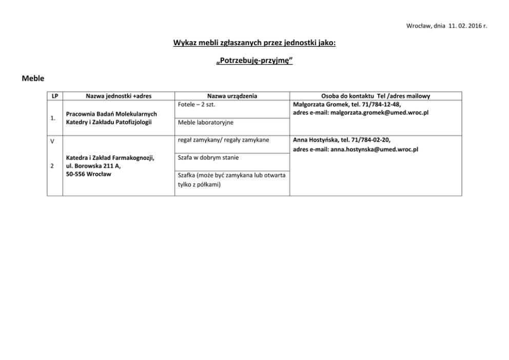 Wrocław, dnia 11. 02. 2016 r. Wykaz mebli zgłaszanych przez jednostki jako: „Potrzebuję-przyjmę” Meble LP 1. Nazwa jednostki +adres Pracownia Badań Molekularnych Katedry i Zakładu Patofizjologii Katedra i Zakład Farmakognozji, ul. Borowska 211 A, 50-556 Wrocław Osoba do kontaktu Tel /adres mailowy Małgorzata Gromek, tel. 71/784-12-48, adres e-mail: [email protected] Meble laboratoryjne regał zamykany/ regały zamykane V 2 Nazwa urządzenia Fotele – 2 szt. Szafa w dobrym stanie Szafka (może być zamykana lub otwarta tylko z półkami) Anna Hostyńska, tel. 71/784-02-20, adres e-mail: [email protected]
