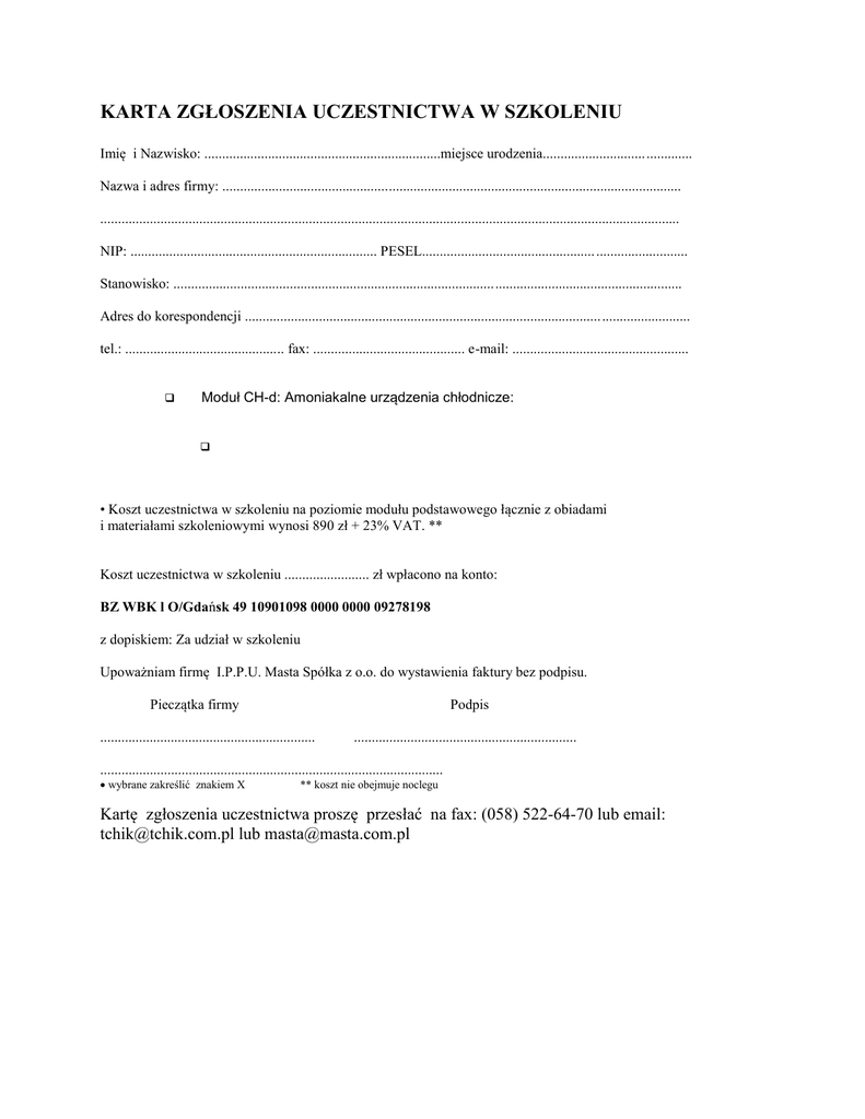 KARTA ZGŁOSZENIA UCZESTNICTWA W SZKOLENIU Imię i Nazwisko: ...................................................................miejsce urodzenia.......................................... Nazwa i adres firmy: .................................................................................................................................. .................................................................................................................................................................... NIP: ...................................................................... PESEL................................................. .......................... Stanowisko: ................................................................................................................................................ Adres do korespondencji ..................................................................................................... ......................... tel.: ............................................. fax: ........................................... e-mail: .................................................. Moduł CH-d: Amoniakalne urządzenia chłodnicze: • Koszt uczestnictwa w szkoleniu na poziomie modułu podstawowego łącznie z obiadami i materiałami szkoleniowymi wynosi 890 zł + 23% VAT. ** Koszt uczestnictwa w szkoleniu ........................ zł wpłacono na konto: BZ WBK l O/Gdańsk 49 10901098 0000 0000 09278198 z dopiskiem: Za udział w szkoleniu Upoważniam firmę I.P.P.U. Masta Spółka z o.o. do wystawienia faktury bez podpisu. Pieczątka firmy Podpis ............................................................. ............................................................... ................................................................................................. wybrane zakreślić znakiem X ** koszt nie obejmuje noclegu Kartę zgłoszenia uczestnictwa proszę przesłać na fax: (058) 522-64-70 lub email: [email protected] lub [email protected]