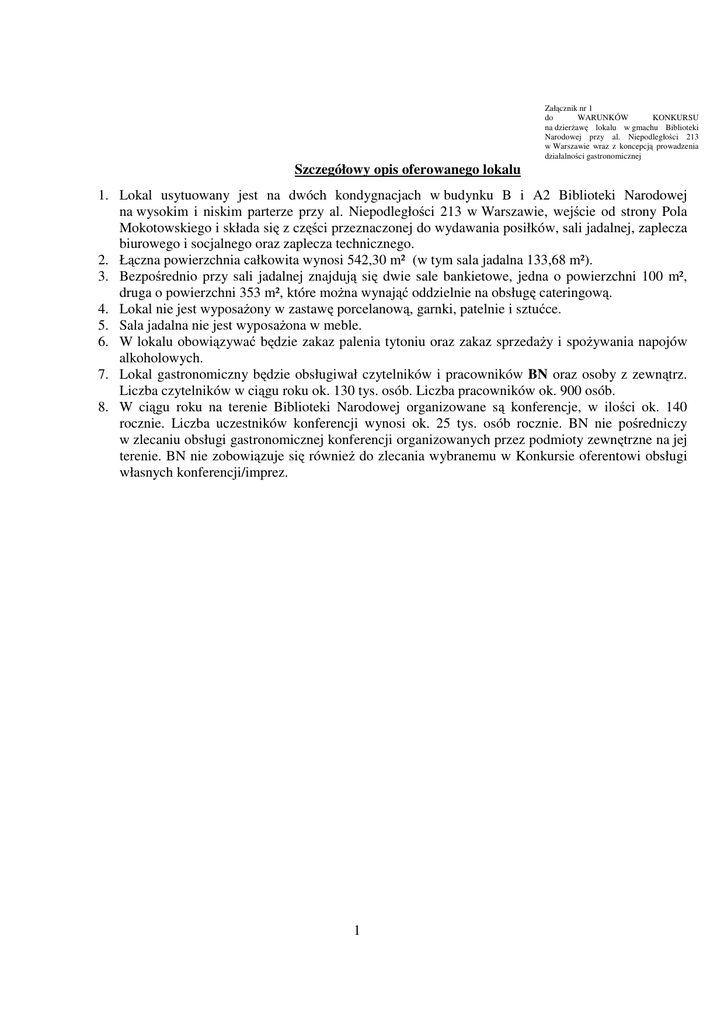 Załącznik nr 1 do WARUNKÓW KONKURSU na dzierżawę lokalu w gmachu Biblioteki Narodowej przy al. Niepodległości 213 w Warszawie wraz z koncepcją prowadzenia działalności gastronomicznej Szczegółowy opis oferowanego lokalu 1. Lokal usytuowany jest na dwóch kondygnacjach w budynku B i A2 Biblioteki Narodowej na wysokim i niskim parterze przy al. Niepodległości 213 w Warszawie, wejście od strony Pola Mokotowskiego i składa się z części przeznaczonej do wydawania posiłków, sali jadalnej, zaplecza biurowego i socjalnego oraz zaplecza technicznego. 2. Łączna powierzchnia całkowita wynosi 542,30 m² (w tym sala jadalna 133,68 m²). 3. Bezpośrednio przy sali jadalnej znajdują się dwie sale bankietowe, jedna o powierzchni 100 m², druga o powierzchni 353 m², które można wynająć oddzielnie na obsługę cateringową. 4. Lokal nie jest wyposażony w zastawę porcelanową, garnki, patelnie i sztućce. 5. Sala jadalna nie jest wyposażona w meble. 6. W lokalu obowiązywać będzie zakaz palenia tytoniu oraz zakaz sprzedaży i spożywania napojów alkoholowych. 7. Lokal gastronomiczny będzie obsługiwał czytelników i pracowników BN oraz osoby z zewnątrz. Liczba czytelników w ciągu roku ok. 130 tys. osób. Liczba pracowników ok. 900 osób. 8. W ciągu roku na terenie Biblioteki Narodowej organizowane są konferencje, w ilości ok. 140 rocznie. Liczba uczestników konferencji wynosi ok. 25 tys. osób rocznie. BN nie pośredniczy w zlecaniu obsługi gastronomicznej konferencji organizowanych przez podmioty zewnętrzne na jej terenie. BN nie zobowiązuje się również do zlecania wybranemu w Konkursie oferentowi obsługi własnych konferencji/imprez. 1 ZESTAWIENIE POWIERZCHNI UŻYTKOWEJ LOKALU GASTRONOMICZNEGO ZNAJDUJĄCEGO SIĘ NA TERENIE BIBLIOTEKI NARODOWEJ W WARSZAWIE Wykaz pomieszczeń - PARTER NISKI Nr. Pom. 01 02 03 04 05 06 07 08 09 010 011 012 013 014 015 016 Pow. użytk. (m2) Nazwa pomieszczenia Klatka schodowa Komunikacja Zmywalnia termosów Magazyn kiszonek Magazyn chłodnia Magazyn prod. suchych Magazyn gospodarczy Magazyn ziemniaków Przygot. Brudna Pom. personelu Wiatrołap Pom. biurowe Magazyn odpadów WC Szatnia 9,17 48,65 8,57 9,91 20,21 16,71 26,63 34,10 16,02 12,59 3,30 20,60 9,26 5,55 16,71 Schowek 0,35 258,33 2,40 Razem Pow. pomocnicza - szyb windowy Wykaz pomieszczeń - PARTER WYSOKI Nr. Pom. 1 2 3 4 5 6 7 8 9 10 Pow. użytk. (m2) 10,47 74,47 4,80 12,01 12,22 19,03 4,73 2,06 5,70 Nazwa pomieszczenia Komunikacja Kuchnia Zmywalnia naczyń kuch. Zmywalnia Kredens Wydawalnia Magazyn WC Magazyn Sala konsumpcyjna 133,68 Razem Pow. pomocnicza - szyb windowy Łączna powierzchnia parter niski + parter wysoki Pow. użytkowa (m2) Pow. pomocnicza (m2) 2 279,17 2,40 537,50 4,80