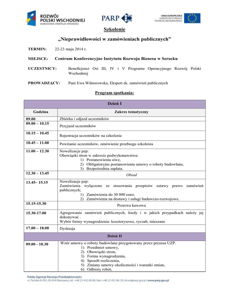 Szkolenie „Nieprawidłowości w zamówieniach publicznych” TERMIN: 22-23 maja 2014 r. MIEJSCE: Centrum Konferencyjne Instytutu Rozwoju Biznesu w Serocku UCZESTNICY: Beneficjenci Osi III, IV i V Programu Operacyjnego Rozwój Polski Wschodniej PROWADZĄCY: Pani Ewa Wiktorowska, Ekspert ds. zamówień publicznych Program spotkania: Dzień I Godzina 09.00 09.00 – 10.15 10.15 – 10.45 Zakres tematyczny Zbiórka i odjazd uczestników Przyjazd uczestników Rejestracja uczestników na szkolenie 10.45 – 11.00 Powitanie uczestników, omówienie przebiegu szkolenia 11.00 – 12.30 Nowelizacje pzp: Obowiązki stron w zakresie podwykonawstwa: 1) Postanowienia siwz, 2) Obligatoryjne postanowienia umowy o roboty budowlane, 3) Bezpośrednia zapłata. 12.30 – 13.45 Obiad 13.45– 15.15 Nowelizacje pzp: Zamówienia wyłączone ze stosowania przepisów ustawy prawo zamówień publicznych; 1) Zamówienia do 30 000 euro; 2) Zamówienia na dostawy i usługi badawczo-rozwojowe. 15.15-15.30 Przerwa kawowa 15.30-17.00 Agregowanie zamówień publicznych, kiedy i w jakich przypadkach należy jej dokonywać . Wybór formy wynagrodzenia: kosztorysowe, ryczałt, mieszane 17.00 – 18.00 Dyskusja Dzień II 09.00 - 10.30 Wzór umowy o roboty budowlane przygotowany przez prezesa UZP. 1) Przedmiot umowy, 2) Obowiązki stron, 3) Forma wynagrodzenia, 4) Sposób rozliczenia, 5) Zmiany umowy okoliczności i warunki zmian, 6) Odbiory robót, 7) Kary umowne, 8) Inne postanowienia. 10.30 – 10.45 10.45 – 12.15 12.15 – 13.15 Przerwa kawowa 1. Art. 144 ustawy pzp, prawidłowe zapisy w zakresie zmian umowy. 2. Roboty zamienne, roboty dodatkowe. 3. Zamówienia dodatkowe. Obiad 14.45 Interes publiczny w rozumieniu art. 145 ustawy pzp. Dopuszczanie rozwiązań równoważnych. Kwalifikowalność wydatków. Przykłady naruszeń pzp na podstawie przykładów kontroli prezesa UZP i kontroli PARP. Zakończenie szkolenia 15.00 Wyjazd uczestników 13.15 – 14.45 1. 2. 3. 4. Szkolenie współfinansowane ze środków Europejskiego Funduszu Rozwoju Regionalnego w ramach Programu Operacyjnego Rozwój Polski Wschodniej 2007-2013 2