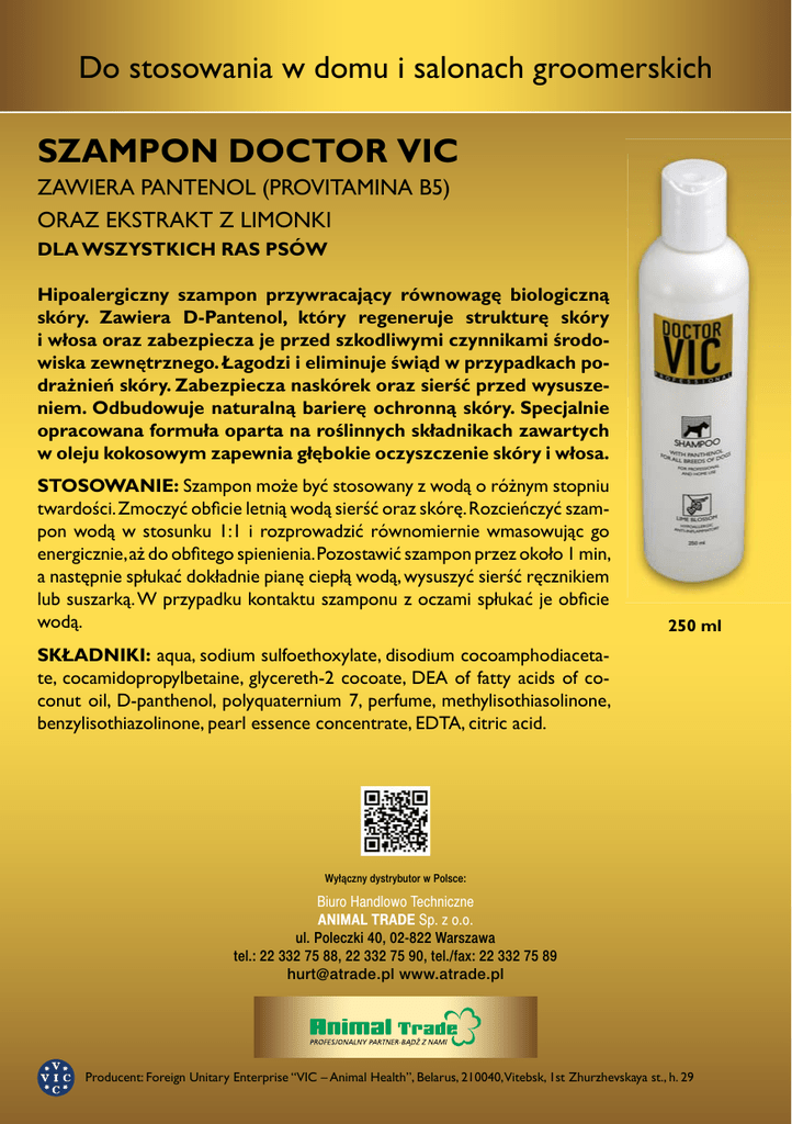 Do stosowania w domu i salonach groomerskich SZAMPON DOCTOR VIC ZAWIERA PANTENOL (PROVITAMINA B5) ORAZ EKSTRAKT Z LIMONKI DLA WSZYSTKICH RAS PSÓW Hipoalergiczny szampon przywracający równowagę biologiczną skóry. Zawiera D-Pantenol, który regeneruje strukturę skóry i włosa oraz zabezpiecza je przed szkodliwymi czynnikami środowiska zewnętrznego. Łagodzi i eliminuje świąd w przypadkach podrażnień skóry. Zabezpiecza naskórek oraz sierść przed wysuszeniem. Odbudowuje naturalną barierę ochronną skóry. Specjalnie opracowana formuła oparta na roślinnych składnikach zawartych w oleju kokosowym zapewnia głębokie oczyszczenie skóry i włosa. STOSOWANIE: Szampon może być stosowany z wodą o różnym stopniu twardości. Zmoczyć obficie letnią wodą sierść oraz skórę. Rozcieńczyć szampon wodą w stosunku 1:1 i rozprowadzić równomiernie wmasowując go energicznie, aż do obfitego spienienia. Pozostawić szampon przez około 1 min, a następnie spłukać dokładnie pianę ciepłą wodą, wysuszyć sierść ręcznikiem lub suszarką. W przypadku kontaktu szamponu z oczami spłukać je obficie wodą. 250 ml SKŁADNIKI: aqua, sodium sulfoethoxylate, disodium cocoamphodiacetate, cocamidopropylbetaine, glycereth-2 cocoate, DEA of fatty acids of coconut oil, D-panthenol, polyquaternium 7, perfume, methylisothiasolinone, benzylisothiazolinone, pearl essence concentrate, EDTA, citric acid. Wyłączny dystrybutor w Polsce: Biuro Handlowo Techniczne ANIMAL TRADE Sp. z o.o. ul. Poleczki 40, 02-822 Warszawa tel.: 22 332 75 88, 22 332 75 90, tel./fax: 22 332 75 89 [email protected] www.atrade.pl Producent: Foreign Unitary Enterprise “VIC – Animal Health”, Belarus, 210040,Vitebsk, 1st Zhurzhevskaya st., h. 29