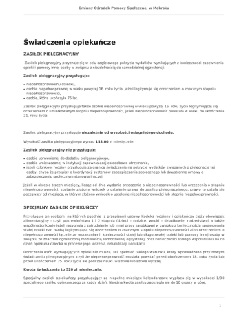 Gminny Ośrodek Pomocy Społecznej w Mokrsku Świadczenia opiekuńcze ZASIŁEK PIELĘGNACYJNY Zasiłek pielęgnacyjny przyznaje się w celu częściowego pokrycia wydatków wynikających z konieczności zapewnienia opieki i pomocy innej osoby w związku z niezdolnością do samodzielnej egzystencji. Zasiłek pielęgnacyjny przysługuje: ● ● ● niepełnosprawnemu dziecku, osobie niepełnosprawnej w wieku powyżej 16. roku życia, jeżeli legitymuje się orzeczeniem o znacznym stopniu niepełnosprawności, osobie, która ukończyła 75 lat. Zasiłek pielęgnacyjny przysługuje także osobie niepełnosprawnej w wieku powyżej 16. roku życia legitymującej się orzeczeniem o umiarkowanym stopniu niepełnosprawności, jeżeli niepełnosprawność powstała w wieku do ukończenia 21. roku życia. Zasiłek pielęgnacyjny przysługuje niezależnie od wysokości osiągniętego dochodu. Wysokość zasiłku pielęgnacyjnego wynosi 153,00 zł miesięcznie. Zasiłek pielęgnacyjny nie przysługuje: ● ● ● osobie uprawnionej do dodatku pielęgnacyjnego, osobie umieszczonej w instytucji zapewniającej całodobowe utrzymanie, jeżeli członkowi rodziny przysługuje za granicą świadczenie na pokrycie wydatków związanych z pielęgnacją tej osoby, chyba że przepisy o koordynacji systemów zabezpieczenia społecznego lub dwustronne umowy o zabezpieczeniu społecznym stanowią inaczej. Jeżeli w okresie trzech miesięcy, licząc od dnia wydania orzeczenia o niepełnosprawności lub orzeczenia o stopniu niepełnosprawności, zostanie złożony wniosek o ustalenie prawa do zasiłku pielęgnacyjnego, prawo to ustala się począwszy od miesiąca, w którym złożono wniosek o ustalenie niepełnosprawności lub stopnia niepełnosprawności. SPECJALNY ZASIŁEK OPIEKUŃCZY Przysługuje on osobom, na których zgodnie z przepisami ustawy Kodeks rodzinny i opiekuńczy ciąży obowiązek alimentacyjny - czyli pokrewieństwo 1 i 2 stopnia (dzieci – rodzice, wnuki – dziadkowie, rodzeństwo) a także współmałżonkowie jeżeli rezygnują z zatrudnienie lub innej pracy zarobkowej w związku z koniecznością sprawowania stałej opieki nad osobą legitymującą się orzeczeniem o znacznym stopniu niepełnosprawności albo orzeczeniem o niepełnosprawności łącznie ze wskazaniami: konieczności stałej lub długotrwałej opieki lub pomocy innej osoby w związku ze znacznie ograniczoną możliwością samodzielnej egzystencji oraz konieczności stałego współudziału na co dzień opiekuna dziecka w procesie jego leczenia, rehabilitacji i edukacji. Orzeczenia osób wymagających opieki nie muszą też spełniać takiego warunku, który wprowadzono przy nowym świadczeniu pielęgnacyjnym, czyli że niepełnosprawność musiała powstać przed ukończeniem 18. roku życia lub przed ukończeniem 25. roku życia ale podczas nauki w szkole lub szkole wyższej. Kwota świadczenia to 520 zł miesięcznie. Specjalny zasiłek opiekuńczy przysługujący za niepełne miesiące kalendarzowe wypłaca się w wysokości 1/30 specjalnego zasiłku opiekuńczego za każdy dzień. Należną kwotę zasiłku zaokrągla się do 10 groszy w górę. 1 Gminny Ośrodek Pomocy Społecznej w Mokrsku Specjalny zasiłek opiekuńczy nie przysługuje, jeżeli: 1) osoba sprawująca opiekę: a) ma ustalone prawo do emerytury, renty, renty rodzinnej z tytułu śmierci małżonka przyznanej w przypadku zbiegu prawa do renty rodzinnej i innego świadczenia emerytalno-rentowego, renty socjalnej, zasiłku stałego, nauczycielskiego świadczenia kompensacyjnego, zasiłku przedemerytalnego lub świadczenia przedemerytalnego, b) ma ustalone prawo do specjalnego zasiłku opiekuńczego, świadczenia pielęgnacyjnego lub zasiłku dla opiekuna, o którym mowa w ustawie z dnia 4 kwietnia 2014 r. o ustaleniu i wypłacie zasiłków dla opiekunów, c) legitymuje się orzeczeniem o znacznym stopniu niepełnosprawności; 2) osoba wymagająca opieki została umieszczona w rodzinie zastępczej, z wyjątkiem rodziny zastępczej spokrewnionej, w rodzinnym domu dziecka albo, w związku z koniecznością kształcenia, rewalidacji lub rehabilitacji, w placówce zapewniającej całodobową opiekę, w tym w specjalnym ośrodku szkolno-wychowawczym, z wyjątkiem podmiotu wykonującego działalność leczniczą, i korzysta w niej z całodobowej opieki przez więcej niż 5 dni w tygodniu; 3) na osobę wymagającą opieki inna osoba ma ustalone prawo do wcześniejszej emerytury; 4) członek rodziny osoby sprawującej opiekę ma ustalone prawo do dodatku do zasiłku rodzinnego, o którym mowa w art. 10, specjalnego zasiłku opiekuńczego, świadczenia pielęgnacyjnego lub zasiłku dla opiekuna, o którym mowa w ustawie z dnia 4 kwietnia 2014 r. o ustaleniu i wypłacie zasiłków dla opiekunów; 5) na osobę wymagającą opieki jest ustalone prawo do dodatku do zasiłku rodzinnego, o którym mowa w art. 10, prawo do specjalnego zasiłku opiekuńczego, prawo do świadczenia pielęgnacyjnego lub prawo do zasiłku dla opiekuna, o którym mowa w ustawie z dnia 4 kwietnia 2014 r. o ustaleniu i wypłacie zasiłków dla opiekunów; 6) na osobę wymagającą opieki inna osoba jest uprawniona za granicą do świadczenia na pokrycie wydatków związanych z opieką, chyba że przepisy o koordynacji systemów zabezpieczenia społecznego lub dwustronne umowy o zabezpieczeniu społecznym stanowią inaczej. Wprowadzono kryterium dochodowe – 764 zł. Postępowanie w sprawie o przyznanie specjalnego zasiłku opiekuńczego wszczyna się na podstawie wniosku o ustalenie prawa do specjalnego zasiłku opiekuńczego, do którego należy dołączyć (między innymi): 1. kserokopia dowodu osobistego wnioskodawcy (oryginał do wglądu). 2. kserokopia dowodu osobistego osoby wymagającej opieki – jeżeli jest pełnoletnia (oryginał do wglądu). 3. kserokopia orzeczenia o niepełnosprawności (oryginał do wglądu): a. w przypadku dzieci do 16 roku życia orzeczenie o zaliczeniu do osó