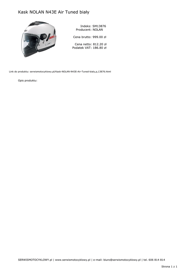 Kask NOLAN N43E Air Tuned biały Indeks: SM13876 Producent: NOLAN Cena brutto: 999.00 zł Cena netto: 812.20 zł Podatek VAT: 186.80 zł Link do produktu: serwismotocyklowy.pl/Kask-NOLAN-N43E-Air-Tuned-bialy,p,13876.html Opis produktu: SERWISMOTOCYKLOWY.pl | www.serwismotocyklowy.pl | e-mail: [email protected] | tel. 606 814 814 Strona 1 z 1