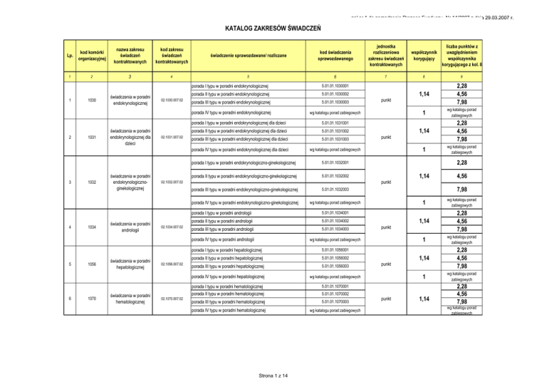 zał.nr 1 do zarządzenia Prezesa Funduszu Nr 14/2007 z dnia 29.03.2007 r. KATALOG ZAKRESÓW ŚWIADCZEŃ Lp. kod komórki organizacyjnej nazwa zakresu świadczeń kontraktowanych kod zakresu świadczeń kontraktowanych 1 2 3 4 1 2 3 4 5 6 1030 1031 1032 1034 1056 1070 świadczenia w poradni endokrynologicznej świadczenia w poradni endokrynologicznej dla dzieci świadczenia w poradni endokrynologicznoginekologicznej świadczenia w poradni andrologii świadczenia w poradni hepatologicznej świadczenia w poradni hematologicznej 02.1030.007.02 02.1031.007.02 świadczenie sprawozdawane/ rozliczane 5 kod świadczenia sprawozdawanego jednostka rozliczeniowa zakresu świadczeń kontraktowanych współczynnik korygujący 6 7 8 9 1,14 2,28 4,56 7,98 1 wg katalogu porad zabiegowych 1,14 2,28 4,56 7,98 1 wg katalogu porad zabiegowych porada I typu w poradni endokrynologicznej 5.01.01.1030001 porada II typu w poradni endokrynologicznej 5.01.01.1030002 porada III typu w poradni endokrynologicznej 5.01.01.1030003 porada IV typu w poradni endokrynologicznej wg katalogu porad zabiegowych porada I typu w poradni endokrynologicznej dla dzieci 5.01.01.1031001 porada II typu w poradni endokrynologicznej dla dzieci 5.01.01.1031002 porada III typu w poradni endokrynologicznej dla dzieci 5.01.01.1031003 porada IV typu w poradni endokrynologicznej dla dzieci wg katalogu porad zabiegowych porada I typu w poradni endokrynologiczno-ginekologicznej 5.01.01.1032001 porada II typu w poradni endokrynologiczno-ginekologicznej 5.01.01.1032002 02.1056.007.02 02.1070.007.02 punkt 2,28 1,14 punkt 02.1032.007.02 02.1034.007.02 punkt porada III typu w poradni endokrynologiczno-ginekologicznej 5.01.01.1032003 porada IV typu w poradni endokrynologiczno-ginekologicznej wg katalogu porad zabiegowych porada I typu w poradni andrologii 5.01.01.1034001 porada II typu w poradni andrologii 5.01.01.1034002 porada III typu w poradni andrologii 5.01.01.1034003 porada IV typu w poradni andrologii wg katalogu porad zabiegowych porada I typu w poradni hepatologicznej 5.01.01.1056001 porada II typu w poradni hepatologicznej 5.01.01.1056002 porada III typu w poradni hepatologicznej 5.01.01.1056003 porada IV typu w poradni hepatologicznej wg katalogu porad zabiegowych porada I typu w poradni hematologicznej 5.01.01.1070001 porada II typu w poradni hematologicznej 5.01.01.1070002 porada III typu w poradni hematologicznej 5.01.01.1070003 porada IV typu w poradni hematologicznej wg katalogu porad zabiegowych Strona 1 z 14 liczba punktów z uwzględnieniem współczynnika korygującego z kol. 8 4,56 7,98 1 wg katalogu porad zabiegowych 1,14 2,28 4,56 7,98 1 wg katalogu porad zabiegowych 1,14 2,28 4,56 7,98 1 wg katalogu porad zabiegowych punkt punkt punkt 1,14 2,28 4,56 7,98 wg katalogu porad zabiegowych Lp. kod komórki organizacyjnej nazwa zakresu świadczeń kontraktowanych 1 2 3 7 8 9 10 11 12 13 14 1071 1080 1210 1240 1241 1242 1244 1270 świadczenia w poradni hematologicznej dla dzieci świadczenia w poradni immunologicznej świadczenia w poradni genetycznej świadczenia w poradni onkologicznej świadczenia w poradni onkologicznej dla dzieci świadczenia w poradni chemioterapii świadczenia w poradni radioterapii świadczenia w poradni gruźlicy i chorób płuc kod zakresu świadczeń kontraktowanych 4 02.1071.007.02 02.1080.007.02 02.1210.007.02 02.1240.007.02 02.1241.007.02 02.1242.007.02 02.1244.007.02 02.1270.007.02 świadczenie sprawozdawane/ rozliczane zał.nr 1 do zarządzenia Prezesa Funduszu Nr 14/2007 z dnia 29.03.2007 r. jednostka liczba punktów z rozliczeniowa kod świadczenia współczynnik uwzględnieniem zakresu świadczeń sprawozdawanego korygujący współczynnika kontraktowanych korygującego z kol. 8 6 5 porada I typu w poradni hematologicznej dla dzieci 5.01.01.1071001 porada II typu w poradni hematologicznej dla dzieci 5.01.01.001002 porada III typu w poradni hematologicznej dla dzieci 5.01.01.1003 porada IV typu w poradni hematologicznej dla dzieci wg katalogu porad zabiegowych porada I typu w poradni immunologicznej 5.01.01.1080001 porada II typu w poradni immunologicznej 5.01.01.1080002 porada III typu w poradni immunologicznej 5.01.01.1080003 porada IV typu w poradni immunologicznej wg katalogu porad zabiegowych porada I typu w poradni genetycznej 5.01.01.1210001 porada II typu w poradni genetycznej 5.01.01.1210002 porada III typu w poradni genetycznej 5.01.01.1210003 porada IV typu w poradni genetycznej wg katalogu porad zabiegowych porada I typu w poradni onkologicznej 5.01.01.1240001 porada II typu w poradni onkologicznej 5.01.01.1240002 porada III typu w poradni onkologicznej 5.01.01.1240003 porada IV typu w poradni onkologicznej wg katalogu porad zabiegowych porada I typu w poradni onkologicznej dla dzieci 5.01.01.1241001 porada II typu w poradni onkologicznej dla dzieci 5.01.01.1241002 porada III typu w poradni onkologicznej dla dzieci 5.01.01.1241003 porada IV typu w poradni onkologicznej dla dzieci wg katalogu porad zabiegowych porada I typu w poradni chemioterapii 5.01.01.1242001 porada II typu w poradni chemioterapii 5.01.01.1242002 porada III typu w poradni chemioterapii 5.01.01.1242003 porada IV typu w poradni chemioterapii wg katalogu porad zabiegowych porada I typu w poradni radioterapii 5.01.01.1244001 porada II typu w poradni radioterapii 5.01.01.1244002 porada III typu w poradni radioterapii 5.01.01.1244003 porada IV typu w poradni radioterapii wg katalogu porad zabiegowych porada I typu w poradni gruźlicy i chorób płuc 5.01.01.1270001 porada II typu w poradni gruźlicy i chorób płuc 5.01.01.1270002 porada III typu w poradni gruźlicy i chorób płuc 5.01.01.1270003 porada IV typu w poradni gruźlicy i chorób płuc wg katalogu porad zabiegowych Strona 2 z 14 7 8 9 1,14 2,28 4,56 7,98 1 wg katalogu porad zabiegowych 1,14 2,28 4,56 7,98 1 wg katalogu porad zabiegowych 1,14 2,28 4,56 7,98 1 wg katalogu porad zabiegowych 1,14 2,28 4,56 7,98 1 wg katalogu porad zabiegowych 1,14 2,28 4,56 7,98 1 w