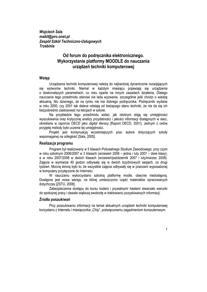 Wojciech Sala [email protected] Zespół Szkół Techniczno-Usługowych Trzebinia Od forum do podręcznika elektronicznego. Wykorzystanie platformy MOODLE do nauczania urządzeń techniki komputerowej Wstęp Urządzenia techniki komputerowej należą do najbardziej dynamicznie rozwijających się wytworów techniki. Niemal w każdym miesiącu pojawiają się urządzenia o doskonalszych parametrach, co roku oparte na innych zasadach działania. Dlatego nauczanie tego przedmiotu stanowi nie lada wyzwanie, szczególnie jeśli chodzi o wiedzę aktualną. Nic dziwnego, że na rynku nie ma dobrego podręcznika. Podręczniki wydane w roku 2000, czy 2001 tak dalece odstają od bieżącego stanu techniki, że nie da się ich bezpośrednio zastosować na lekcjach w szkole. Na przykładzie tego przedmiotu widać, jak istotnym stają się umiejętności wyszukiwania oraz krytycznej analizy przydatności i jakości informacji dostępnych w sieci, określane w raporcie OECD jako digital literacy [Raport OECD, 2001]. Jednym z celów przyjętej metody było uczenie tej umiejętności. Projekt jest kontynuacją wcześniejszych prac autora dotyczących szkoły wspomaganej na odległość [Sala, 2005]. Realizacja programu Program był realizowany w 5 klasach Policealnego Studium Zawodowego, przy czym w roku szkolnym 2006/2007 w 3 klasach (wrzesień 2006 – jedna i luty 2007 – dwie klasy), a w roku 2007/2008 w dwóch klasach (wrzesień/październik 2007 i luty/marzec 2008). Zajęcia w wymiarze 40 godzin odbywały się w dwóch trzydniowych sesjach, co drugi tydzień. Mocną stroną było to, że wszystkie zajęcia odbywały się w pracowni wyposażonej w komputery przyłączone do Internetu. W nauczaniu wykorzystano szkolną platformę modle, obecnie niedostępną. Dostępna jest nowa wersja, na której umieszczono część materiałów opracowanych dotychczas [ZSTU, 2008]. Zabezpieczenia dostępu do kursu kodem i prywatnymi hasłami stwarzało warunki do spokojnej pracy i dawało większą swobodę w traktowaniu pozyskiwanych informacji. Źródła poszukiwań Przy poszukiwaniu informacji na temat aktualnych urządzeń techniki komputerowej korzystano z Internetu i miesięcznika „Chip”, poświęconemu zagadnieniom komputerowym. 1 Na początku posługiwano się wyszukiwarkami, takimi jak Altavista czy Google, potem – z adresów polecanych. Analizowano strony internetowe producentów urządzeń techniki komputerowej, sklepów wirtualnych, encyklopedii wirtualnych i innych dostępnych źródeł. Często korzystano z Wikipedii. W zakresie opracowywanych tematów okazało się, że angielska wersja jest dużo solidniejsza niż wersja polska, która jest w powijakach. Wikipedia ma licznych krytyków. Wiele z tych tematów wymaga dopracowania. Autor ma jednak pozytywne doświadczenie przy sprostowywaniu zawartych w niej informacji. Jednym z niebezpieczeństw informacji z Internetu jest nieaktualność, szczególnie jeśli strony nie są datowane. Stąd jako źródło kontrolne użyto czasopisma komputerowego. Analizowane były sukcesywnie roczniki 2004-2008 miesięcznika „Chip” [„Chip”, 2004-2008]. Forum Platforma moodle daje możliwość tworzenia wewnętrznych forów dyskusyjnych. Korzystając z doświadczeń wyniesionych z kursu E-Teacher [Sala, 2006] zastosowano w kursie UTK-ti_PSZ forum, jako metodę współpracy ze słuchaczami. Słuchacze umieszczali na forum informacje pozyskiwane z miesięcznika „Chip” oraz z Internetu, dodając źródła, w tym adresy stron www. Na zajęciach wrześniowych 2006 zostały wprowadzone dwa fora. W pierwszym o nazwie „Odpowiedzi na pytania. Lektura ‘Chipa’” wzięło udział 9 słuchaczy, wysłano 18 postów. W drugim – „Materiał nauczania”, wzięło udział 12 słuchaczy, wysłano 23 posty. W trakcie zajęć lutowych 2007 r., zgromadzono tak dużo informacji, że koniecznym stał się podział forum. Jako kryterium przyjęto podział materiału nauczania. Utworzono 17 forów tematycznych, osobno dla każdej klasy (patrz tab. 1). W klasie 1aS wysłano łącznie 224 posty. W klasie 1bS wysłano 122 posty. W roku 2007/2008 kontynuowano prace na forach według wypracowanego wcześniej schematu. Tab. 1. Liczba postów wysłanych w roku szkolnym 2006/2007 na poszczególne fora tematyczne Lp. 1. 2. 3. 4. 5. 2 Temat I. Jednostka centralna Architektura i zasady działania komputera Współczesne generacje procesorów – technologie, budowa, parametry, magistrale, tryby pracy Pamięci wewnętrzne (ROM, RAM) Płyty główne – standardy, formaty, chipsety, pamięci, gniazda rozszerzeń Interfejsy Posty 1aS 1bS 13 4 12 9 21 8 14 7 11 8 Lp. 6. 7. 8. 9. 10. 11. 12. 13. 14. 15. 16. 17. Temat II. Urządzenia zewnętrzne Zasady działania napędów dysków elastycznych Przeznaczenie, parametry i budowa dysków twardych Budowa i zasady działania dysków optycznych Karty dźwiękowe Budowa, zasady działania i parametry monitora CRT Budowa, zasady działania, technologie i parametry monitora LCD Grafika – karty graficzne, standardy Posty 1aS 1bS 10 17 11 15 12 10 8 5 7 5 14 6 15 7 Budowa, zasady działanie i typy drukarek 11 8 Klawiatura i urządzenia wskazujące Skanery. Budowa, zasada działania i parametry skanera Architektura i topologie sieci komputerowych Przeznaczenie i parametry urządzeń wchodzących w skład sieci komputerowych 13 7 13 9 13 7 9 7 Opracowanie wyników forum Materiał zgromadzony na forum wymagał dalszego opracowania. Pierwszą formą opracowania były rozdziały kursu zawierające zestawienie adresów. Zaproszeni do współpracy słuchacze zestawili w osobnym dokumencie dla każdego tematu adresy podawane na forum. Nauczyciel dokonał oceny poprawności informacji i jej przydatności w przedmiocie, w wyniku której przedstawił adresy z podziałem na polecane i pozostałe. Poszczególne pozycje opatrzył komentarzem. Tak opracowane dokumenty umieścił w kursie na moodle. W ten sposób zostały opracowane tematy 1–5 dotyczą