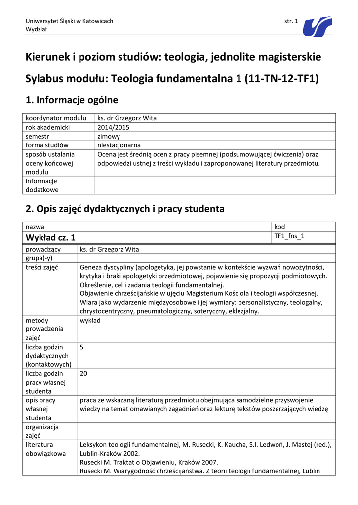 Uniwersytet Śląski w Katowicach Wydział str. 1 Kierunek i poziom studiów: teologia, jednolite magisterskie Sylabus modułu: Teologia fundamentalna 1 (11-TN-12-TF1) 1. Informacje ogólne koordynator modułu rok akademicki semestr forma studiów sposób ustalania oceny końcowej modułu informacje dodatkowe ks. dr Grzegorz Wita 2014/2015 zimowy niestacjonarna Ocena jest średnią ocen z pracy pisemnej (podsumowującej ćwiczenia) oraz odpowiedzi ustnej z treści wykładu i zaproponowanej literatury przedmiotu. 2. Opis zajęć dydaktycznych i pracy studenta nazwa kod TF1_fns_1 Wykład cz. 1 prowadzący grupa(-y) treści zajęć metody prowadzenia zajęć liczba godzin dydaktycznych (kontaktowych) liczba godzin pracy własnej studenta opis pracy własnej studenta organizacja zajęć literatura obowiązkowa ks. dr Grzegorz Wita Geneza dyscypliny (apologetyka, jej powstanie w kontekście wyzwań nowożytności, krytyka i braki apologetyki przedmiotowej, pojawienie się propozycji podmiotowych. Określenie, cel i zadania teologii fundamentalnej. Objawienie chrześcijańskie w ujęciu Magisterium Kościoła i teologii współczesnej. Wiara jako wydarzenie międzyosobowe i jej wymiary: personalistyczny, teologalny, chrystocentryczny, pneumatologiczny, soteryczny, eklezjalny. wykład 5 20 praca ze wskazaną literaturą przedmiotu obejmująca samodzielne przyswojenie wiedzy na temat omawianych zagadnień oraz lekturę tekstów poszerzających wiedzę Leksykon teologii fundamentalnej, M. Rusecki, K. Kaucha, S.I. Ledwoń, J. Mastej (red.), Lublin-Kraków 2002. Rusecki M. Traktat o Objawieniu, Kraków 2007. Rusecki M. Wiarygodność chrześcijaństwa. Z teorii teologii fundamentalnej, Lublin Uniwersytet Śląski w Katowicach Wydział literatura uzupełniająca adres strony www zajęć informacje dodatkowe 1994. Seweryniak H. Apologia Pokolenia JPII, Płock 2006. Seweryniak H. Świadectwo i sens. Teologia fundamentalna, Płock 2002. Seweryniak H. Teologia fundamentalna. Tom I, Warszawa 2010. Cuda J. Wiary godna antropologia. Hermeneutyczny zarys teologii fundamentalnej, Katowice 2002. Dzidek T., Kamykowski Ł., Kubiś A. (red.), Teologia fundamentalna. Tom I: CzłowiekFilozofia-Bóg, Kraków 1999, Tom III: Objawienie i Chrystus, Kraków 1999. Gnilka J. Jezus z Nazaretu. Orędzie i dzieje, Kraków 1997. Kulisz J. Wprowadzenie do teologii fundamentalnej, Kraków 1995. Skierkowski M. (red.) Powracanie apologii, Płock 2013. Waldenfels H. O Bogu, Jezusie Chrystusie i Kościele dzisiaj, Katowice 1993. nazwa kod TF1_fns_2 Wykład cz. 2 prowadzący grupa(-y) treści zajęć str. 2 ks. dr Grzegorz Wita Wiarygodność Wydarzenia Jezusa z Nazaretu. Niechrześcijańskie źródła historyczności Jezusa (żydowskie i pogańskie). Problem „Jezus historii” i „Chrystus wiary”, pierwotne świadectwa chrześcijańskie i ich wiarygodność: gatunek literacki Ewangelii (biograficzny i kerygmatyczny); badania krytyczno-literackie Ewangelii kanonicznych – krytyka wewnętrzna (kryteria hermeneutyczne). Pierwotne świadectwa chrześcijańskie i ich wiarygodność – krytyka zewnętrzna. Wnioski dla wiarygodności świadectw; rekonstrukcja tekstu Ewangelii – papirusy, kodeksy, apokryfy. Najważniejsze pozakościelne wizerunki Jezusa Chrystusa: nurt „biograficzny”, Jezus mityczny, Jezus socjalista, Jezus esseńczyk, Jezus w Indiach, Jezus Żydów, Jezus charyzmatyk i filozof. Ogólna problematyka „chrystologii Jezusa z Nazaretu” a chrystologia dogmatyczna; boska tożsamość Osoby Jezusa Chrystusa – relacja z Bogiem; boska tożsamość Osoby Jezusa Chrystusa – relacja z ludźmi (uczniowie, kobiety, ubodzy, chorzy, odrzuceni). Cuda Jezusa jako znaki i dzieła; propozycje interpretacji cudu; analiza słownikowa terminu „cud” - terminy biblijne wyrażające dzieła i znaki Jezusa; klasyfikacja cudów Jezusa Chrystusa; narracje i redakcje cudów w Ewangeliach; historyczność cudów; rola cudów w samookreśleniu Jezusa; funkcje cudu w teologii współczesnej (objawieniowa, chrystologiczna, soteryczna, eklezjotwórcza, wiarotwórcza); weryfikacja i odczytywanie znaku Bożego dzisiaj – doświadczenie religijne, weryfikacja krytyczna, refleksja teologiczna. Wiarygodność historyczna wydarzenia Krzyża; staurologiczna świadomość Jezusa Chrystusa; Krzyż a Wcielenie; krzyż w wydarzeniu paschalnym; krzyż jako motyw wiarygodności Objawienia (tzw. argument staurologiczny). Uniwersytet Śląski w Katowicach Wydział metody prowadzenia zajęć liczba godzin dydaktycznych (kontaktowych) liczba godzin pracy własnej studenta opis pracy własnej studenta organizacja zajęć literatura obowiązkowa literatura uzupełniająca adres strony www zajęć informacje dodatkowe nazwa Ćwiczenia prowadzący grupa(-y) treści zajęć str. 3 Hipotezy naturalistycznego wyjaśnienia faktu Zmartwychwstania Jezusa; podstawowe źródła o Zmartwychwstaniu; pojęcie zmartwychwstania; historyczność i sens teologiczny pustego grobu i chrystofanii; rozumienie formuł: „zstąpił do piekieł” i „trzeciego dnia”. Geneza i sens tytułów Chrystus, Pan, Syn Boży; zmartwychwstanie a współczesne tendencje reinkarnacjonistyczne. wykład 5 25 praca ze wskazaną literaturą przedmiotu obejmująca samodzielne przyswojenie wiedzy dotyczącej omawianych zagadnień oraz lekturę tekstów poszerzających wiedzę Leksykon teologii fundamentalnej, M. Rusecki, K. Kaucha, S.I. Ledwoń, J. Mastej (red.), Lublin-Kraków 2002. Rusecki M. Traktat o Objawieniu, Kraków 2007. Rusecki M. Wiarygodność chrześcijaństwa. Z teorii teologii fundamentalnej, Lublin 1994. Seweryniak H. Apologia Pokolenia JPII, Płock 2006. Seweryniak H. Świadectwo i sens. Teologia fundamentalna, Płock 2002. Seweryniak H. Teologia fundamentalna. Tom I, Warszawa 2010. Cuda J. Wiary godna antropologia. Hermeneutyczny zarys teologii fundamentalnej, Katowice 2002. Dzidek T., Kamykowski Ł., Kubiś A. (red.), Teologia fundamentalna. Tom I: CzłowiekFilozofia-