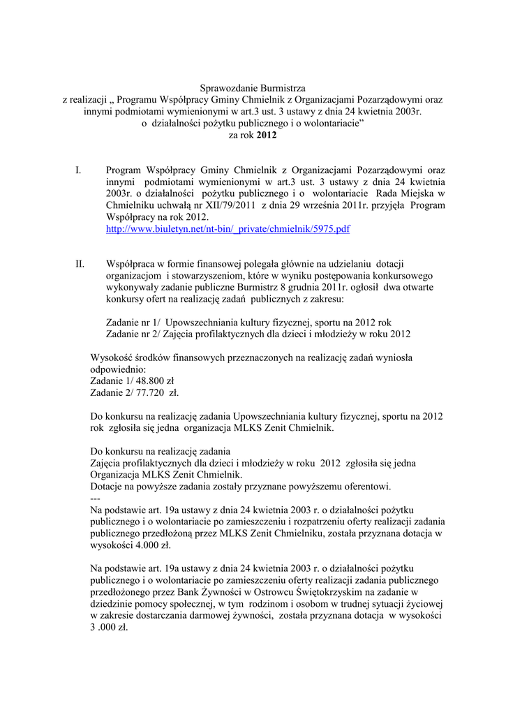 Sprawozdanie Burmistrza z realizacji „ Programu Współpracy Gminy Chmielnik z Organizacjami Pozarządowymi oraz innymi podmiotami wymienionymi w art.3 ust. 3 ustawy z dnia 24 kwietnia 2003r. o działalności pożytku publicznego i o wolontariacie” za rok 2012 I. Program Współpracy Gminy Chmielnik z Organizacjami Pozarządowymi oraz innymi podmiotami wymienionymi w art.3 ust. 3 ustawy z dnia 24 kwietnia 2003r. o działalności pożytku publicznego i o wolontariacie Rada Miejska w Chmielniku uchwałą nr XII/79/2011 z dnia 29 września 2011r. przyjęła Program Współpracy na rok 2012. http://www.biuletyn.net/nt-bin/_private/chmielnik/5975.pdf II. Współpraca w formie finansowej polegała głównie na udzielaniu dotacji organizacjom i stowarzyszeniom, które w wyniku postępowania konkursowego wykonywały zadanie publiczne Burmistrz 8 grudnia 2011r. ogłosił dwa otwarte konkursy ofert na realizację zadań publicznych z zakresu: Zadanie nr 1/ Upowszechniania kultury fizycznej, sportu na 2012 rok Zadanie nr 2/ Zajęcia profilaktycznych dla dzieci i młodzieży w roku 2012 Wysokość środków finansowych przeznaczonych na realizację zadań wyniosła odpowiednio: Zadanie 1/ 48.800 zł Zadanie 2/ 77.720 zł. Do konkursu na realizację zadania Upowszechniania kultury fizycznej, sportu na 2012 rok zgłosiła się jedna organizacja MLKS Zenit Chmielnik. Do konkursu na realizację zadania Zajęcia profilaktycznych dla dzieci i młodzieży w roku 2012 zgłosiła się jedna Organizacja MLKS Zenit Chmielnik. Dotacje na powyższe zadania zostały przyznane powyższemu oferentowi. --Na podstawie art. 19a ustawy z dnia 24 kwietnia 2003 r. o działalności pożytku publicznego i o wolontariacie po zamieszczeniu i rozpatrzeniu oferty realizacji zadania publicznego przedłożoną przez MLKS Zenit Chmielniku, została przyznana dotacja w wysokości 4.000 zł. Na podstawie art. 19a ustawy z dnia 24 kwietnia 2003 r. o działalności pożytku publicznego i o wolontariacie po zamieszczeniu oferty realizacji zadania publicznego przedłożonego przez Bank Żywności w Ostrowcu Świętokrzyskim na zadanie w dziedzinie pomocy społecznej, w tym rodzinom i osobom w trudnej sytuacji życiowej w zakresie dostarczania darmowej żywności, została przyznana dotacja w wysokości 3 .000 zł. Współpraca w formie pozafinansowej. 1. Prowadzenie Mapy Aktywności Organizacji Pozarządowych Gminy Chmielnik. za pośrednictwem strony www.chmielnik.com http://chmielnik.com/ngo/ 2. Na bieżąco informowano na stronie www.chmielnik.com o możliwości składania wniosków o dotacje do różnych grantodawców. 3. Udział i pomoc w organizacji wydarzeń organizowanych przez stowarzyszenia i grupy nieformalne. 4. Współpraca ze Stowarzyszeniem Nadzieja Rodzinie w Kielcach przy prowadzeniu klubów Wolna Strefa na terenie Gminy Chmielnik Chmielnik, luty 2013 r. Burmistrz Jarosław Zatorski