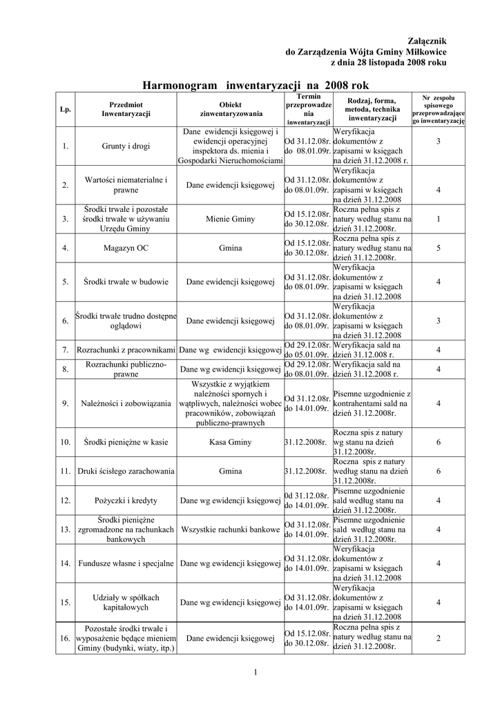 Załącznik do Zarządzenia Wójta Gminy Miłkowice z dnia 28 listopada 2008 roku Harmonogram inwentaryzacji na 2008 rok Lp. 1. 2. 3. 4. 5. 6. 7. 8. 9. 10. 11. 12. 13. 14. 15. 16. Przedmiot Inwentaryzacji Obiekt zinwentaryzowania Termin przeprowadze nia inwentaryzacji Rodzaj, forma, metoda, technika inwentaryzacji Dane ewidencji księgowej i Weryfikacja ewidencji operacyjnej Od 31.12.08r. dokumentów z Grunty i drogi inspektora ds. mienia i do 08.01.09r. zapisami w księgach Gospodarki Nieruchomościami na dzień 31.12.2008 r. Weryfikacja Wartości niematerialne i Od 31.12.08r. dokumentów z Dane ewidencji księgowej prawne do 08.01.09r. zapisami w księgach na dzień 31.12.2008 Środki trwałe i pozostałe Roczna pełna spis z Od 15.12.08r. środki trwałe w używaniu Mienie Gminy natury według stanu na do 30.12.08r. Urzędu Gminy dzień 31.12.2008r. Roczna pełna spis z Od 15.12.08r. Magazyn OC Gmina natury według stanu na do 30.12.08r. dzień 31.12.2008r. Weryfikacja Od 31.12.08r. dokumentów z Środki trwałe w budowie Dane ewidencji księgowej do 08.01.09r. zapisami w księgach na dzień 31.12.2008 Weryfikacja Środki trwałe trudno dostępne Od 31.12.08r. dokumentów z Dane ewidencji księgowej oglądowi do 08.01.09r. zapisami w księgach na dzień 31.12.2008 Od 29.12.08r. Weryfikacja sald na Rozrachunki z pracownikami Dane wg ewidencji księgowej do 05.01.09r. dzień 31.12.008 r. Rozrachunki publicznoOd 29.12.08r. Weryfikacja sald na Dane wg ewidencji księgowej prawne do 08.01.09r. dzień 31.12.2008 r. Wszystkie z wyjątkiem należności spornych i Pisemne uzgodnienie z Od 31.12.08r. Należności i zobowiązania wątpliwych, należności wobec kontrahentami sald na do 14.01.09r. pracowników, zobowiązań dzień 31.12.2008r. publiczno-prawnych Roczna spis z natury Środki pieniężne w kasie Kasa Gminy 31.12.2008r. wg stanu na dzień 31.12.2008r. Roczna spis z natury Druki ścisłego zarachowania Gmina 31.12.2008r. według stanu na dzień 31.12.2008r. Pisemne uzgodnienie 0d 31.12.08r. Pożyczki i kredyty Dane wg ewidencji księgowej sald według stanu na do 14.01.09r. dzień 31.12.2008r. Środki pieniężne Pisemne uzgodnienie Od 31.12.08r. zgromadzone na rachunkach Wszystkie rachunki bankowe sald według stanu na do 14.01.09r. bankowych dzień 31.12.2008r. Weryfikacja Od 31.12.08r. dokumentów z Fundusze własne i specjalne Dane wg ewidencji księgowej do 14.01.09r. zapisami w księgach na dzień 31.12.2008 Weryfikacja Udziały w spółkach Od 31.12.08r. dokumentów z Dane wg ewidencji księgowej kapitałowych do 14.01.09r. zapisami w księgach na dzień 31.12.2008 Roczna pełna spis z Pozostałe środki trwałe i Od 15.12.08r. natury według stanu na wyposażenie będące mieniem Dane ewidencji księgowej do 30.12.08r. dzień 31.12.2008r. Gminy (budynki, wiaty, itp.) 1 Nr zespołu spisowego przeprowadzające go inwentaryzację 3 4 1 5 4 3 4 4 4 6 6 4 4 4 4 2