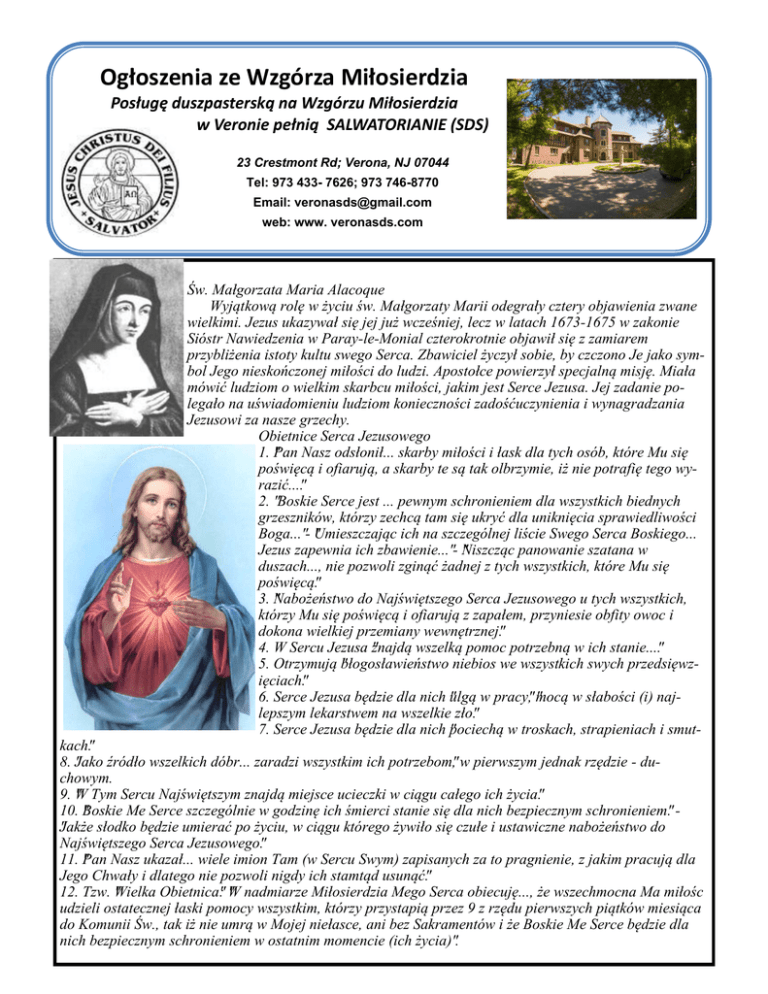 Ogłosze ia ze Wzgórza Miłosierdzia Posługę duszpasterską na Wzgórzu Miłosierdzia w Veronie pełnią SALWATORIANIE SDS 23 Crestmont Rd; Verona, NJ 07044 Tel: 973 433- 7626; 973 746-8770 Email: [email protected] web: www. veronasds.com Św. Małgorzata Maria Alacoque Wyjątkową rolę w życiu w. Małgorzaty Marii odegrały cztery objawienia zwane wielkimi. Jezus ukazywał się jej już wcze niej, lecz w latach 1673-1675 w zakonie Sióstr Nawiedzenia w Paray-le-Monial czterokrotnie objawił się z zamiarem przybliżenia istoty kultu swego Serca. Zbawiciel życzył sobie, by czczono Je jako symbol Jego nieskończonej miło ci do ludzi. Apostołce powierzył specjalną misję. Miała mówić ludziom o wielkim skarbcu miło ci, jakim jest Serce Jezusa. Jej zadanie polegało na u wiadomieniu ludziom konieczno ci zado ćuczynienia i wynagradzania Jezusowi za nasze grzechy. Obietnice Serca Jezusowego 1. "Pan Nasz odsłonił... skarby miło ci i łask dla tych osób, które Mu się po więcą i ofiarują, a skarby te są tak olbrzymie, iż nie potrafię tego wyrazić...". 2. "Boskie Serce jest ... pewnym schronieniem dla wszystkich biednych grzeszników, którzy zechcą tam się ukryć dla uniknięcia sprawiedliwo ci Boga..."- "Umieszczając ich na szczególnej li cie Swego Serca Boskiego... Jezus zapewnia ich zbawienie..."- "Niszcząc panowanie szatana w duszach..., nie pozwoli zginąć żadnej z tych wszystkich, które Mu się po więcą". 3. "Nabożeństwo do Naj więtszego Serca Jezusowego u tych wszystkich, którzy Mu się po więcą i ofiarują z zapałem, przyniesie obfity owoc i dokona wielkiej przemiany wewnętrznej". 4. W Sercu Jezusa "znajdą wszelką pomoc potrzebną w ich stanie...". 5. Otrzymują "błogosławieństwo niebios we wszystkich swych przedsięwzięciach". 6. Serce Jezusa będzie dla nich u" lgą w pracy", "mocą w słabo ci (i) najlepszym lekarstwem na wszelkie zło". 7. Serce Jezusa będzie dla nich p" ociechą w troskach, strapieniach i smut- kach". 8. "Jako źródło wszelkich dóbr... zaradzi wszystkim ich potrzebom", w pierwszym jednak rzędzie - duchowym. 9. "W Tym Sercu Naj więtszym znajdą miejsce ucieczki w ciągu całego ich życia". 10. "Boskie Me Serce szczególnie w godzinę ich mierci stanie się dla nich bezpiecznym schronieniem". "Jakże słodko będzie umierać po życiu, w ciągu którego żywiło się czułe i ustawiczne nabożeństwo do Naj więtszego Serca Jezusowego". 11. "Pan Nasz ukazał... wiele imion Tam (w Sercu Swym) zapisanych za to pragnienie, z jakim pracują dla Jego Chwały i dlatego nie pozwoli nigdy ich stamtąd usunąć". 12. Tzw. "Wielka Obietnica"Ś "W nadmiarze Miłosierdzia Mego Serca obiecuję..., że wszechmocna Ma miło c udzieli ostatecznej łaski pomocy wszystkim, którzy przystapią przez 9 z rzędu pierwszych piątków miesiąca do Komunii w., tak iż nie umrą w Mojej niełasce, ani bez Sakramentów i że Boskie Me Serce będzie dla nich bezpiecznym schronieniem w ostatnim momencie (ich życia)". Nabożeństwa czerwcoweŚ W każdą rodę i piątek od godziny 6Ś00pm Adoracja Naj więtszego Sakramentu. O godzinie 6Ś30pm nabożeństwo i Msza w. o godzinie 7Ś00pm. W niedzielę nabożeństwo czerwcowe o godzinie 10Ś30 AM. Po nabożeństwie Msza w. o godzinie 11Ś00am. Od 10-go do 19-go czerwca Nowenna do więtego Józefa w intencji Ojców. ——————————————————————————————————————— Msza w. w weekendŚ Sobota o godzinie 5Ś00pm /Niedziela o godzinie 8Ś00am i 11Ś00am. Każdy Pierwszy Piątek Miesiąca CzuwanieŚ 6Ś00pm – Adoracja Naj więtszego Sakramentu 6Ś30pm – Nabożeństwo do Bożego Miłosierdzia 7Ś00pm – Msza w.,Modlitwa Różańcowa, Błogosławieństwo Eucharystyczne Pikniki na rok 2016Ś Serdecznie Zapraszamy! 4th of July Piknik –8PM —————————————————————————————————— SALWATORIANIE Celem Towarzystwa jest wzmacniać, bronić i rozkrzewiać katolicką wiarę wszędzie tam, gdzie zostanie posłane przez Bożą Opatrzno ć. Dlatego poprzez wypełnianie apostolskiego nauczania słowem pisanym i mówionym, zamierza osiągnąć cel, tzn. aby wszyscy ludzie nieustannie poznawali jedynego prawdziwego Boga i tego którego posłał Jezusa Chrystusa, aby mogli wie ć życie więte i zbawić swoje dusze. Reguła z roku 1882 Towarzystwo Boskiego Zbawiciela, popularnie znane jako Salwatorianie, jest międzynarodowym zgromadzeniem zakonnym księży i braci w Ko ciele Katolickim, założonym w Rzymie 8. grudnia 1881 r. przez Ojca Franciszka od Krzyża Jordana. Członkowie Zgromadzenia prowadzą działalno ć apostolską w 40 krajach. Jeste my czę cią Rodziny Salwatoriańskiej, do której należą również siostry zakonne (Kongregacja Sióstr Boskiego Zbawiciela) i wieccy (Międzynarodowa Wspólnota Boskiego Zbawiciela). Przyjęcia. Oferta wynajmu Sali. Prag ie y zaoferować wy aję ie aszej Sali a uro zystoś i rodzi e zy iz esowy h, jak p. hrz i y, Pierwsze Ko u ie Święte, wesela, . Wszystki h zai teresowa y h wy aję ie aszej Sali prosi y o ko takt z aszy do e .