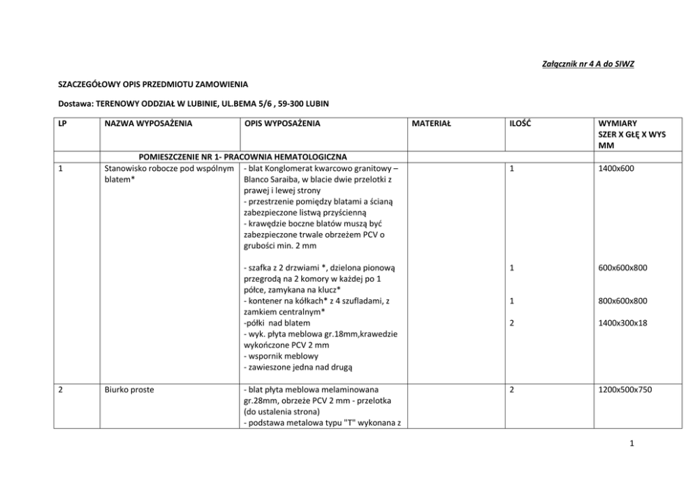 Załącznik nr 4 A do SIWZ SZACZEGÓŁOWY OPIS PRZEDMIOTU ZAMOWIENIA Dostawa: TERENOWY ODDZIAŁ W LUBINIE, UL.BEMA 5/6 , 59-300 LUBIN LP 1 2 NAZWA WYPOSAŻENIA OPIS WYPOSAŻENIA ILOŚĆ WYMIARY SZER X GŁĘ X WYS MM 1 1400x600 - szafka z 2 drzwiami *, dzielona pionową przegrodą na 2 komory w każdej po 1 półce, zamykana na klucz* - kontener na kółkach* z 4 szufladami, z zamkiem centralnym* -półki nad blatem - wyk. płyta meblowa gr.18mm,krawedzie wykończone PCV 2 mm - wspornik meblowy - zawieszone jedna nad drugą 1 600x600x800 1 800x600x800 2 1400x300x18 - blat płyta meblowa melaminowana gr.28mm, obrzeże PCV 2 mm - przelotka (do ustalenia strona) - podstawa metalowa typu "T" wykonana z 2 1200x500x750 POMIESZCZENIE NR 1- PRACOWNIA HEMATOLOGICZNA Stanowisko robocze pod wspólnym - blat Konglomerat kwarcowo granitowy – blatem* Blanco Saraiba, w blacie dwie przelotki z prawej i lewej strony - przestrzenie pomiędzy blatami a ścianą zabezpieczone listwą przyścienną - krawędzie boczne blatów muszą być zabezpieczone trwale obrzeżem PCV o grubości min. 2 mm Biurko proste MATERIAŁ 1 profila zamkniętego z wypełnieniem z blachy perforowanej - malowana proszkowo, - frontowa łączyna nóg - płyta meblowa gr18mm - zawiesie na komputer wyk. z metalowych płaskowników malowanych proszkowo, kolor Ral 9006 - półka wysuwana na klawiaturę, wyk. z płyty meblowej gr.18mm 3 Kontener zamykany na klucz* 4 Krzesło obrotowe PU 5 Kozetka lekarska 6 Szafa biurowa* - kontener na kółkach z 3 szufladami wyk. z płyty meblowej melaminowanej gr.18mm, zamek centralny - podstawa pięcioramienna ,na kółkach do powierzchni twardych - siedzisko i oparcie pod plecy PU - regulacja wysokości za pomocą podnośnika pneumatycznego -podłokietniki -kolor czarny - konstrukcja metalowa malowana proszkowo - materac tapicerowany, tkanina zmywalna typu skay, - zagłówek regulowany - z uchwytem na prześcieradło jednorazowe -kółka, z możliwością blokady - 2 pary drzwi pełnych, -szafa dzielona na pół w poziomie -półki 6 szt z możliwością regulacji , - każda część zamykana na zamek 2 PU 400 xx500x600 2 1 1850x500x500 1 1000x500x1950 2 1 2 3 POMIESZCZENIE NR 2-GABINET LEKARSKI Kontener na kółkach - kontener na kółkach z 3 szufladami wyk. z płyty meblowej melaminowanej obustronnie gr.18mm, zamek centralny Szafka na nóżkach -szafka z 3 drzwiami, 3 półki, -zamykana na klucz -korpusy mebli oraz fronty wykonane z płyty wiórowej o grubości 18mm melaminowanej obustronnie - na stelażu metalowym wyk. z profila zamkniętego 40x24mm ze stopkami do regulacji Szafa dwudrzwiowa - szafka z 2 drzwiami, dzielona pionową przegrodą na 2 komory, -każda część zamykana na klucz -Jedna część przeszklona z półkami do regulacji - druga część ubraniowa z drążkiem i 1 półką -korpusy mebli oraz fronty wykonane z płyty wiórowej o grubości 18mm melaminowanej obustronnie - na stelażu metalowym wyk. z profila zamkniętego 40x24mm ze stopkami do regulacji -wszystkie nieosłonięte krawędzie mebla zabezpieczone okleiną PCV 4 Zawiesie na komputer 5 wieszak zawiesie na komputer wyk. z metalowych płaskowników malowanych proszkowo, kolor Ral 9006 Stojący metalowy, całkowita wysokość około 1860mm, średnica podstawy fi 1 400x500x600 1 1200x500x800 1 800 x 600x 1700 1 1 3 6 Krzesło z PCV 1 Szafa * 2 Stanowisko robocze pod wagomieszarki* Wzór na zdjęciu nr 1 3 Stanowisko robocze pod wspólnym blatem* 4 600mm, kolor alu, -Elementy siedziska i oparcia wykonane z wysokowytrzymałościowego polipropylenu -rama stalowa - malowana proszkowo na kolor ALU - antypoślizgowa powierzchnia siedziska POMIESZCZENIE NR 3 – POBÓR KRWI - 2 pary drzwi pełnych, dzielona na dwie części -półki 6 szt regulowane - każda część zamykana na zamek Szafki wiszące* 2 1 1000x500x1950 2 półki 3 szuflady Na stelażu Kółka z możliwością blokady - blat Konglomerat kwarcowo granitowy Blanco Saraiba - w blacie dwie przelotki z prawej i lewej strony - przestrzenie pomiędzy blatami a ścianą zabezpieczone listwą przyścienną - krawędzie boczne blatów muszą być zabezpieczone trwale obrzeżem PCV o grubości min. 2 mm - 2 szafki * z 2 drzwiami, z 3 półkami, zamykane na klucz - 1 kontener *na kółkach z 4 szufladami, z zamkiem centralnym 2 800x500x1260 1 1400x700 2 400x600x800 1 600x600x800 - szafka z 1 drzwiami* uchylnymi, 2 półkami, zamykana na klucz - szafka z 2 drzwiami*, 2 półkami, 2 400x600x800 1 600x600x800 4 5 6 1 Stanowisko robocze pod komputer* Krzesło obrotowe PU zamykana na klucz - blat Konglomerat kwarcowo granitowy Bianco Saraiba - w blacie dwie przelotki z prawej i lewej strony - przestrzenie pomiędzy blatami a ścianą zabezpieczone listwą przyścienną - krawędzie boczne blatów muszą być zabezpieczone trwale obrzeżem PCV o grubości min. 2 mm - zawiesie na komputer wyk. z metalowych płaskowników malowanych proszkowo, kolor Ral 9006 - półka wysuwana na klawiaturę, wyk. z płyty meblowej gr.18mm - szafka z 2 drzwiami*, dzielona pionową przegrodą na 2 komory w każdej po 1 półce, zamykana na klucz - kontener na kółkach *z 4 szufladami, z zamkiem - podstawa pięcioramienna ,na kółkach do powierzchni twardych - siedzisko i oparcie pod plecy PU - regulacja wysokości za pomocą podnośnika pneumatycznego -podłokietniki -kolor czarny POMIESZCZENIE NR 7- POKOJ SOCJALNY Zestaw szafek kuchennych - blat kuchenny wykonany z płyty wiórowej stojących typu postforming o grubości min. 28 mm + listwa przyścienna - szafka z 2 drzwiami uchylnymi , po 2 półki 1 1250x700x1300 Obudowa słupa 2 400x500x800 1 400x500x800 3 1 1400x500 1 800x500x700 5 2 Szafki kuchenne wiszące 3 Szafka pod zlewozmywak 1 KORYTARZ Szafa z drzwiami -na odpowiednim stelażu metalowym ze stopkami do regulacji -zamykana na klucz -korpusy mebli oraz fronty wykonane z płyty wiórowej o grubości 18mm melaminowanej obustronnie -korpusy mebli oraz fronty wykonane z płyty wiórowej o g