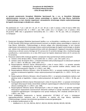 Zarządzenie Nr 564/2406/14 Prezydenta Miasta Koszalina z dnia 29 maja 2014 roku w sprawie powierzenia Zarządowi Obiektów Sportowych Sp. z o.o. w Koszalinie bieżącego administrowania terenem w obrębie zalewu powstałego w rejonie ulic 4-go Marca, Sybiraków i Paderewskiego, w tym również organizacji i prowadzenia strzeżonego miejsca wykorzystywanego do kąpieli utworzonego w obrębie ww. zalewu. Na podstawie art. 7 ust. 1 pkt 10 i 15, art. 9 i art. 30 ust. 2 pkt 3 ustawy z dnia 8 marca 1990 roku o samorządzie gminnym (Dz. U. z 2013 r., poz. 594 z późn. zm.) i w związku z art. 2 ustawy z dnia 20 grudnia 1996 roku o gospodarce komunalnej (Dz. U. z 2011 r. Nr 45, poz. 236 j.t.) zarządzam, co następuje: §1 1. Powierzam Zarządowi Obiektów Sportowych Spółka z o.o. w Koszalinie z siedzibą przy ul. Jedności 4, 75-401 Koszalin (ZOS) bieżące administrowanie terenem w obrębie zalewu powstałego w rejonie ulic 4-go Marca, Sybiraków i Paderewskiego w okresie całego roku kalendarzowego, w tym również organizację i prowadzenie strzeżonego miejsca wykorzystywanego do kąpieli utworzonego w obrębie ww. zalewu oraz zapewnienie bezpieczeństwa osób tam pływających i kąpiących się poprzez obsługę ratowniczą w okresie sezonu letniego od 15 czerwca do 15 września danego roku z możliwością jego przedłużenia, z zastrzeżeniem, że w roku 2014 sezon ten będzie obejmował okres od 21 czerwca do 15 września. 2. Powyższe zadania ZOS zrealizuje zgodnie z przepisami niżej wymienionych aktów prawnych: 1) Ustawa z dnia 18 lipca 2001 r. Prawo wodne (Dz. U. z 2012 r., poz. 145 z późn. zm.), 2) Ustawa z dnia 18 sierpnia 2011 r. o bezpieczeństwie osób przebywających na obszarach wodnych (Dz. U. z 2011 r. Nr 208, poz. 1240 z późn. zm.), 3) Rozporządzenie Ministra Spraw Wewnętrznych z dnia 6 marca 2012 r. w sprawie sposobu oznakowania i zabezpieczania obszarów wodnych oraz wzorów znaków zakazu, nakazu oraz znaków informacyjnych i flag (Dz. U. z 2012 r. poz. 286), 4) Rozporządzenie Ministra Zdrowia z dnia 28 kwietnia 2011 r. w sprawie ewidencji kąpielisk oraz sposobu oznakowania kąpielisk i miejsc wykorzystywanych do kąpieli (Dz. U. z 2011 r. Nr 91, poz. 527), 5) Rozporządzenie Ministra Zdrowia z dnia 8 kwietnia 2011 r. w sprawie prowadzenia nadzoru nad jakością wody w kąpielisku i miejscu wykorzystywanym do kąpieli (Dz. U. z 2011 r. Nr 86, poz. 478), 6) Rozporządzenie Ministra Spraw Wewnętrznych z dnia 23 stycznia 2012 r. w sprawie minimalnych wymagań dotyczących liczby ratowników wodnych zapewniających stałą kontrolę wyznaczonego obszaru wodnego (Dz. U. z 2012 r. poz. 108), 7) Rozporządzenie Ministra Spraw Wewnętrznych z dnia 27 lutego 2012 r. w sprawie wymagań dotyczących wyposażenia wyznaczonych obszarów wodnych w sprzęt ratunkowy i pomocniczy, urządzenia sygnalizacyjne i ostrzegawcze oraz sprzęt medyczny, leki i artykuły sanitarne (Dz. U. z 2012 r. poz. 261). 3. Teren podlegający powierzeniu o łącznej powierzchni 127.366,3 m2 wraz z istniejącym zagospodarowaniem położony jest w Koszalinie w rejonie ulic 4-go Marca, Sybiraków i Paderewskiego i stanowi nieruchomości gruntowe oznaczone geodezyjnie: 1) w obrębie ewidencyjnym nr 26: - działkami nr 1, 31, 114, 39/116, 39/117, 39/119, 39/120, 39/128, 39/129, 39/130, 2) w obrębie ewidencyjnym nr 28: - działkami nr 399/1, 399/2, 398/1, 3) w obrębie ewidencyjnym nr 46: - działką nr 119. 4. Teren podlegający powierzeniu zaznaczony został na załączniku graficznym - załącznik nr 1 do niniejszego zarządzenia. 5. Szczegółowy wykaz elementów zagospodarowania znajdujących się na powierzonym terenie zostanie przekazany ZOS-owi w terminie 14 dni od daty przekazania inwestycji do użytku. 6. Razem z wykazem, o którym mowa w ust. 5 przekazane zostaną instrukcje użytkowania poszczególnych elementów zagospodarowania, których producenci zalecają ich stosowanie. §2 1. ZOS w ramach powierzonych zadań określonych w § 1 ust. 1 i oprócz spełnienia obowiązków, wynikających z przepisów prawa wymienionych w § 1 ust. 2 wykonywał będzie również inne czynności i obowiązki, polegające m.in. na: 1) bieżącym administrowaniu powierzonym terenem, tj. m.in.: a) utrzymaniu czystości i porządku, b) utrzymaniu zieleni, c) utrzymaniu infrastruktury oraz zaplecza socjalnego w należytym stanie technicznym, w tym obsługa toalet, d) nadzór nad terenem, w tym również nad działalnością podmiotów, którym Miasto Koszalin wydzierżawiło części powierzonego terenu, 2) utrzymaniu powierzonego terenu w stanie niepogorszonym zgodnie z jego przeznaczeniem, 3) dbaniu o prawidłowe zabezpieczenie majątku Miasta, 4) utrzymaniu powierzonego terenu i wszystkich elementów jego zagospodarowania w należytym stanie technicznym wraz z bieżącą konserwacją, 5) dokonywaniu przeglądów technicznych i konserwacji wyciągu wodnego do wakeboardingu, 6) ponoszeniu odpowiedzialności materialnej za utratę, zniszczenie lub uszkodzenie powierzonego przez Miasto majątku, 7) zawarciu umów i ponoszeniu kosztów dostawy mediów: wody, energii elektrycznej, usług telefonicznych oraz zawarcie umów i opłacanie wywozu nieczystości stałych i odprowadzania ścieków, 8) dozór i ochrona powierzonego terenu wraz z elementami jego zagospodarowania, 9) prowadzenie wszelkich spraw, w imieniu Miasta, związanych z korzystaniem z powierzonego terenu i elementów jego zagospodarowania. §3 1. Za wykonanie powierzonych zadań, o których mowa w § 1 i 2, w roku 2014 ZOS otrzyma kwotę w wysokości 105.000- zł brutto (słownie złotych: sto pięć tysięcy 00/100), która płatna będzie w ratach zgodnie z poniższym harmonogramem: - za lipiec 2014 r. w wysokości 23.841,85,- zł brutto, - za sierpień 2014 r. w wysokości 23.841,85,- zł brutto, - za wrzesień 2014 r. w wysokości 23.841,85,- zł brutto, - za październik 2014 r. w wysokości 11.158,15,- zł brutto, - za listopad 2014 r. w wy